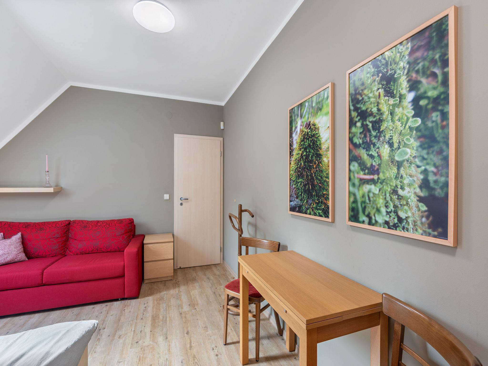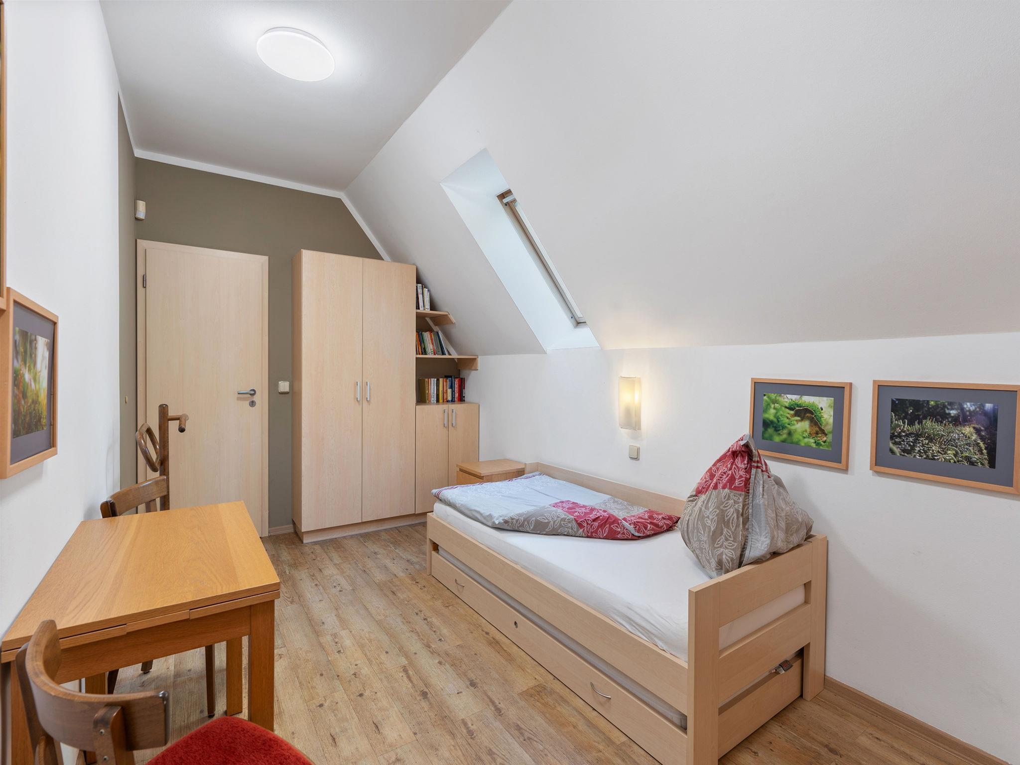 4-room apartment on 1st floor. Spacious and bright, partly with sloping ceilings, comfortable and cosy furnishings: sep. WC. Upper floor: open living room with 1 double sofabed and satellite TV (flat screen), electric heating. 1 room with 2 beds, 2 pull-out beds and electric heating. 1 room with 1 double sofabed, 1 double bed and electric heating. Large, open kitchen (dishwasher, 2 ceramic glass hob hotplates, kettle, microwave) with dining table. Bath/shower/WC. Electric heating, floor heating. Facilities: baby cot. Internet (WiFi, free). Please note: suitable for families. Non-smoking house. Maximum 2 pets/ dogs allowed. Smoke alarm, fire extinguisher.