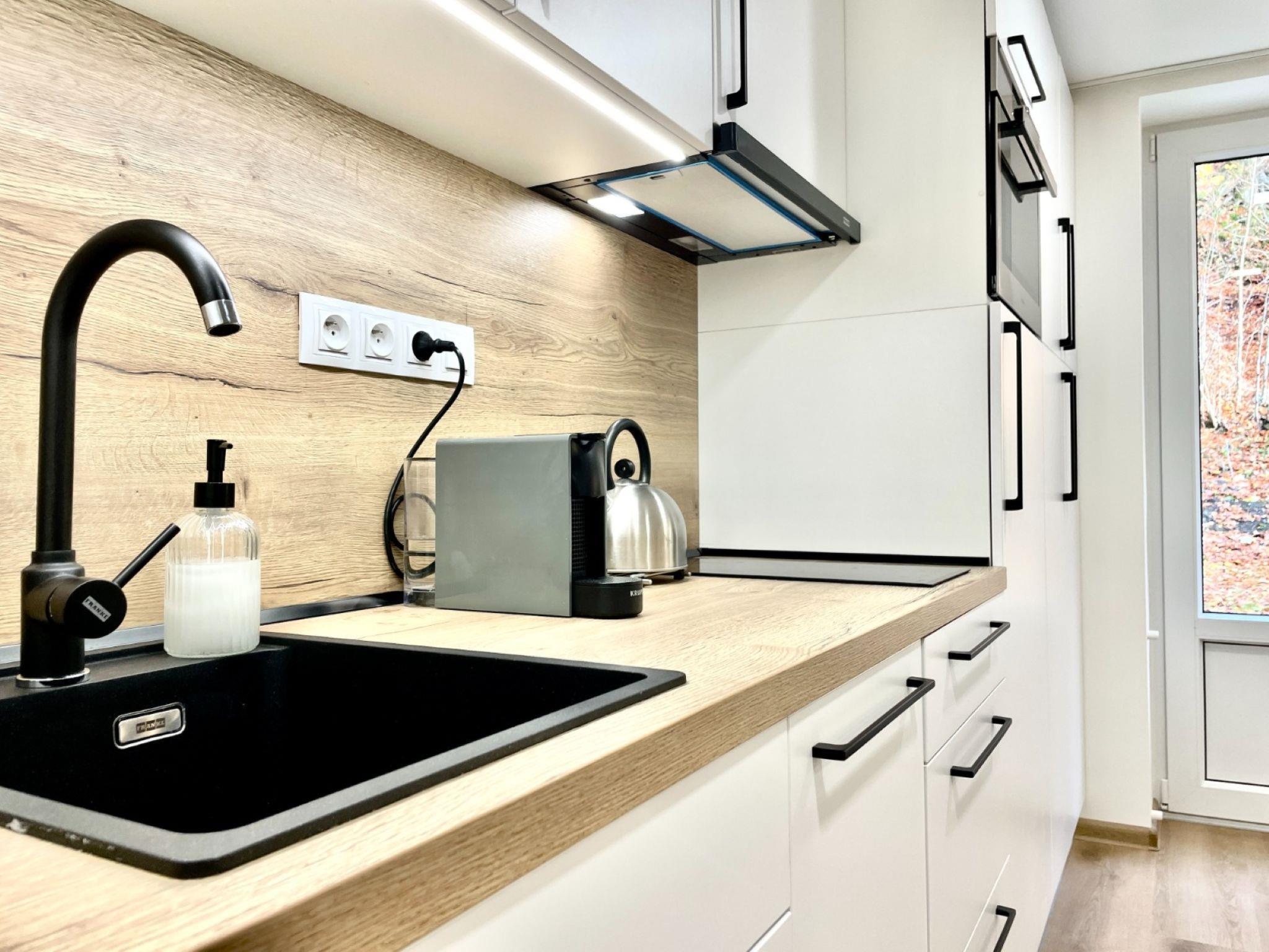 1-room apartment 32 m2, on the ground floor. Modern and cosy furnishings: entrance hall. Living/sleeping room with 1 double sofabed, 1 double bed, dining table and TV. Kitchenette (dishwasher, 2 ceramic glass hob hotplates, kettle, microwave, electric coffee machine) with dining table. Exit to the terrace. Shower/WC. Electric heating, floor heating. Terrace. Terrace furniture. View of the forest. Facilities: Internet (WiFi, free). Please note: suitable for families. Non-smokers only.