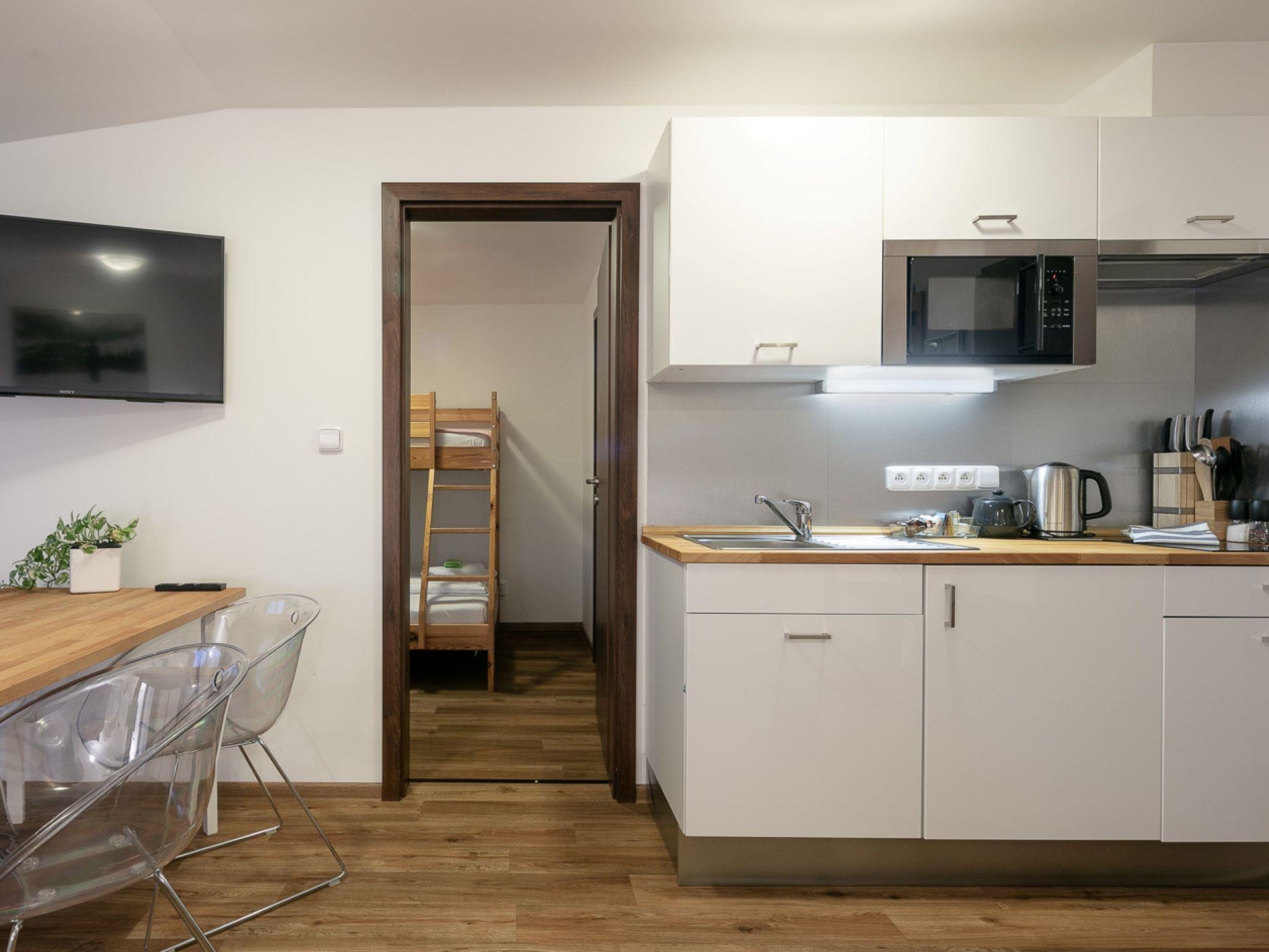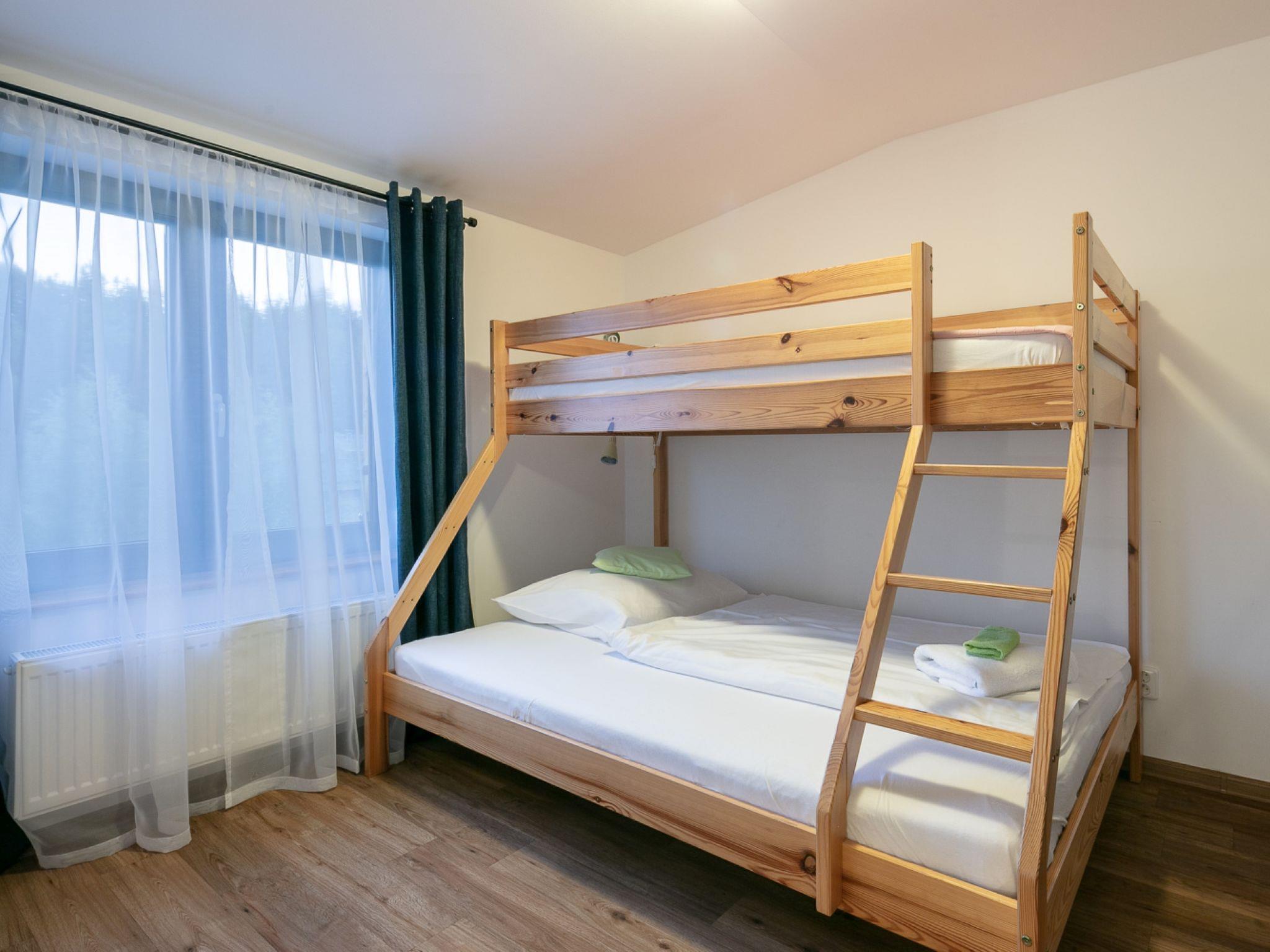 "U Kabinky 5+0", 2-room apartment on 3rd floor. Living room with 1 double bed and TV. 1 room with 1 sofabed and 1 double bed. Kitchenette (2 hot plates, kettle, microwave) with dining table. Shower/WC. Beautiful view of the countryside. Facilities: Internet (WiFi, free). Please note: suitable for families. Non-smokers only.