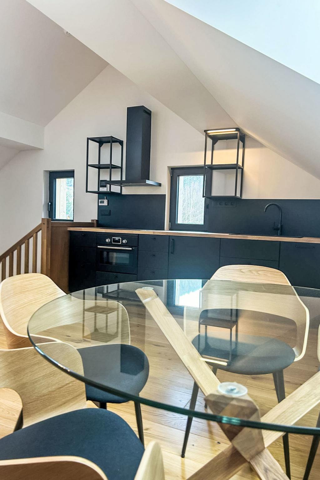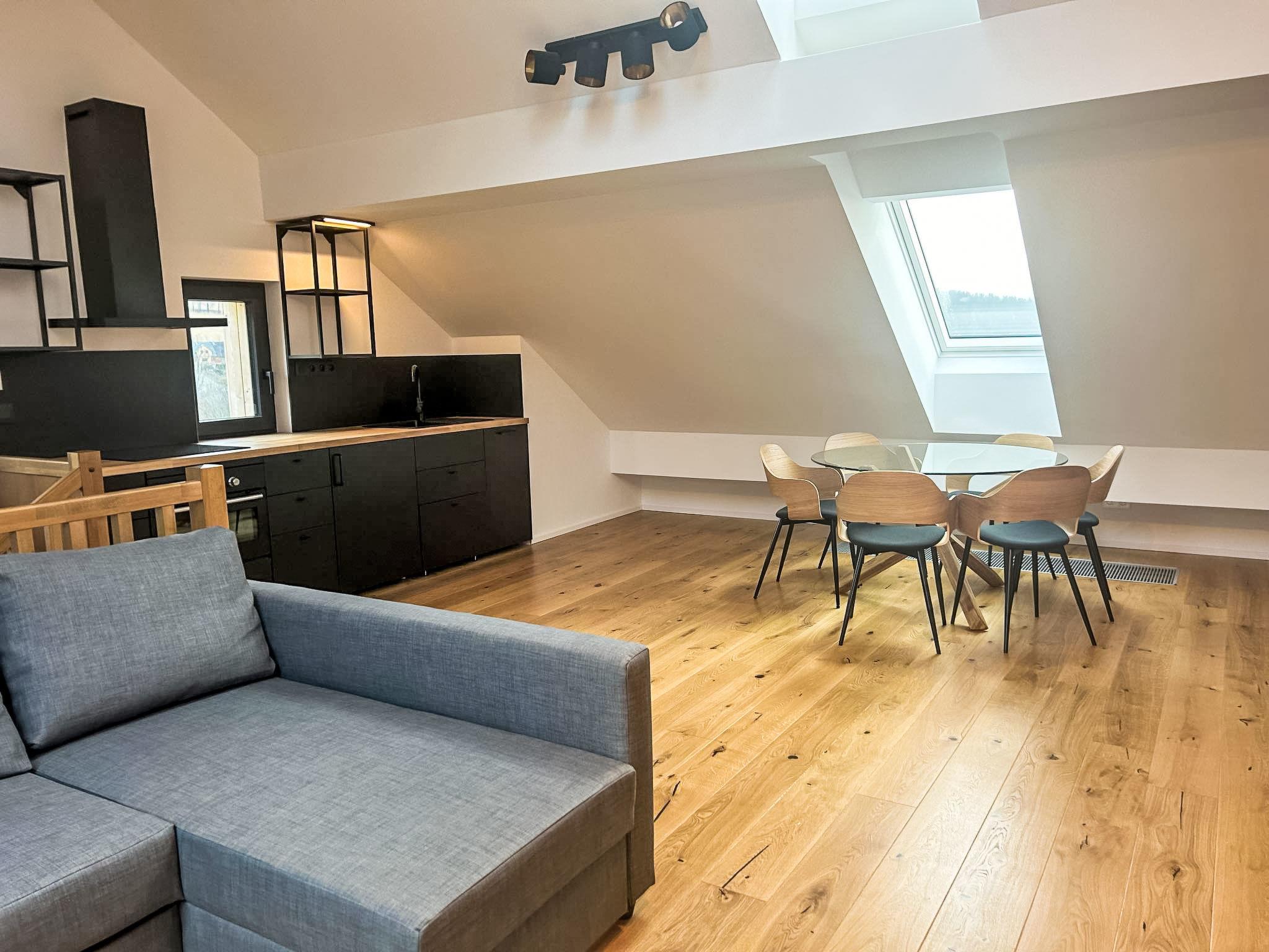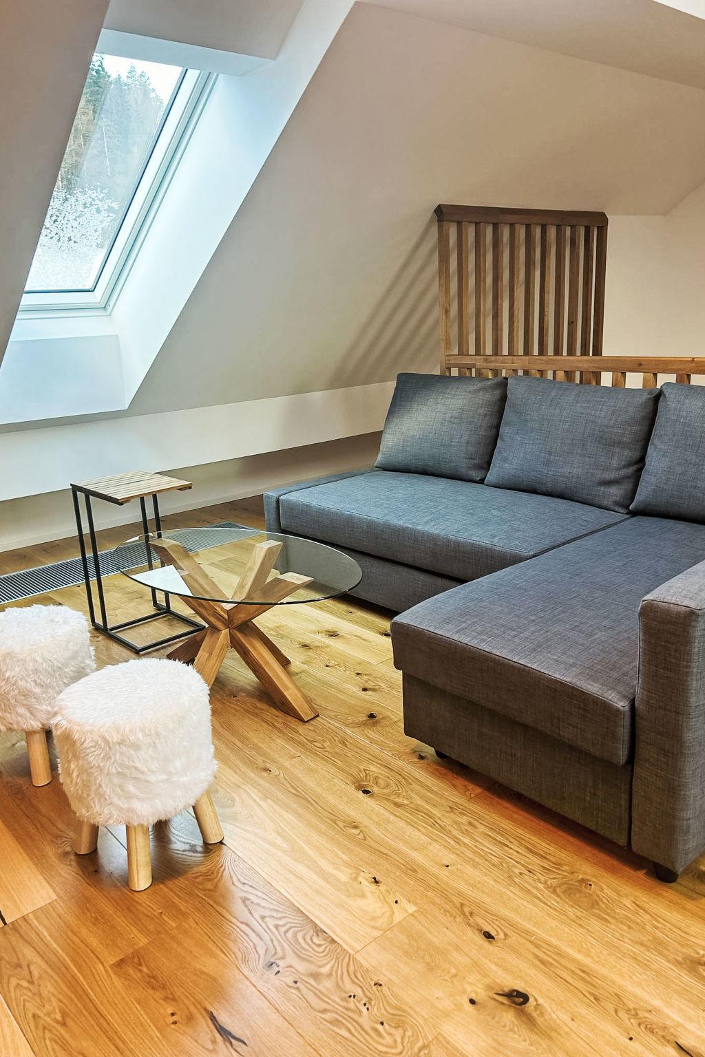 "Ski&Bike Siréna 4+2", 1-room apartment on 2 levels. Object suitable for 4 adults + 2 children. Entrance hall. Exit to the balcony. Upper floor: living/sleeping room with sloping ceilings with 4 beds, 1 double sofabed and TV. Kitchenette (oven, 4 ceramic glass hob hotplates, microwave, freezer, electric coffee machine) with dining table. Shower/WC. Balcony. Balcony furniture. Facilities: Internet (WiFi, free). Parking (roofed). Please note: suitable for families. Non-smokers only.