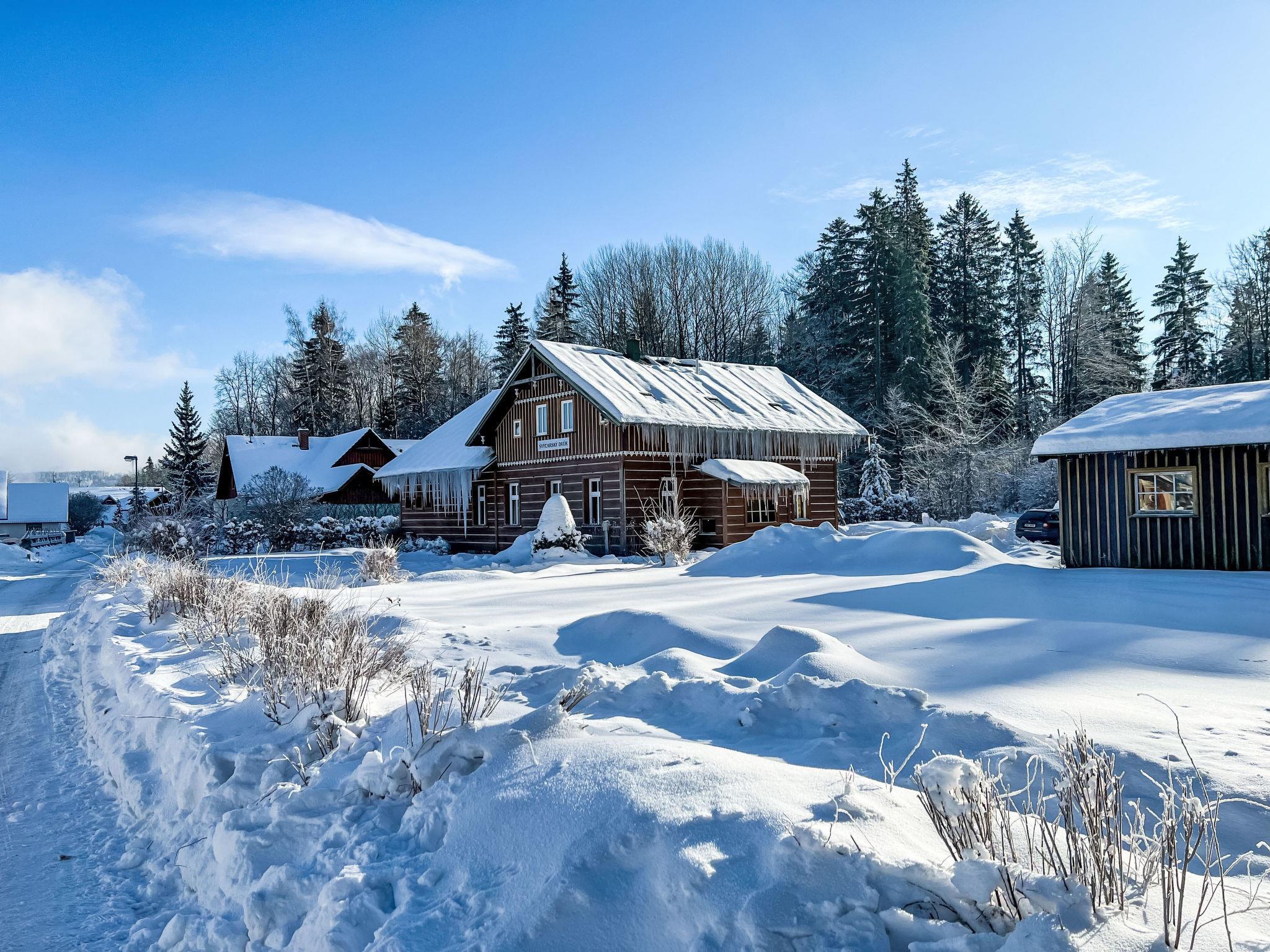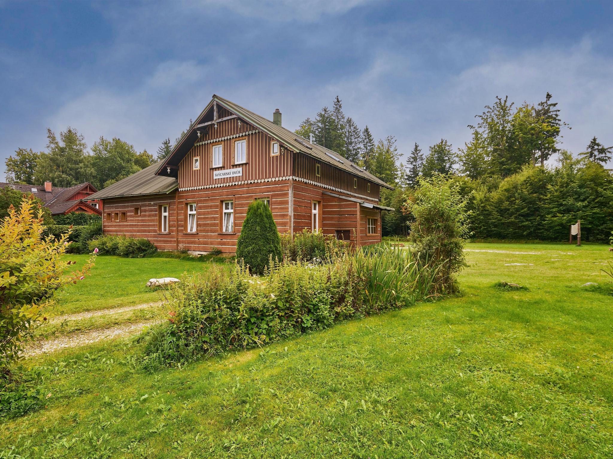Comfortable cottage "Švýcarský dvur Lodge", 2 storeys, detached from the 19th century. In the resort 800 m from the centre of Janské Lázne, in a quiet position, 200 m from the skiing area. Private: large garden 3'000 m2 with lawn. Patio, garden furniture, barbecue, children's playground (slide, swing). In the complex: trampoline, central heating system. Parking at the house. Grocery 1.2 km, supermarket 2 km, restaurant 1 km, café 1 km, bus stop "Janské Lázne, Lesní dum" 700 m, railway station "Svoboda nad Úpou" 2.8 km, outdoor swimming pool 1 km, indoor swimming pool 1 km, thermal baths "Janské Lázne" 1 km. Golf course (18 hole) 8 km, tennis 800 m, minigolf 2.5 km, riding stable 2 km, walking paths from the house 20 m, cycle lane 700 m, ski lift 900 m, gondola lift 1.7 km, slopes 200 m, ski rental 600 m, ski bus stop 50 m, ski school, sled run 800 m, cross country ski track 2.5 km, children's playground 200 m. Nearby attractions: Aquacentrum, Janské Lázne Spa 1 km, Stezka korunami stromu Janské Lázne 3 km, RelaxPark Pec, lanovka Snežka 15 km, zámek Vrchlabí, Aquacentrum Vrchlabí 18 km, Špindleruv Mlýn, Zoo Safari Dvur Králové 33 km, Adršpašské skály 42 km. Well-known ski regions can easily be reached: Janské Lázne - Koštálka 1.5 km, Cerná hora - Pec 1900 m, Mladé Buky 7 km, Horní Malá Úpa 20 km, Špindleruv Mlýn 34 km. Well-known lakes can easily be reached: Dolce Trutnov 18 km. Hiking paths: krkonošské naucné stezky.