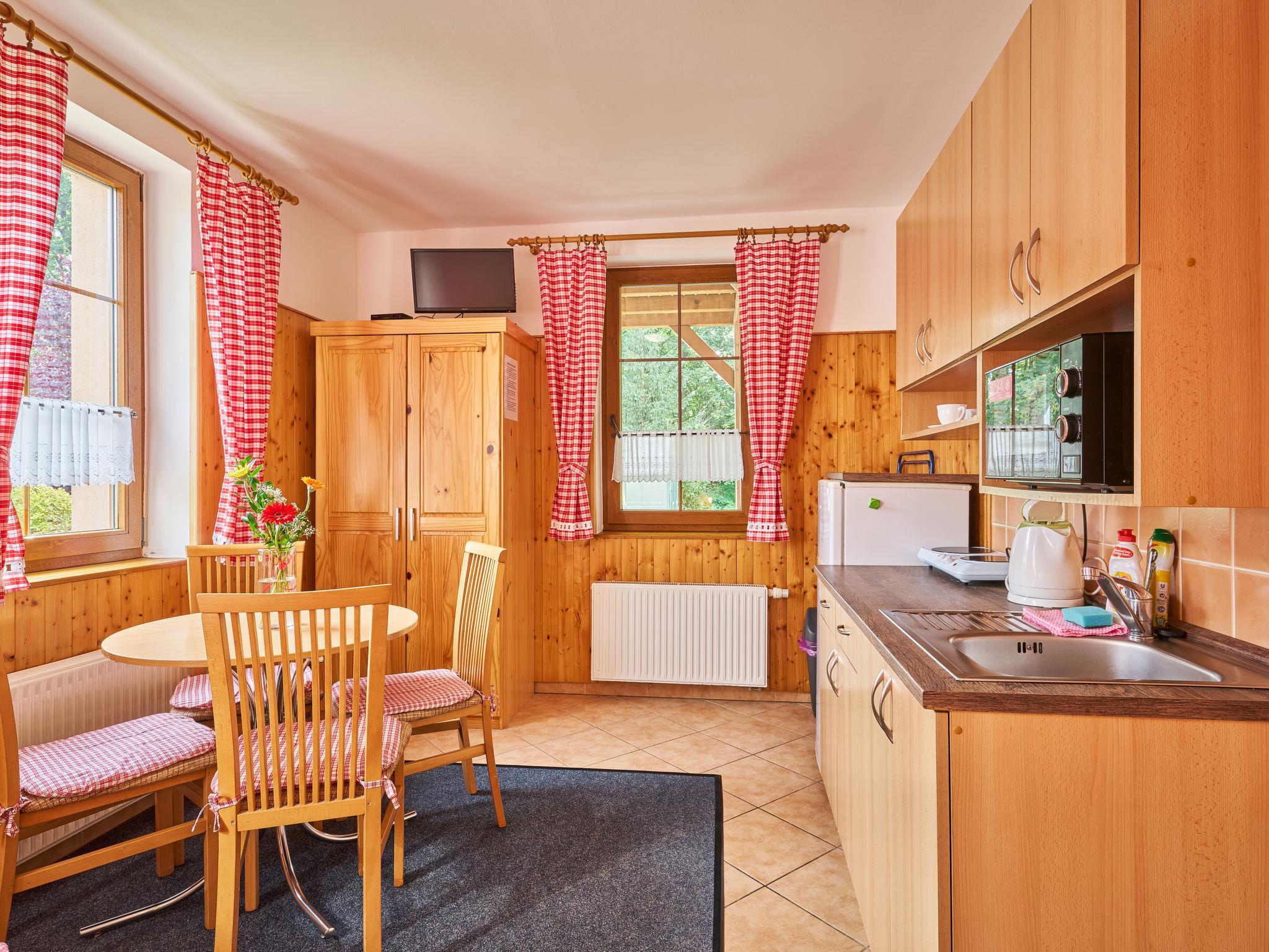 5-room house on the ground floor. Practical and cosy furnishings: 2 rooms, each room with 1 bed, 1 double bed, dining table, kitchen corner, shower/WC and satellite TV. 1 room with 2 beds, 1 double bed, dining table, kitchen corner, shower/WC and satellite TV. 1 room with 1 double bed, dining table, kitchen corner, shower/WC and satellite TV. 1 room with 2 beds and shower/WC. Kitchenette (2 induction hot plates, kettle, microwave). Heating. View of the garden. Facilities: Internet (WiFi, free). Please note: non-smokers only. Smoke alarm, fire extinguisher.