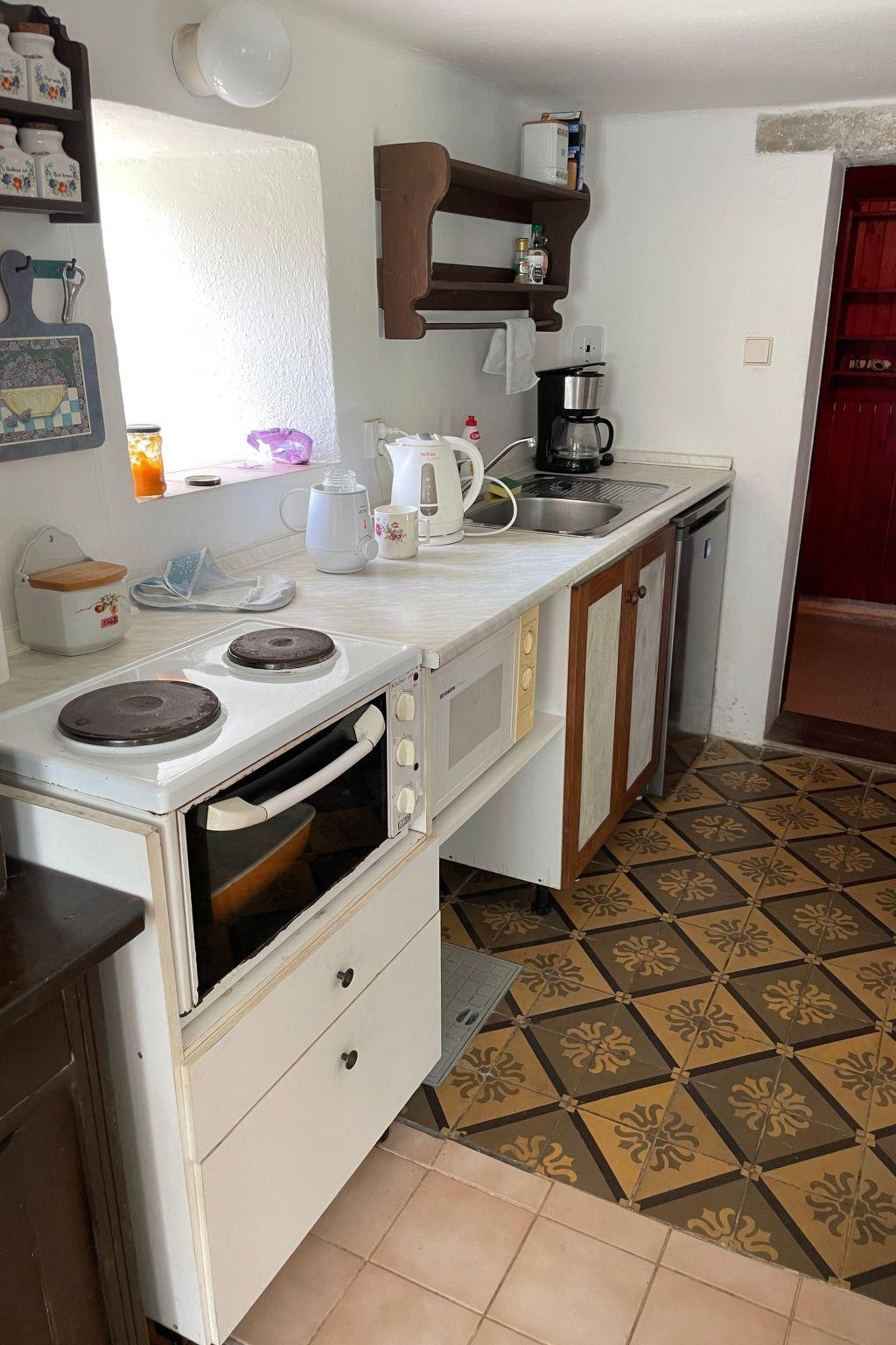 Open kitchen, 2 electric hotplates, oven, refrigerator with freezer