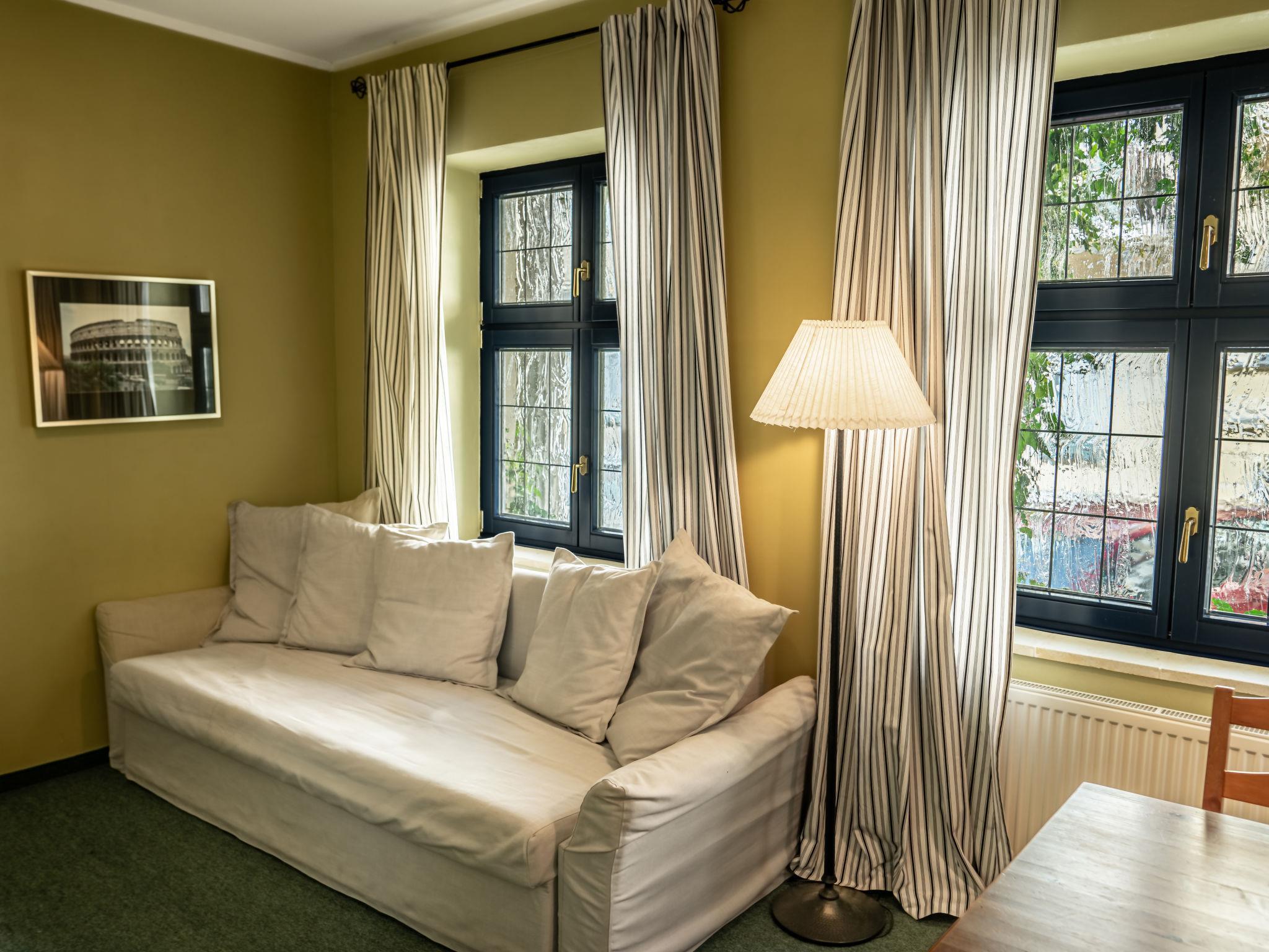 "Kipling", 2-room apartment 38 m2, on the upper ground floor. Beautiful and cosy furnishings: living/sleeping room with 1 pull-out bed (2 pers.), dining table and satellite TV. 1 room with 1 double bed. Kitchenette (2 hot plates, kettle, microwave, freezer). Shower/WC. Very beautiful view of the garden. Facilities: Internet (WiFi, free). Parking (fenced) at the house. Please note: suitable for families. Non-smokers only. Maximum 1 pet/ dog allowed. Fire extinguisher.