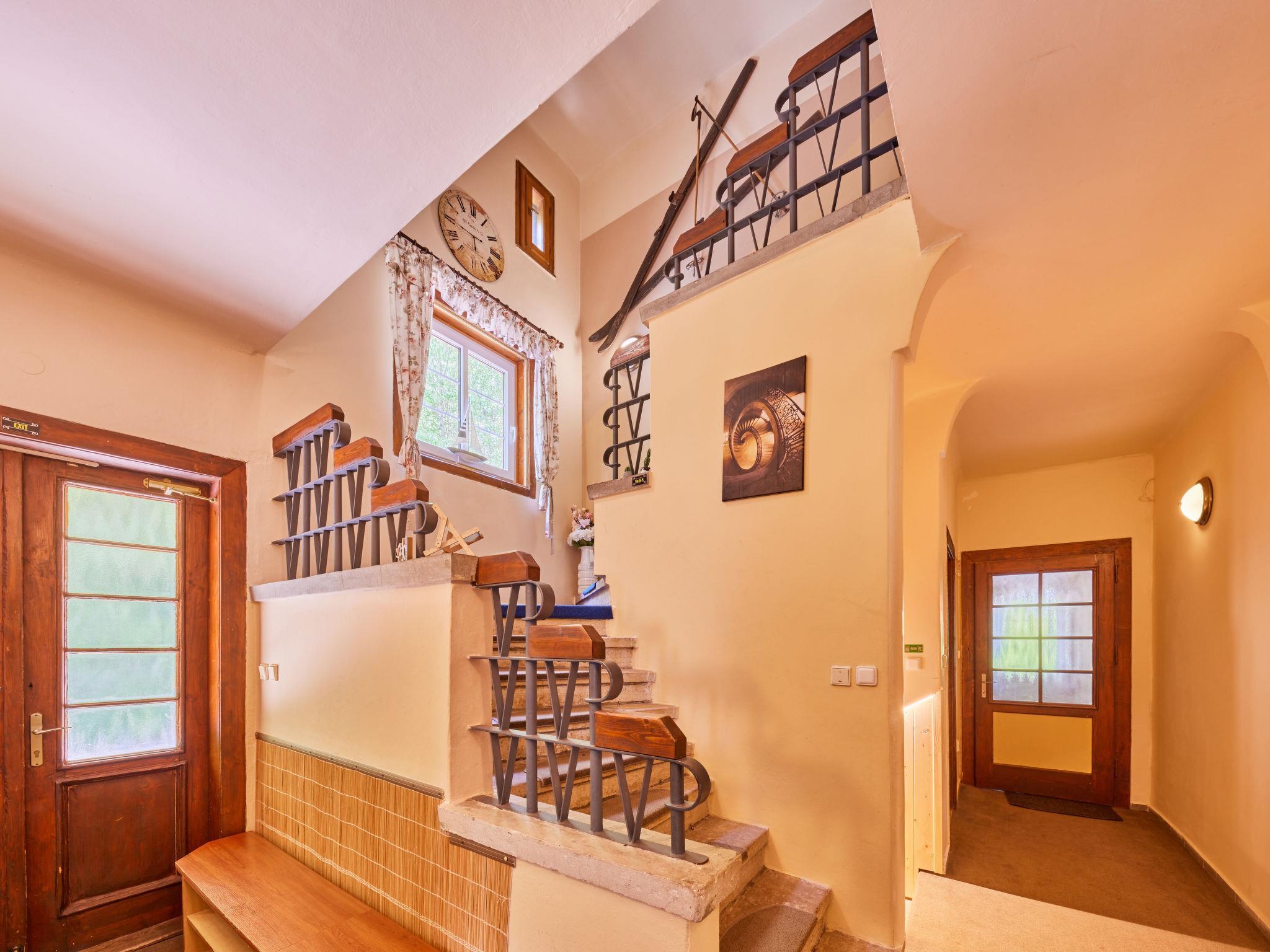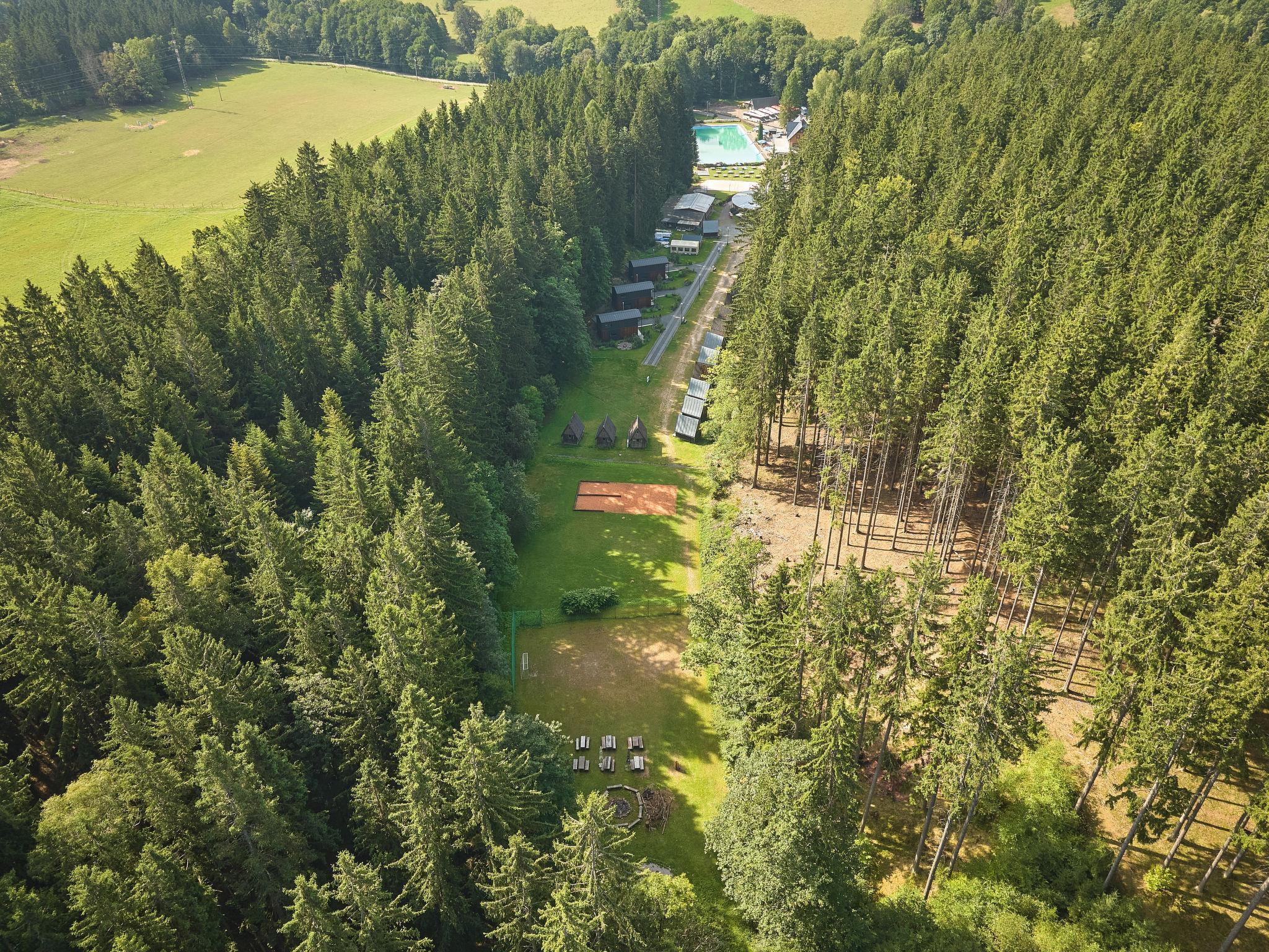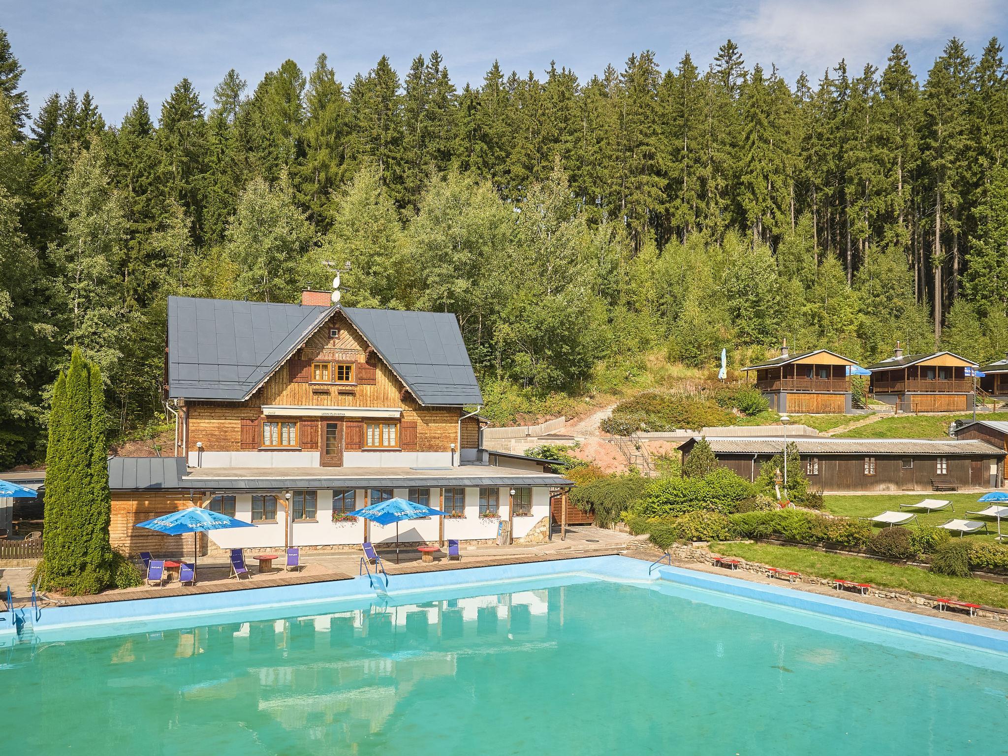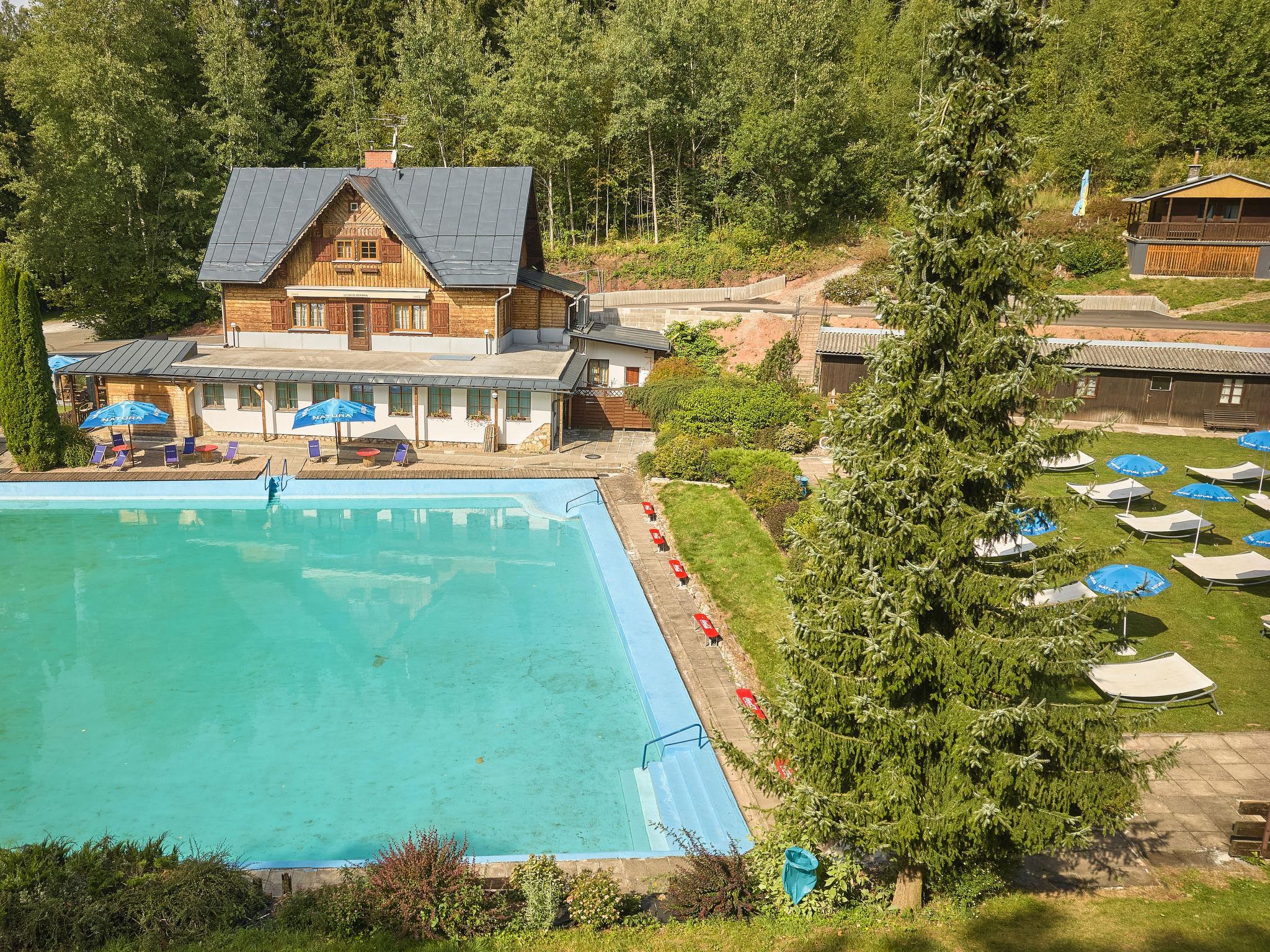 "Krakonoš", 12-room chalet 356 m2 on 3 levels. Spacious and bright, very comfortable and beautiful furnishings: large living room with Scandinavian wood stove, dining table and TV. Playroom. Kitchen (oven, dishwasher, 4 induction hot plates, toaster, kettle, freezer, grill, electric coffee machine, Capsules for coffee machine (Tchibo)). Exit to the terrace. 2 sep. WC's. Heating. Upper floor: 3 rooms, each room with 1 double bed. 1 room with 2 beds. Shower, 2 sep. WC's. 2nd upper floor: 1 room with 2 beds, 1 double bed and shower/WC. Living room with TV. 1 room with 2 beds, 1 double bed and shower/WC. Living room with TV. 1 room with 3 beds, 1 double bed and shower/WC. Living room with TV. Large terrace. Barbecue, deck chairs. Very beautiful view of the swimming pool and the forest. Facilities: children's high chair, baby cot. Internet (WiFi, free). Please note: suitable for families. Non-smoking house. 1 small pet/ dog allowed. At disposal: beer tap (with the option of ordering beer according to the menu). Possibility to arrange beer barrels.