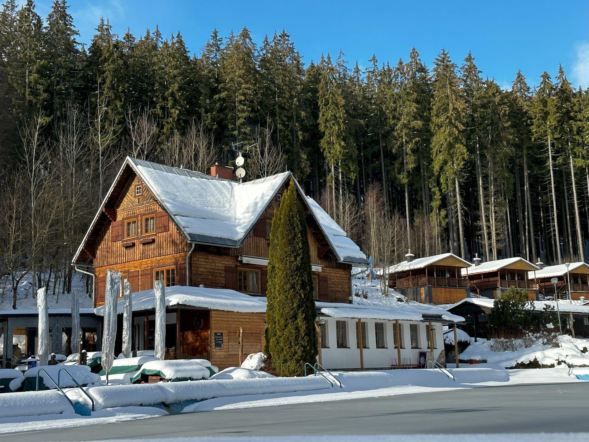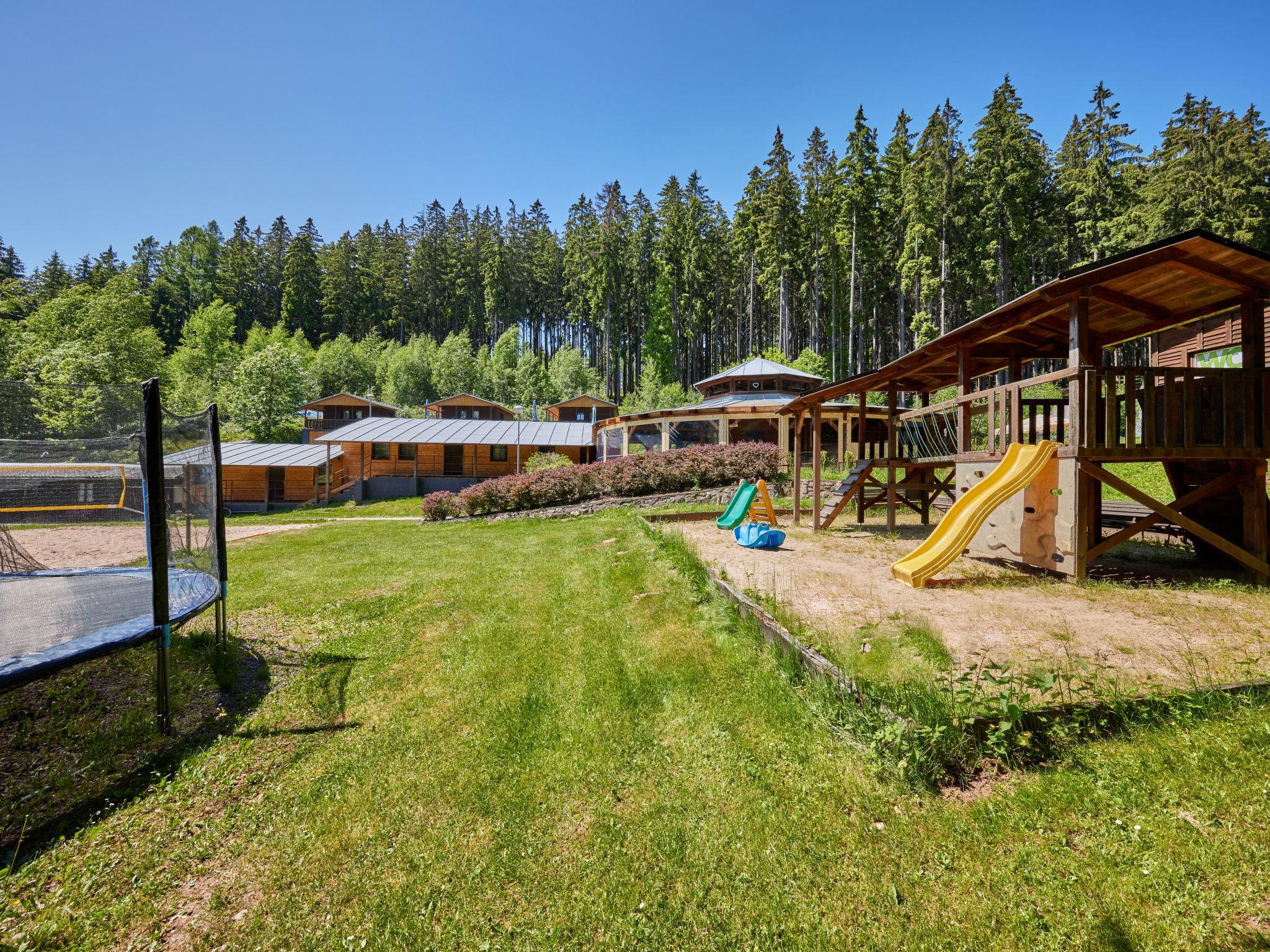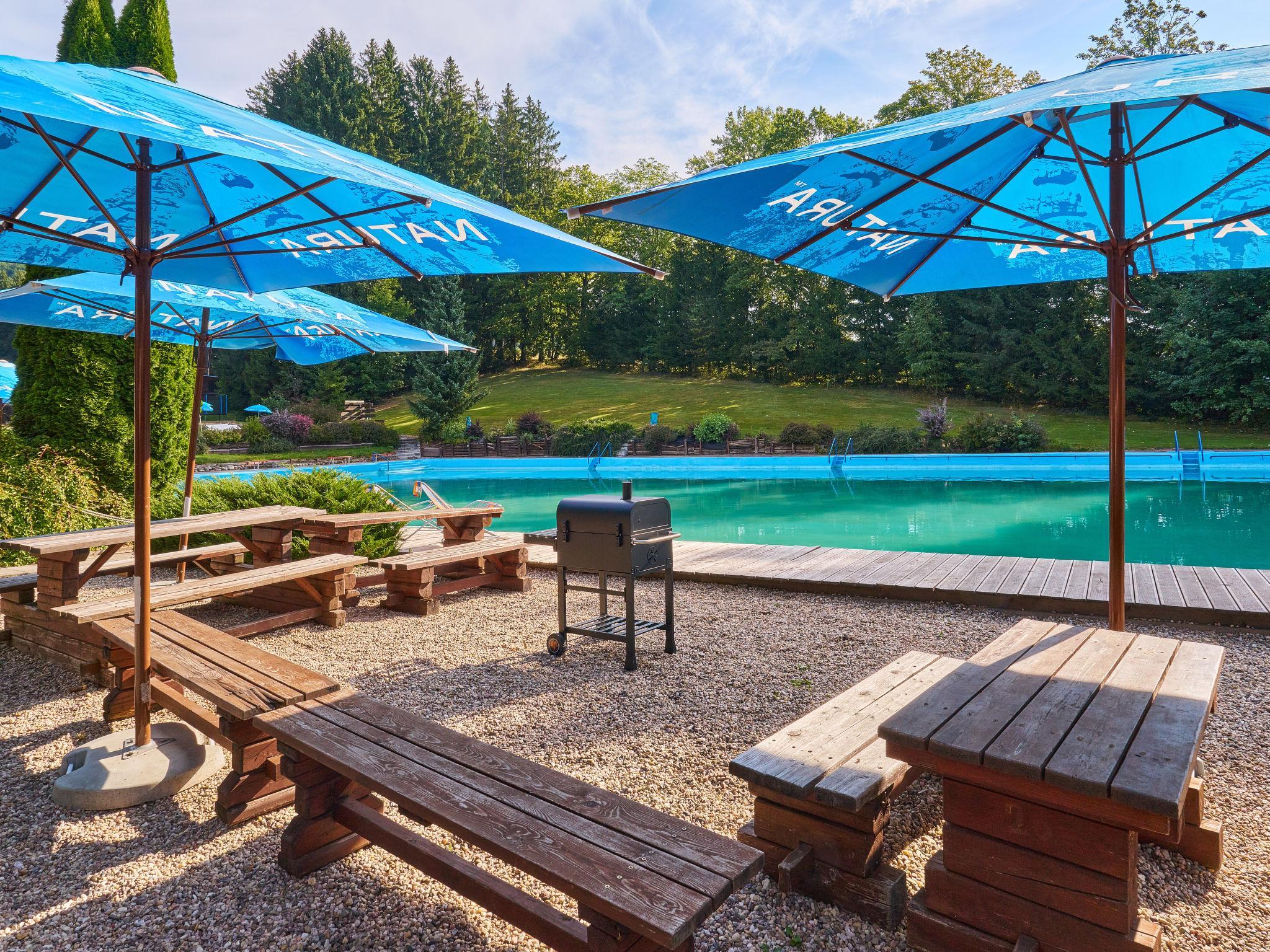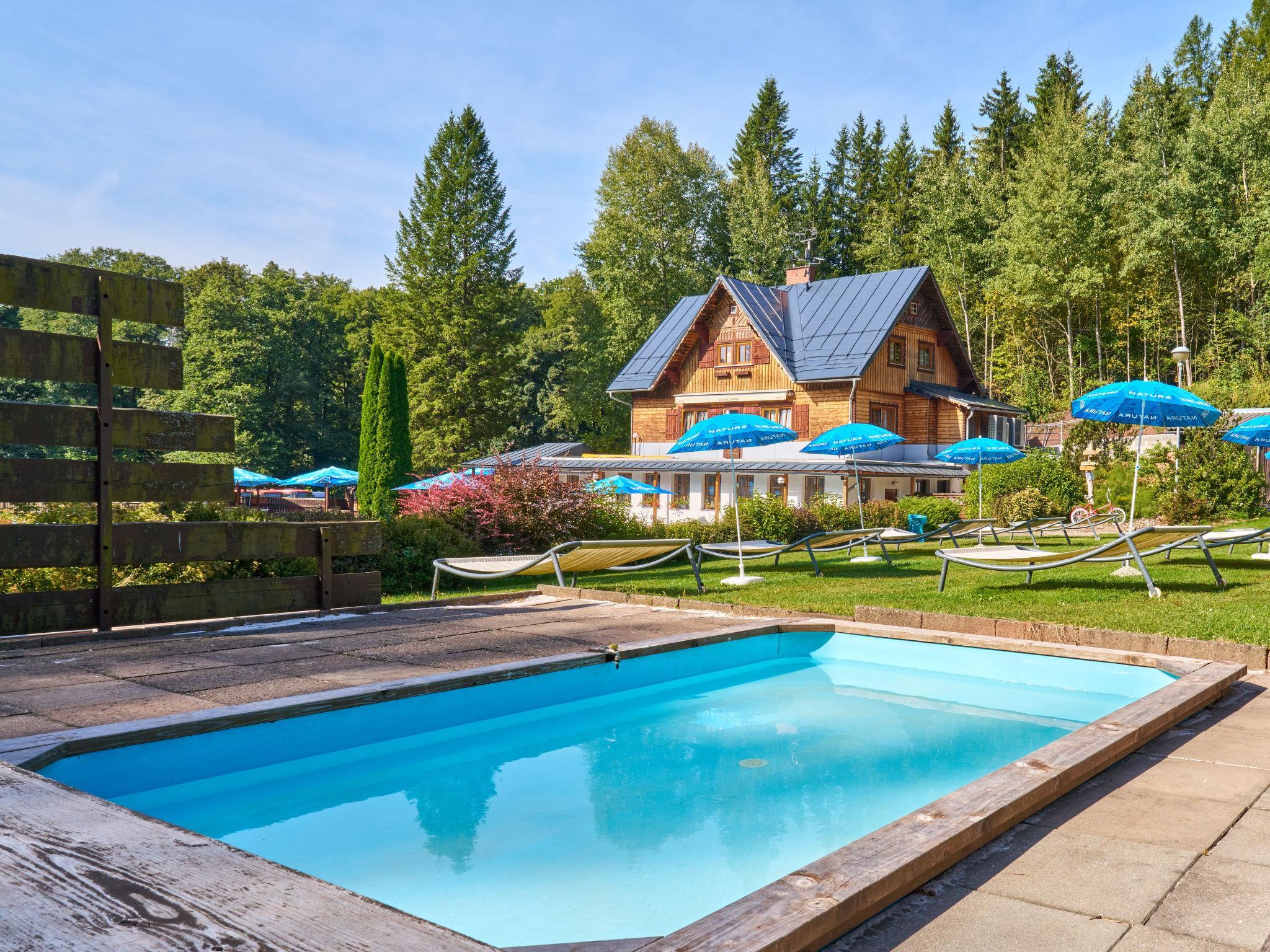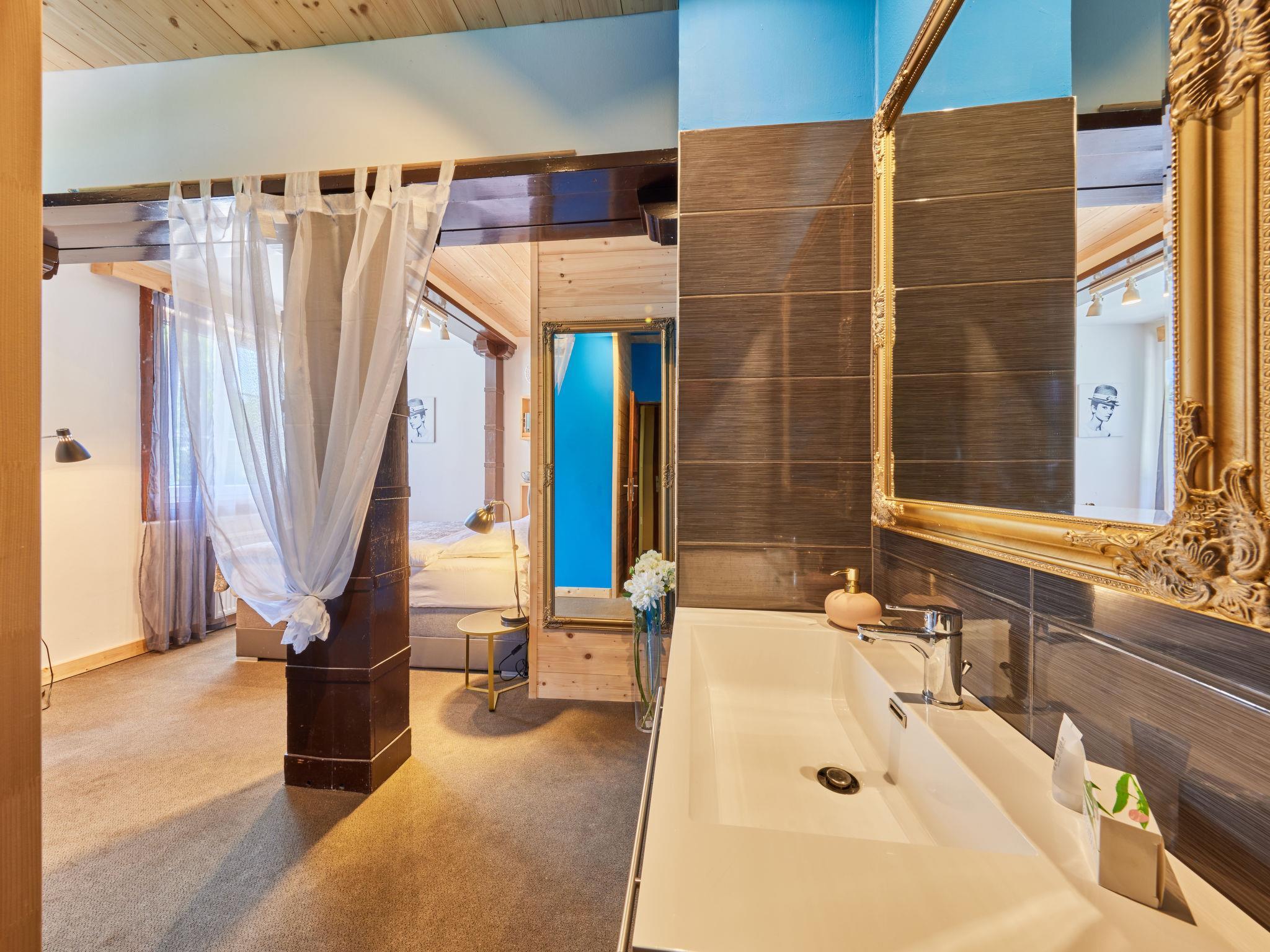 "Krakonoš", 12-room chalet 356 m2 on 3 levels. Spacious and bright, very comfortable and beautiful furnishings: large living room with Scandinavian wood stove, dining table and TV. Playroom. Kitchen (oven, dishwasher, 4 induction hot plates, toaster, kettle, freezer, grill, electric coffee machine, Capsules for coffee machine (Tchibo)). Exit to the terrace. 2 sep. WC's. Heating. Upper floor: 3 rooms, each room with 1 double bed. 1 room with 2 beds. Shower, 2 sep. WC's. 2nd upper floor: 1 room with 2 beds, 1 double bed and shower/WC. Living room with TV. 1 room with 2 beds, 1 double bed and shower/WC. Living room with TV. 1 room with 3 beds, 1 double bed and shower/WC. Living room with TV. Large terrace. Barbecue, deck chairs. Very beautiful view of the swimming pool and the forest. Facilities: children's high chair, baby cot. Internet (WiFi, free). Please note: suitable for families. Non-smoking house. 1 small pet/ dog allowed. At disposal: beer tap (with the option of ordering beer according to the menu). Possibility to arrange beer barrels.