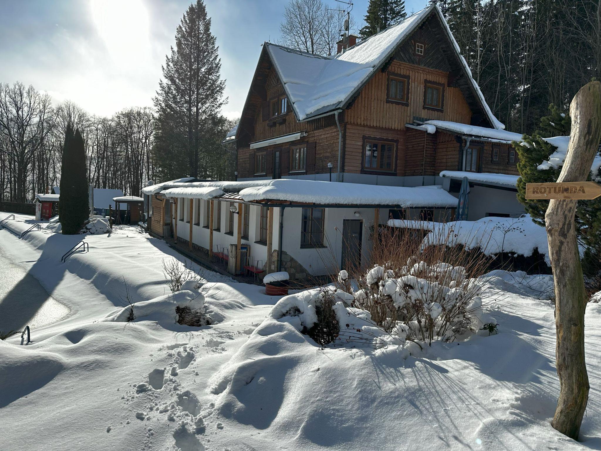 Very beautiful, comfortable chalet, 3 storeys, detached. 7 houses in the resort. Outside the resort, in a quiet, sunny position, 50 m from the edge of the forest, 2 km from the skiing area. For shared use: natural state property, lawn for sunbathing, swimming pool (seasonal availability: 26.Jun. - 03.Sep.). Shower/WC in the pool area, table tennis, boccia, badminton, beach volleyball, barbecue, fireplace. In the house: WiFi, billiard table, storage room for bicycles, sun terrace, storage room for skis. Parking (for 12 cars) at the house. E-charging station. Grocery 1.5 km, shopping centre 6 km, restaurant 5.5 km, bus stop "Mladé Buky" 1.5 km, railway station "Mladé Buky" 1.5 km, indoor swimming pool 10 km. Golf course (18 hole) 4 km, riding stable 3.5 km, walking paths from the house, cycle lane 50 m, ski rental 2.5 km, ski bus stop 50 m, ski school 2.5 km, children's ski school 2.5 km, sled run 2 km, cross country ski track 500 m, children's playground 50 m. Nearby attractions: zábavní park Balduv svet, 2.5 km, Rozhledna Eliška, tvrz Stachelberg 9 km, Stezka Korunami stromu Janské Lázne 10 km, Lanovka na Snežku, Pec pod Snežkou 18 km, Zoo Dvur Králové, Adršpach 28 km, Vyhlídkové lety Vrchlabí, Kuks 30 km. Well-known ski regions can easily be reached: Mladé Buky 2 km, Janské Lázne 9 km, Cerný Dul, Pec-Cerná hora 15 km. Hiking paths: Krkonošský národní park. In the resort: Stone Balance Point – a relaxing technique of balancing stones in beautiful nature, Wimhof toning techniques in the pool (off season). Deposit for shortbreaks (2-3 nights) CZK 10.000 all year round.