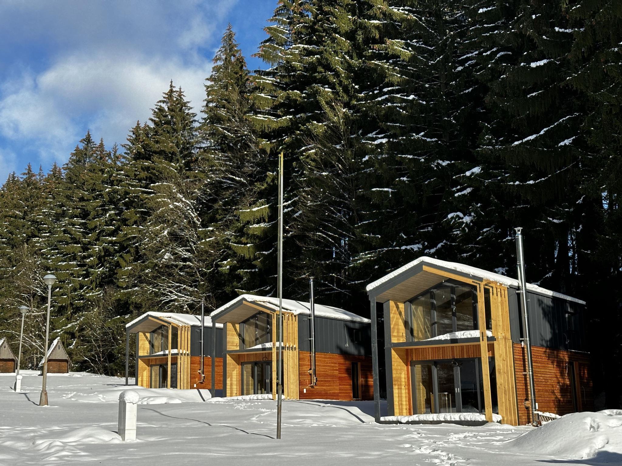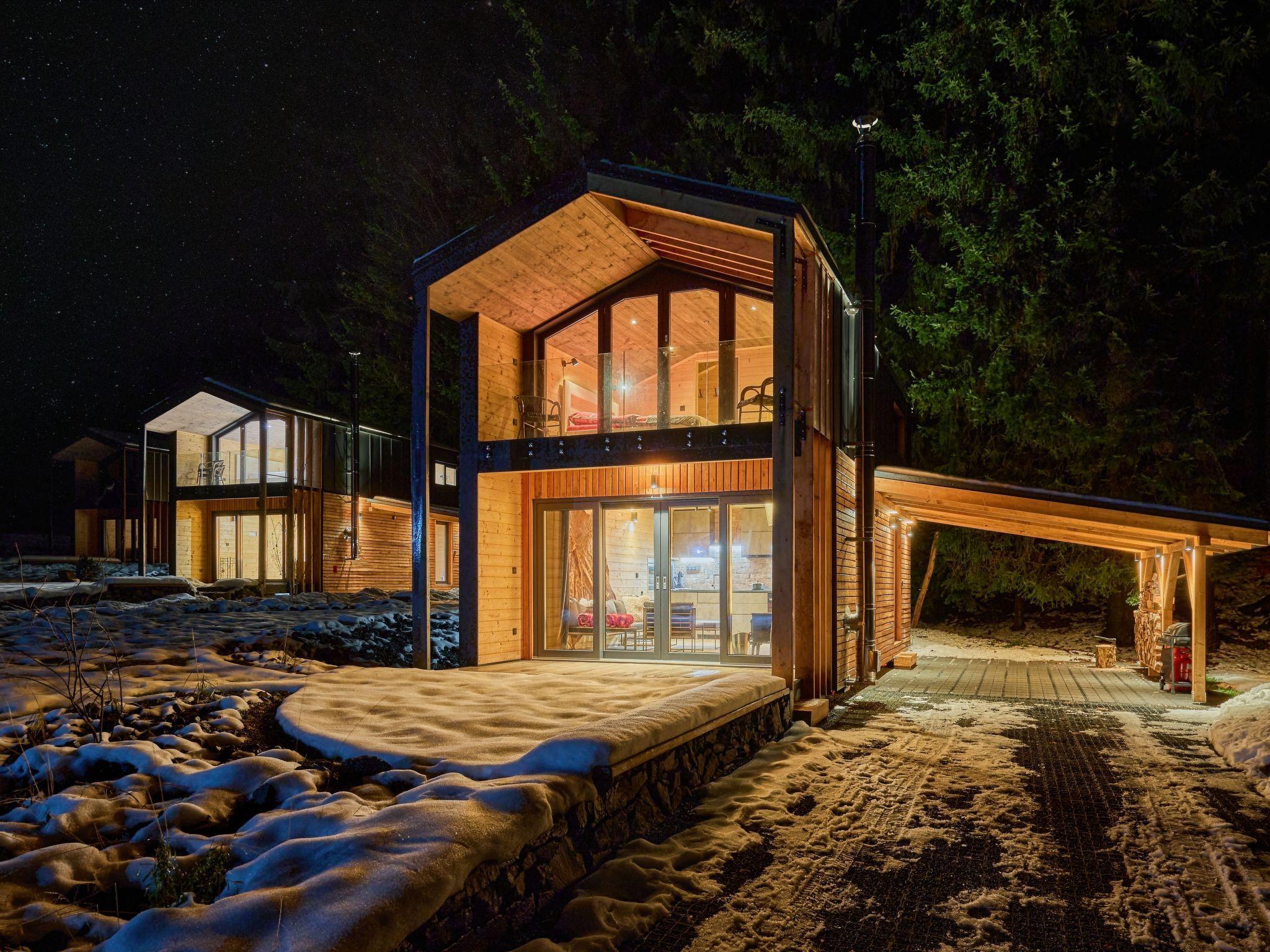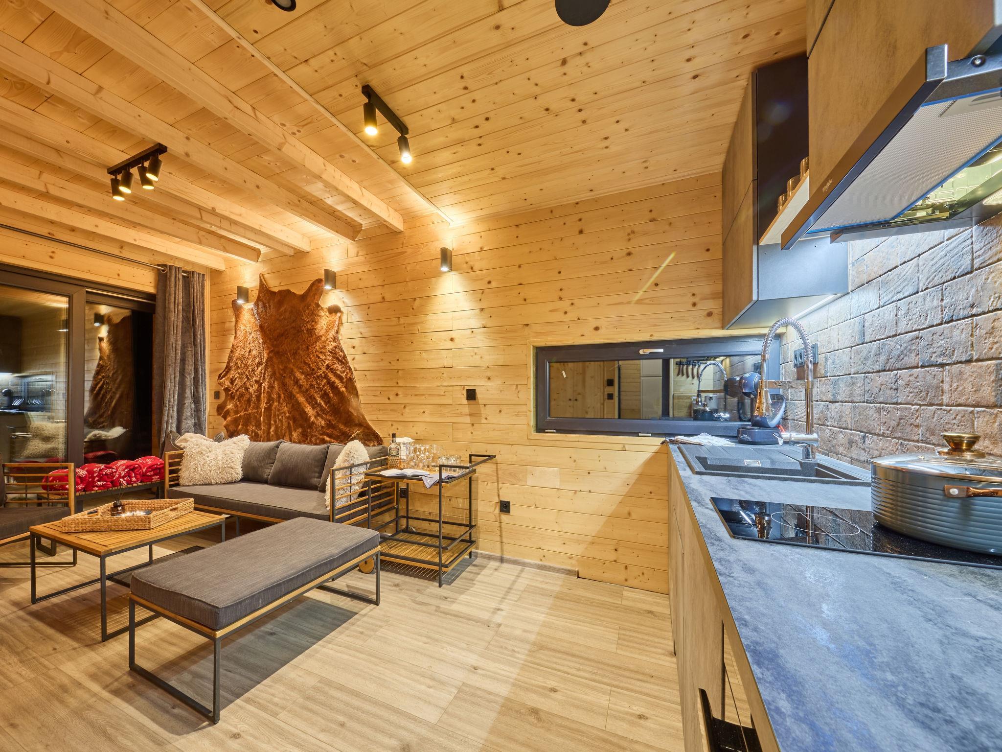"Luxe Timber Lodge & Pet Retreat", 3-room chalet. Very beautiful and tasteful furnishings: living/dining room with 1 sofabed, Scandinavian wood stove, dining table and TV. Kitchenette (2 hot plates, oven, toaster, kettle, microwave, electric coffee machine, Capsules for coffee machine (Tchibo)). Shower/WC. Electric heating, wood heating, floor heating. Upper floor: 1 room with 1 double bed. 1 room with 2 beds. Exit to the balcony. Balcony. Balcony furniture, barbecue. Facilities: Internet (WiFi, free). Please note: suitable for families. Non-smoking house. 1 small pet/ dog allowed. Built-in bluetooth audio system and central touch control of lighting and temperature conveniently from the living room.