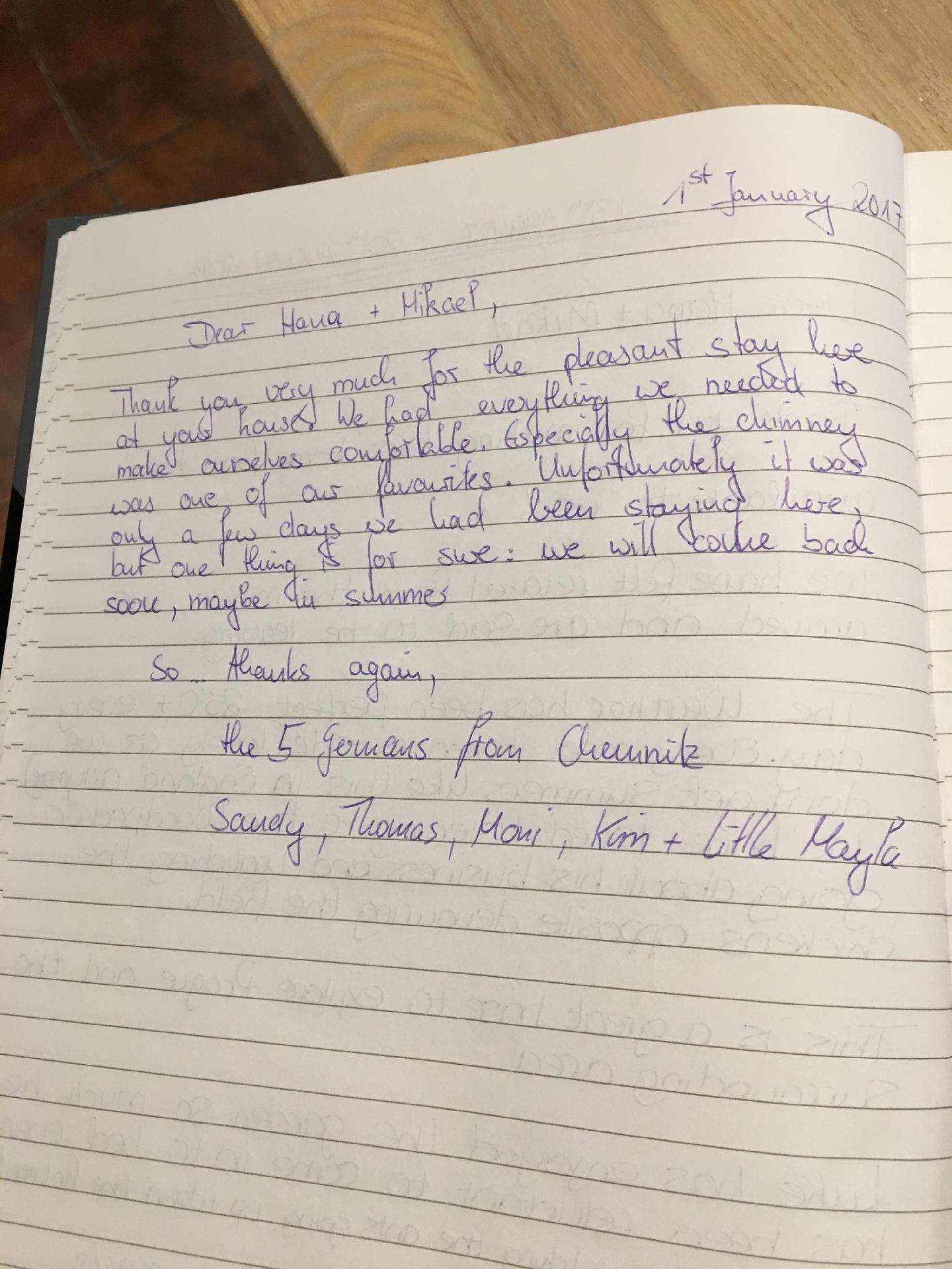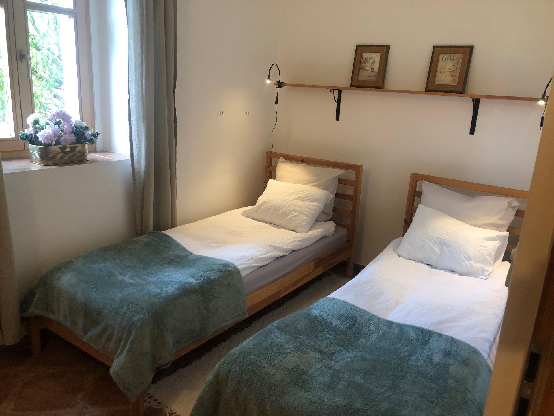 The ground floor apartment (nr. 1) has the entrance hall, bathroom with walk-in shower and a toilette, kitchen 16 sqm, living room with a sleeping sofa 14 sqm and a fire place, and two bedrooms with individual entrances, each approx. 9 sqm. One bedroom has two 80cm beds that can be put together or used as single beds, and the second bedroom has an Ikea guest bed and an elevated bed, perfect for children.