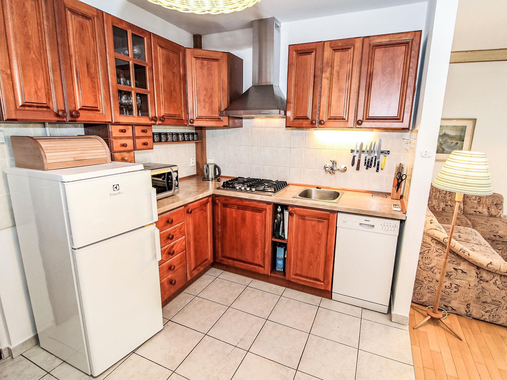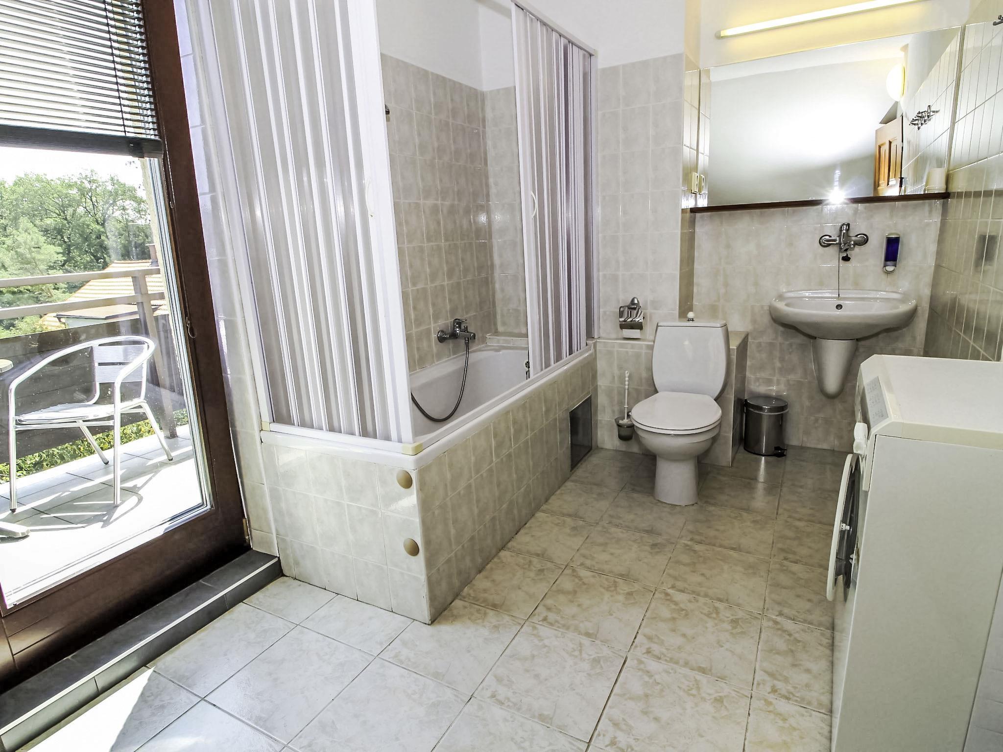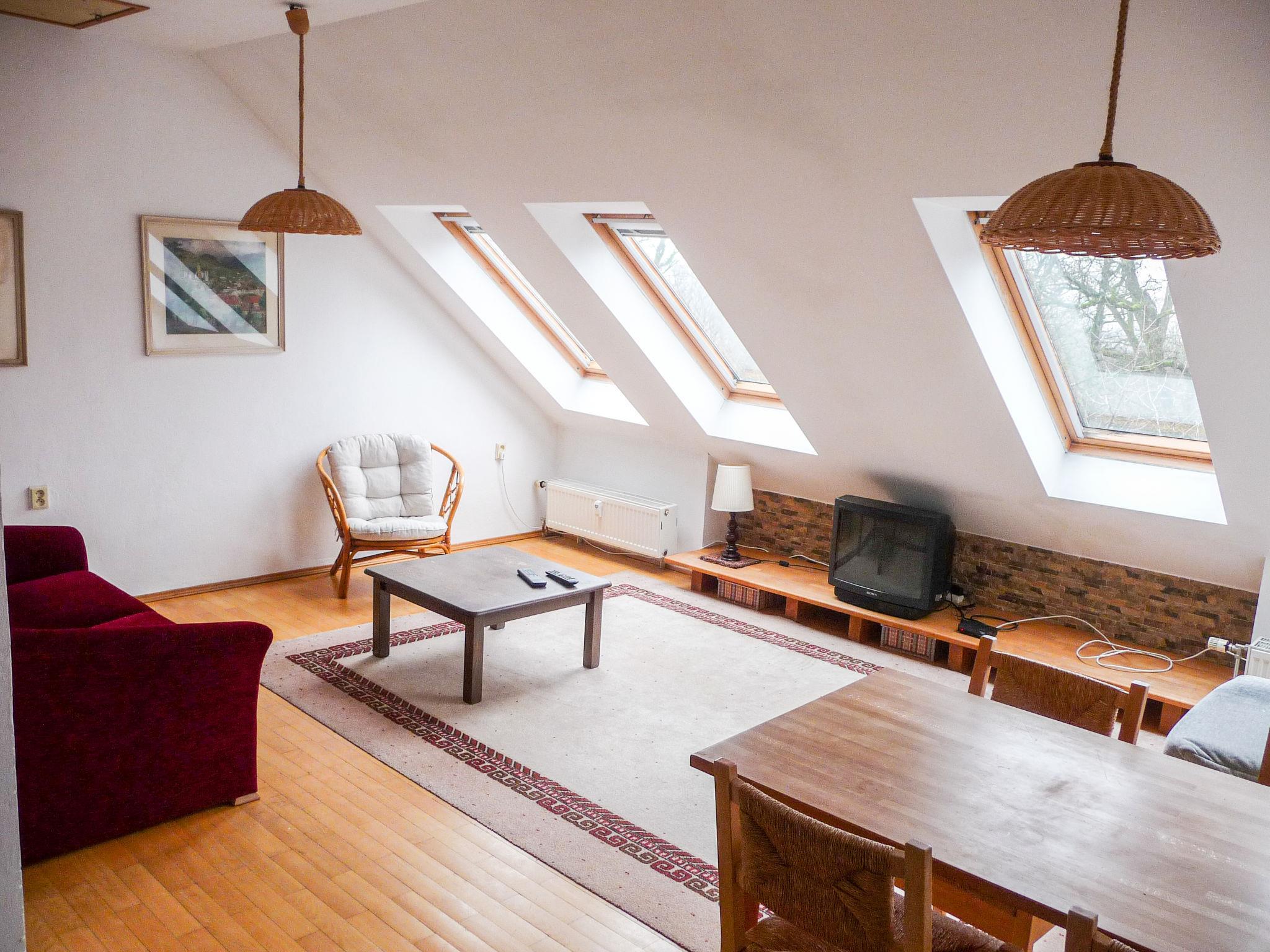 2-room penthouse 60 m2 on 2nd floor. Beautiful and cosy furnishings: open living/dining room 23 m2, with sloping ceilings with 1 double sofabed (130 cm, length 195 cm), 1 folding bed (80 cm, length 195 cm), dining table, satellite TV, video and radio. 1 room 16 m2, with sloping ceilings with rooflight with 2 beds (80 cm, length 200 cm), air conditioning. Open kitchen (dishwasher, 4 gas rings, kettle, microwave, freezer, electric coffee machine). Bath/WC. Electric heating. Balcony 4 m2, south-east facing position. Terrace furniture. View of the garden. Facilities: washing machine, iron, baby cot for up to 2 year olds. Internet (WiFi, free). Suitable for families.