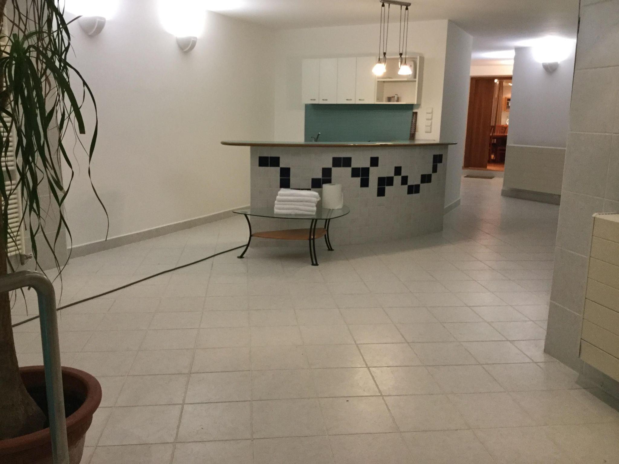 Terrace with garden furniture and parasol / private balcony, barbecue view Indoor pool / swimming pool for private use Possibility of parking / garage Individual and fenced house located in a residential area The terrace has garden chairs . The plot is fenced and thus perfectly suitable for children and dogs.