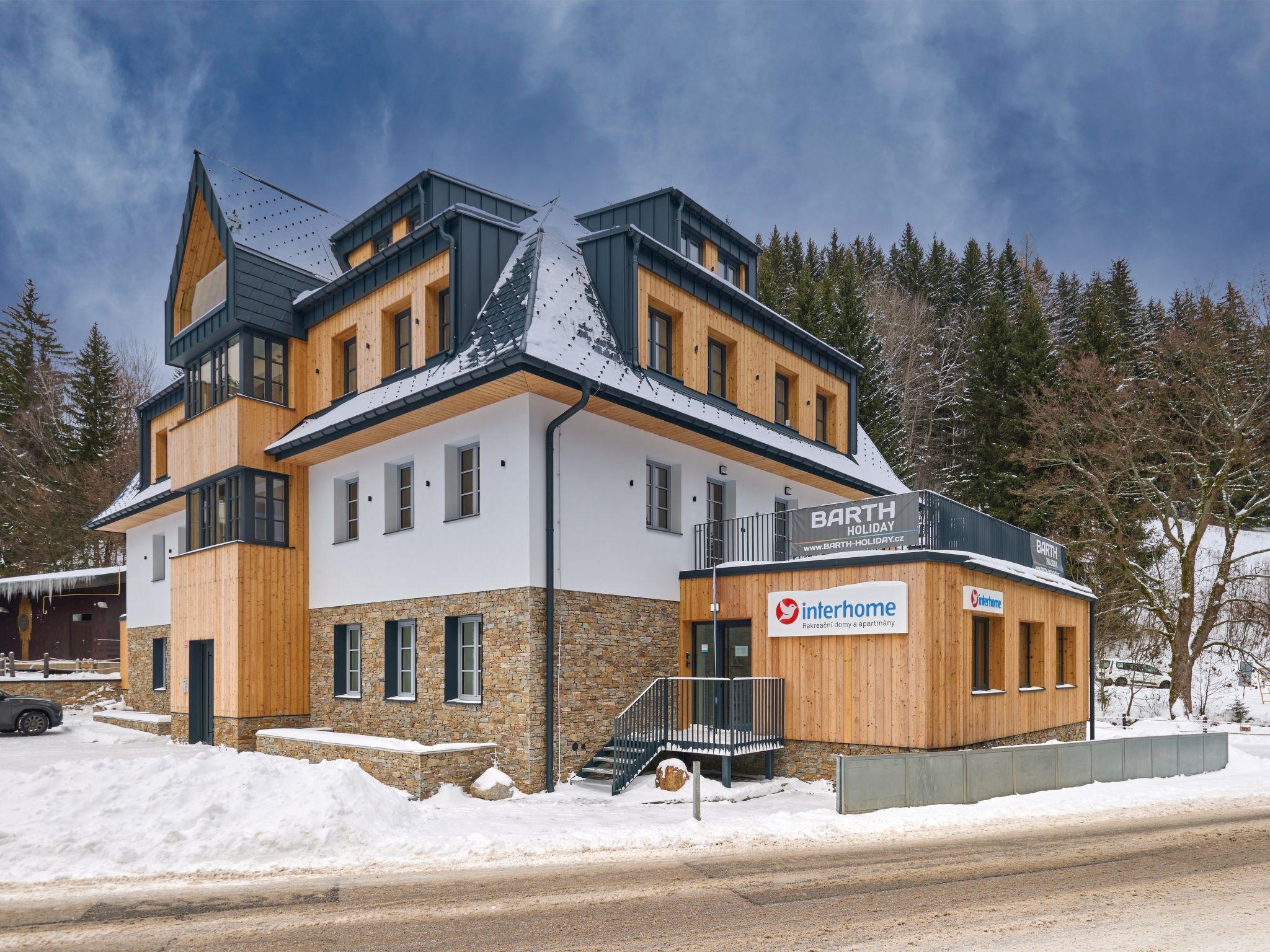 Modern, luxurious residence "Máj", 3 storeys, detached, renovated in 2023. In the centre of Pec pod Snežkou, 100 m from the edge of the forest, 1.3 km from the skiing area, 10 m from the river. In the house: storage room for skis, central heating system. Parking at the house. Shop 60 m, grocery 200 m, restaurant 60 m, bar, café 100 m, bicycle rental 500 m, pub garden 60 m, bus stop "Pec pod Snežkou" 300 m, indoor swimming pool 500 m. Sports centre 500 m, walking paths from the house, cycle lane 20 m, ski lift 1.3 km, chair lift 1.3 km, skisport facilities 1.3 km, ski rental 60 m, ski bus stop 200 m, ski school 1.3 km, children's ski school 1.3 km, cross country ski track 150 m, children's playground 400 m. Nearby attractions: Relaxpark, bobová dráha 400 m, Snežka (lanovka) 1.2 km, Obrí dul, Modrý dul, vodopády 3 km, Malá Úpa 8 km, Janské Lázne 15 km, Vrchlabí, Trutnov 30 km. Well-known ski regions can easily be reached: Pec pod Snežkou – Cerná Hora 1.3 km, Velká Úpa 2.5 km, Janské Lázne 15 km. Well-known lakes can easily be reached: Dolce 25 km. Hiking paths: Krkonošský národní park. Groups of teenagers on request only. The owner does not accept any youth groups.