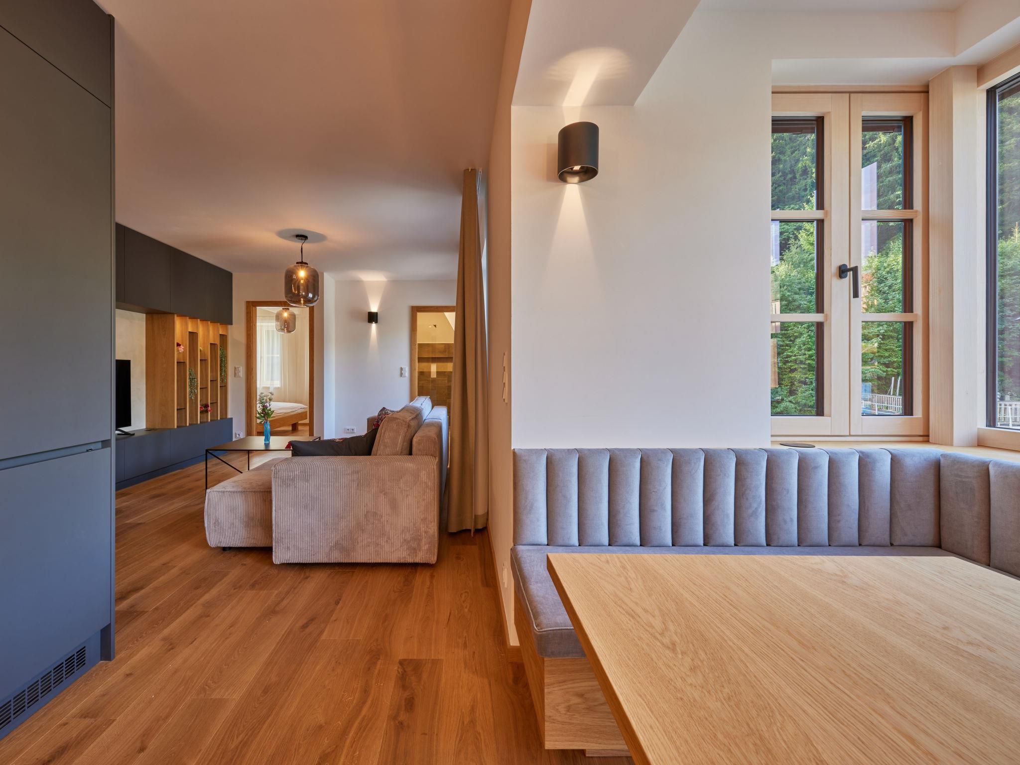 Modern, luxurious residence "Máj", 3 storeys, detached, renovated in 2023. In the centre of Pec pod Snežkou, 100 m from the edge of the forest, 1.3 km from the skiing area, 10 m from the river. In the house: storage room for skis, central heating system. Parking at the house. Shop 60 m, grocery 200 m, restaurant 60 m, bar, café 100 m, bicycle rental 500 m, pub garden 60 m, bus stop "Pec pod Snežkou" 300 m, indoor swimming pool 500 m. Sports centre 500 m, walking paths from the house, cycle lane 20 m, ski lift 1.3 km, chair lift 1.3 km, skisport facilities 1.3 km, ski rental 60 m, ski bus stop 200 m, ski school 1.3 km, children's ski school 1.3 km, cross country ski track 150 m, children's playground 400 m. Nearby attractions: Relaxpark, bobová dráha 400 m, Snežka (lanovka) 1.2 km, Obrí dul, Modrý dul, vodopády 3 km, Malá Úpa 8 km, Janské Lázne 15 km, Vrchlabí, Trutnov 30 km. Well-known ski regions can easily be reached: Pec pod Snežkou – Cerná Hora 1.3 km, Velká Úpa 2.5 km, Janské Lázne 15 km. Well-known lakes can easily be reached: Dolce 25 km. Hiking paths: Krkonošský národní park. Groups of teenagers on request only. The owner does not accept any youth groups.