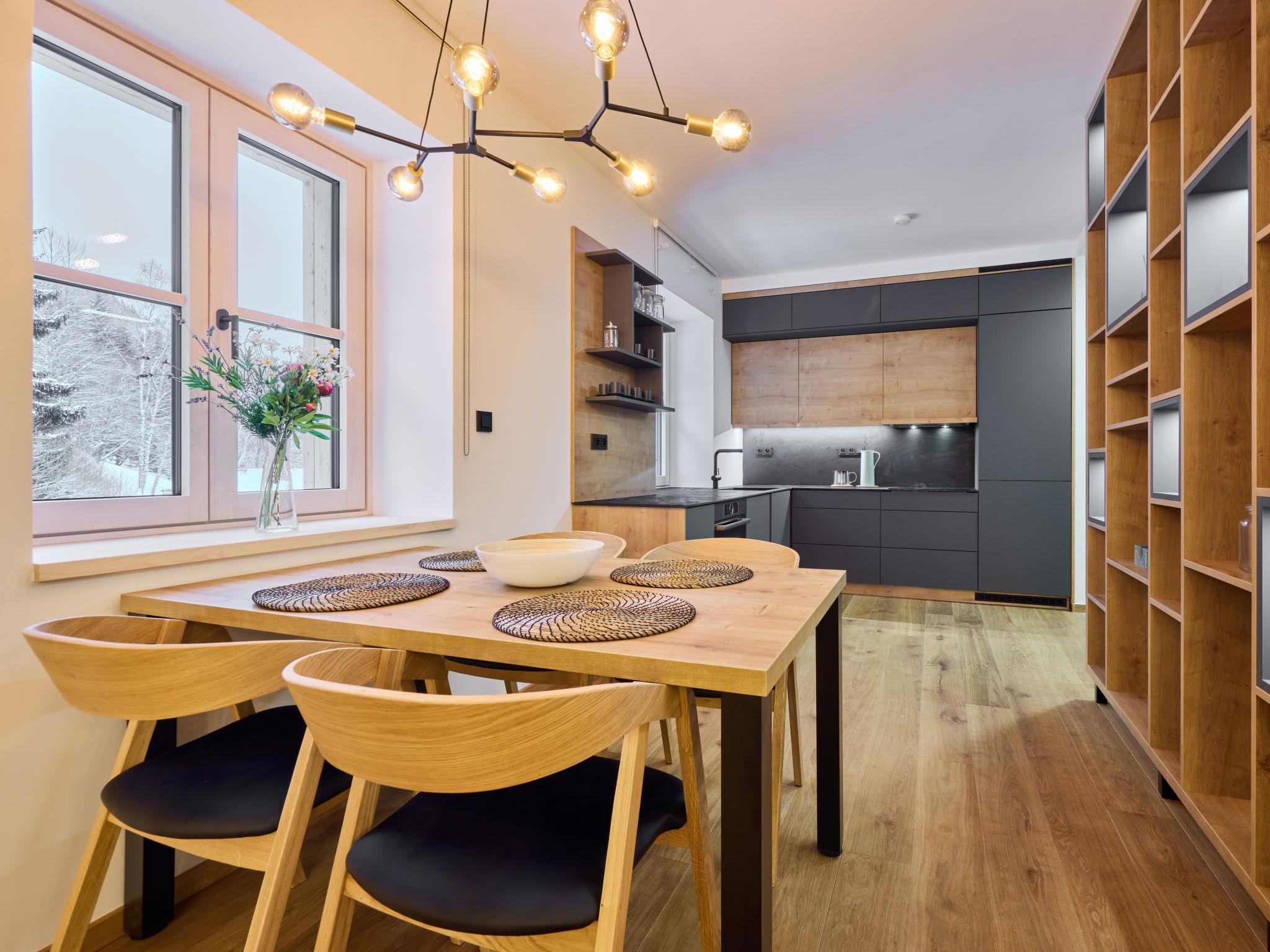 Modern, luxurious residence "Máj", 3 storeys, detached, renovated in 2023. In the centre of Pec pod Snežkou, 100 m from the edge of the forest, 1.3 km from the skiing area, 10 m from the river. In the house: storage room for skis, central heating system. Parking at the house. Shop 60 m, grocery 200 m, restaurant 60 m, bar, café 100 m, bicycle rental 500 m, pub garden 60 m, bus stop "Pec pod Snežkou" 300 m, indoor swimming pool 500 m. Sports centre 500 m, walking paths from the house, cycle lane 20 m, ski lift 1.3 km, chair lift 1.3 km, skisport facilities 1.3 km, ski rental 60 m, ski bus stop 200 m, ski school 1.3 km, children's ski school 1.3 km, cross country ski track 150 m, children's playground 400 m. Nearby attractions: Relaxpark, bobová dráha 400 m, Snežka (lanovka) 1.2 km, Obrí dul, Modrý dul, vodopády 3 km, Malá Úpa 8 km, Janské Lázne 15 km, Vrchlabí, Trutnov 30 km. Well-known ski regions can easily be reached: Pec pod Snežkou – Cerná Hora 1.3 km, Velká Úpa 2.5 km, Janské Lázne 15 km. Well-known lakes can easily be reached: Dolce 25 km. Hiking paths: Krkonošský národní park. Groups of teenagers on request only. The owner does not accept any youth groups.