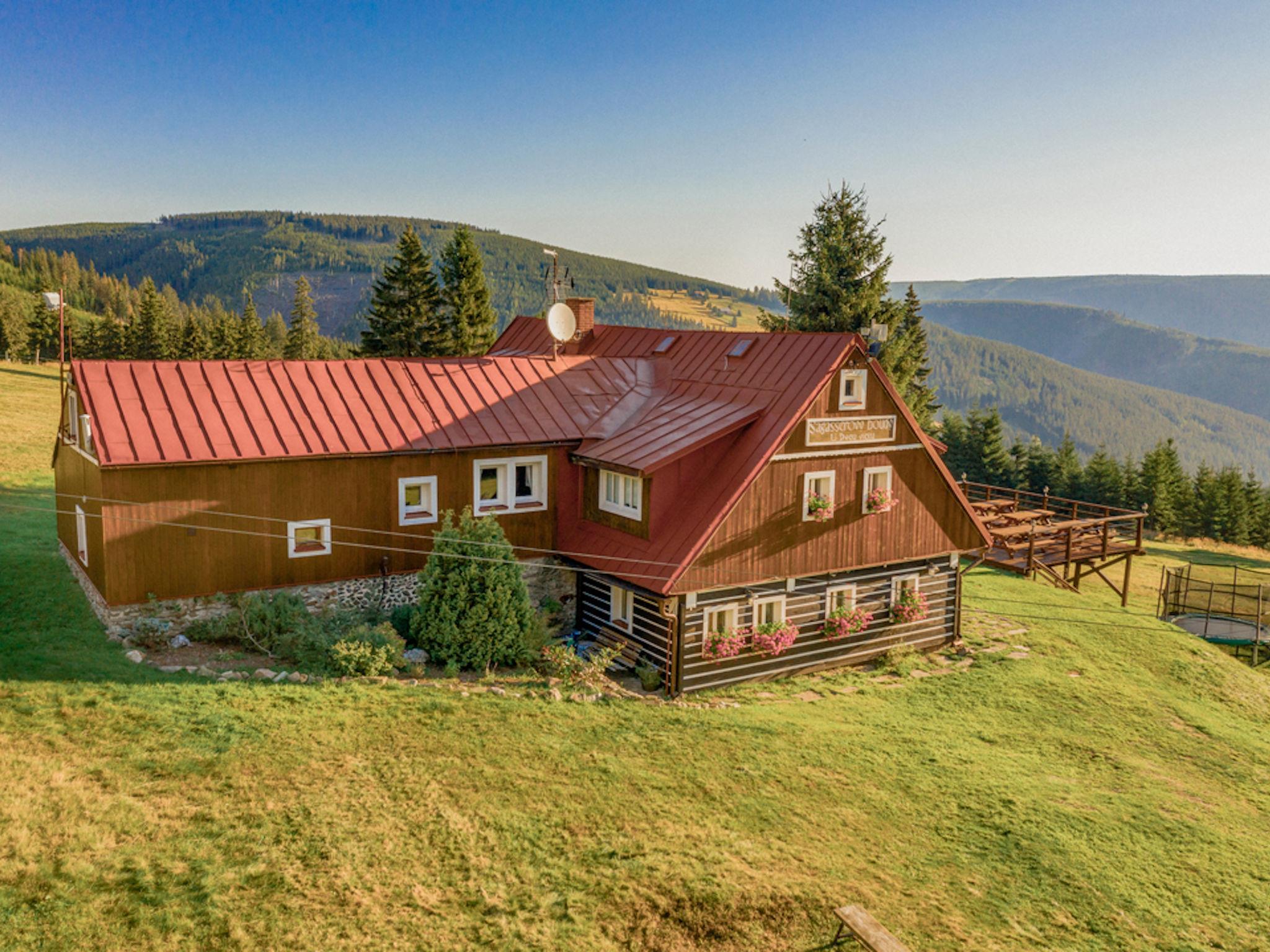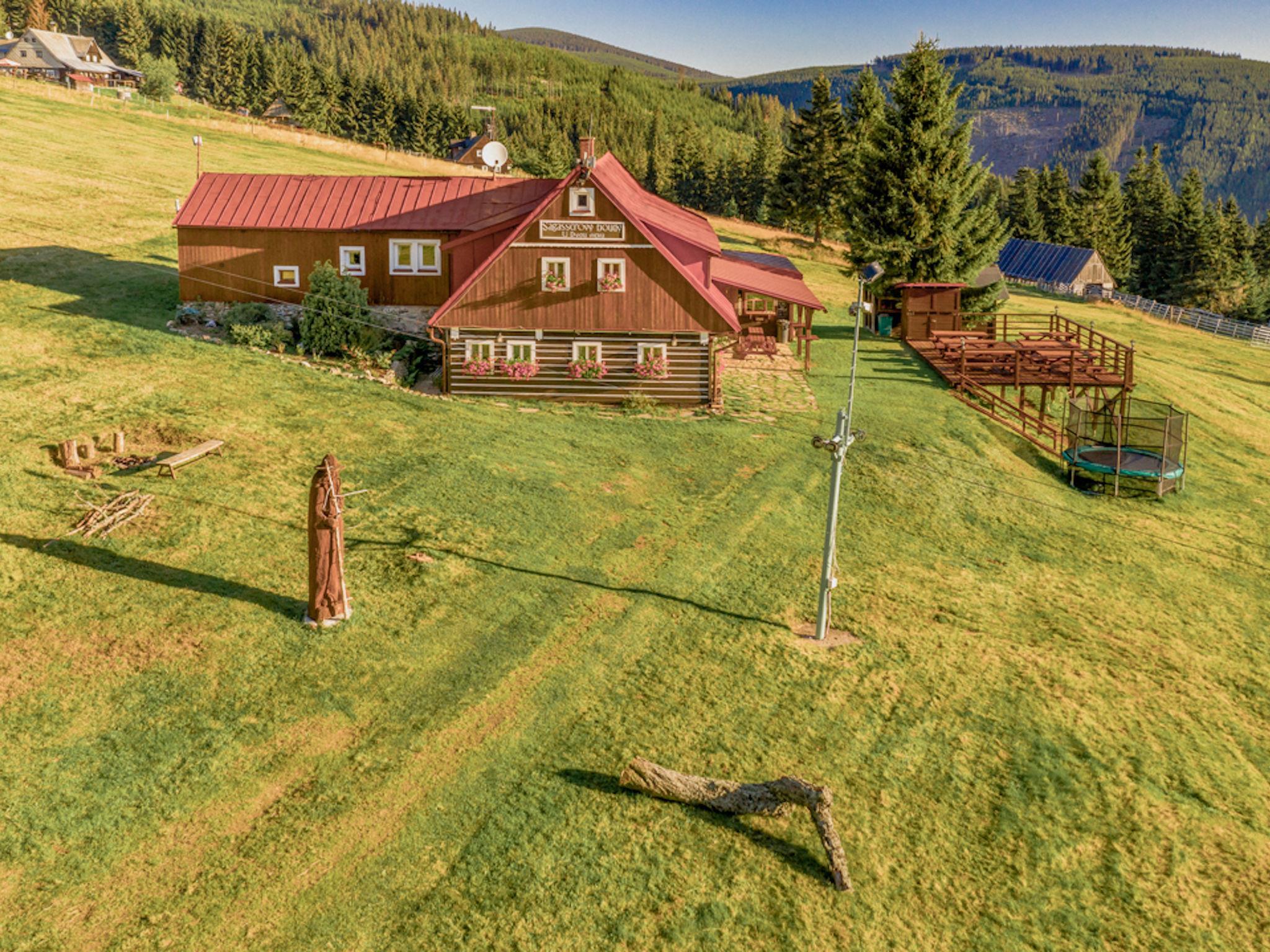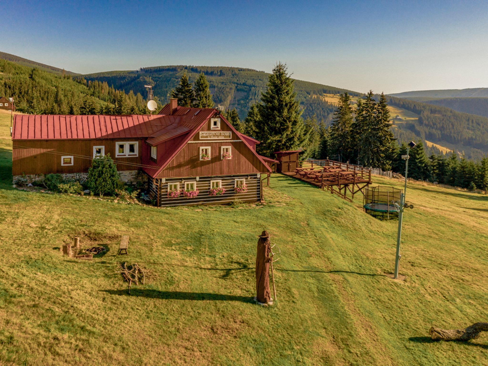Velká Úpa 6 km from Pec pod Snežkou: Beautiful, cosy chalet "U Dvou vleku", 3 storeys, detached, surrounded by meadows. In a secluded, sunny, elevated position, directly by the skiing area. Private: property. Terrace, garden furniture, barbecue. In the house: WiFi, playroom, table football, storage room for skis, central heating system, washing machine, tumble dryer. Parking at the house, in winter 5 km public parking extra. Shop 6 km, grocery 6 km, restaurant 100 m, bus stop "Pec pod Snežkou, Velká Úpa, nám." 3 km, indoor swimming pool 250 m. Golf course (18 hole) 15 km, tennis 4 km, walking paths from the house 10 m, cycle lane 100 m, ski lift 10 m, chair lift 200 m, slopes 10 m, ski school, children's ski school, cross country ski track, children's playground 500 m. Nearby attractions: Bobová dráha/Relaxpark Pec pod Snežkou 3 km, Snežka (1603 m) 6 km, Mladé Buky 12 km, Kowary 26 km, Aquapark Vrchlabí 29 km, Park miniatur Myslakowice, Karpacz 34 km, Adršpašsko-teplické skály 40 km, Jelenia Góra, Zoo Dvur Králové, Kuks 45 km. Well-known ski regions can easily be reached: Velká Úpa 200 m, Cerná hora-Pec pod Snežkou 3 km, Cerná Hora-Janské Lázne 12 km. Well-known lakes can easily be reached: Dolce 25 km. Hiking paths: Krkonošský národní park. Please note: suitable for families. In case of good snow conditions, the house is accessible on skis. At disposal: minibar, beer tap. Local bistro (draft beer and limo, hot drinks, pizza, hot dog, etc.) open only in winter.
