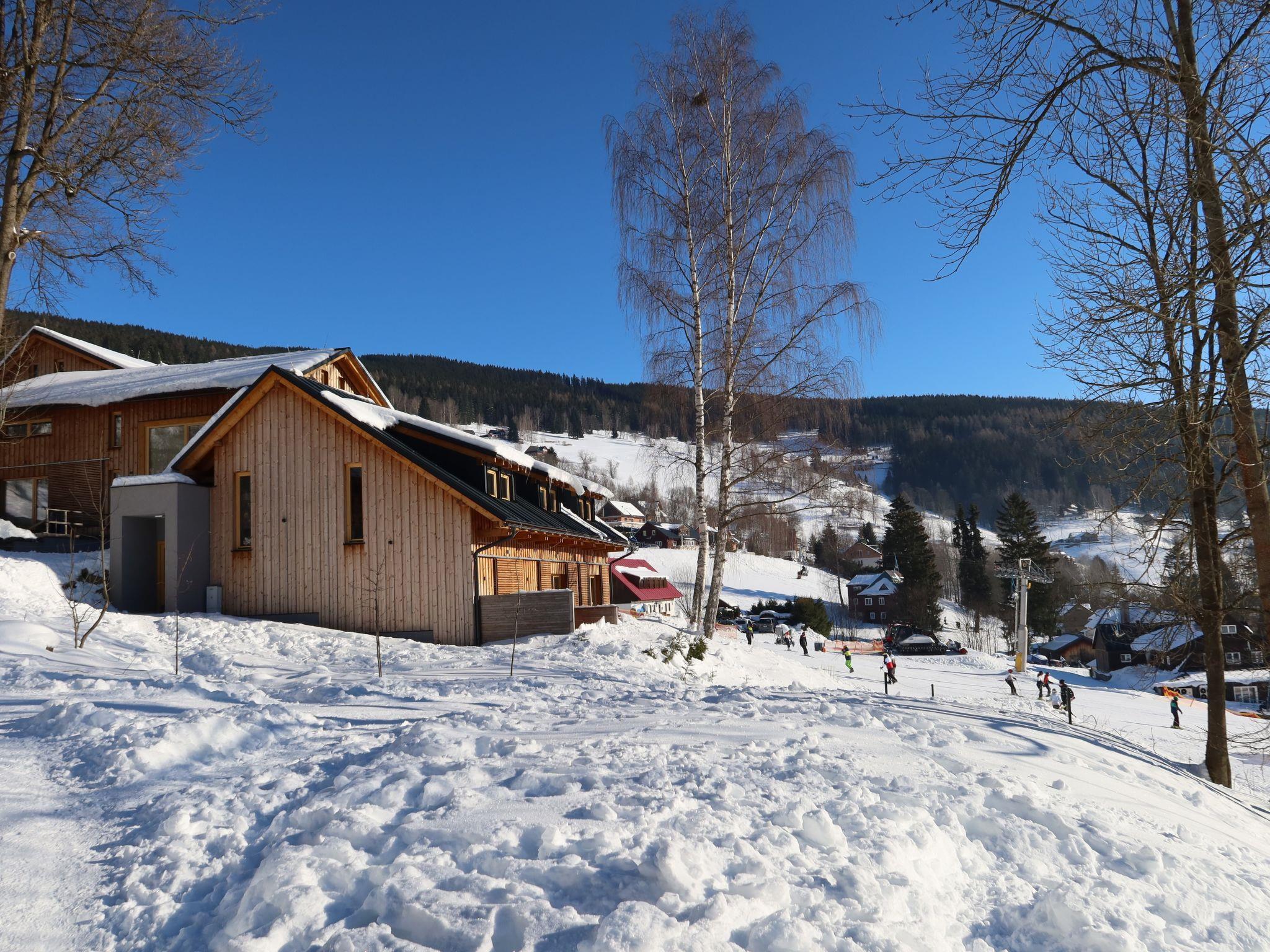 Child friendly, comfortable chalet "Portášky, Velká Úpa", 2 storeys. 3 apartments in the property. In the district of Velká Úpa 2 km from the centre of Pec pod Snežkou, 12 km from the centre of Janské Lázne, 20 km from the centre of Trutnov, in a secluded, sunny, elevated position, directly by the skiing area. Breakfast on request (extra). Parking (in winter extra). Grocery 50 m, restaurant 100 m, bus stop "Pec pod Snežkou, dopr. Terminál" 400 m. Golf course (18 hole) 15 km, tennis 2 km, ski lift, chair lift, slopes 10 m, ski rental, ski bus stop, ski school, children's ski school 100 m, children's playground 600 m. Nearby attractions: Bobová dráha/Relaxpark Pec pod Snežkou 3 km, Snežka (1603 m) 6 km, Mladé Buky 12 km, Kowary 26 km, Aquapark Vrchlabí 29 km, Park miniatur Myslakowice, Karpacz 34 km, Adršpašsko-teplické skály 40 km, Jelenia Góra, Zoo Dvur Králové, Kuks 45 km. Well-known ski regions can easily be reached: Portášky 10 m, Cerná hora-Pec pod Snežkou 3 km, Cerná Hora-Janské Lázne 12 km. Well-known lakes can easily be reached: Dolce 25 km. Hiking paths: Krkonošský národní park. Please note: In case of good snow conditions, the house is accessible on skis. The apartments are adjacent to the pension Modrín with all services: wellness, restaurant (extra) - available only in high season. Parking in the winter season in guarded parking lots (150 m, extra). Baggage transport by roller (extra).