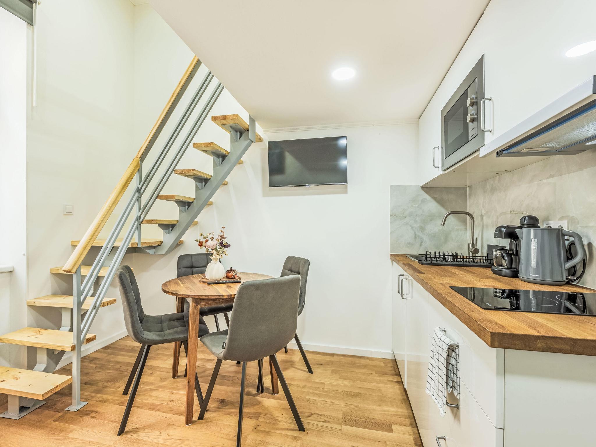2-room apartment 30 m2 on 3rd floor. Bright, fully renovated, very beautiful and modern furnishings: entrance hall. Living/dining room with 1 double sofabed (150 cm, length 200 cm), dining table and TV. Kitchenette (2 induction hot plates, toaster, kettle, microwave, freezer, electric coffee machine). Shower/WC. Upper floor: (steep stair) open gallery with 1 bed (100 cm, length 200 cm), 1 double bed (160 cm, length 200 cm). Facilities: washing machine, baby cot, hair dryer. Internet (WiFi, free). Please note: suitable for families apartment courtyard side. Non-smokers only. Maximum 1 pet/ dog allowed. Smoke alarm, fire extinguisher. Instead of an enclosed bedroom, some sleeping areas are located in an open-plan area (gallery, alcove, etc.).