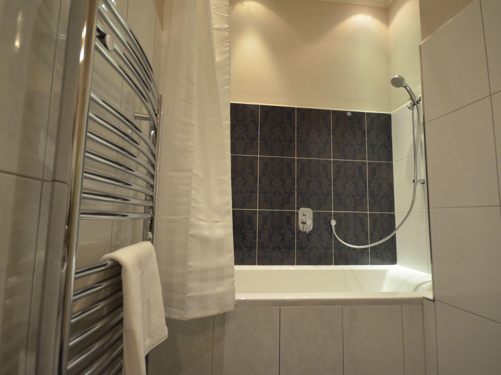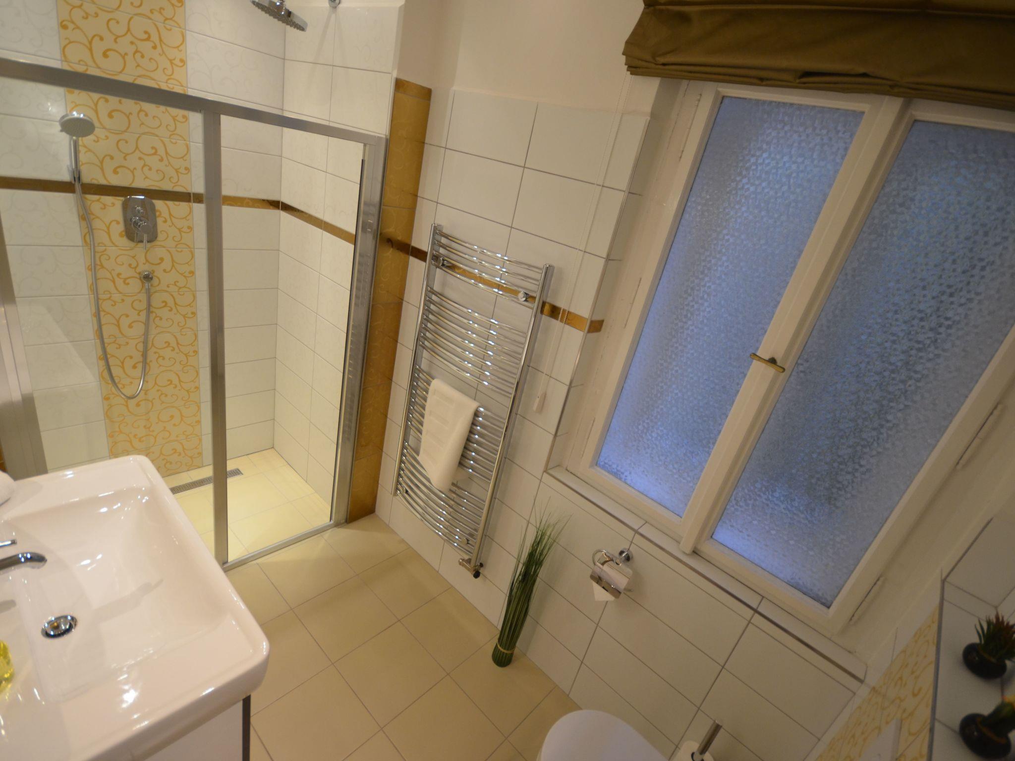 Second bathroom (en suite): walk-in shower, washbasin, WC, hairdryer, digital scale.