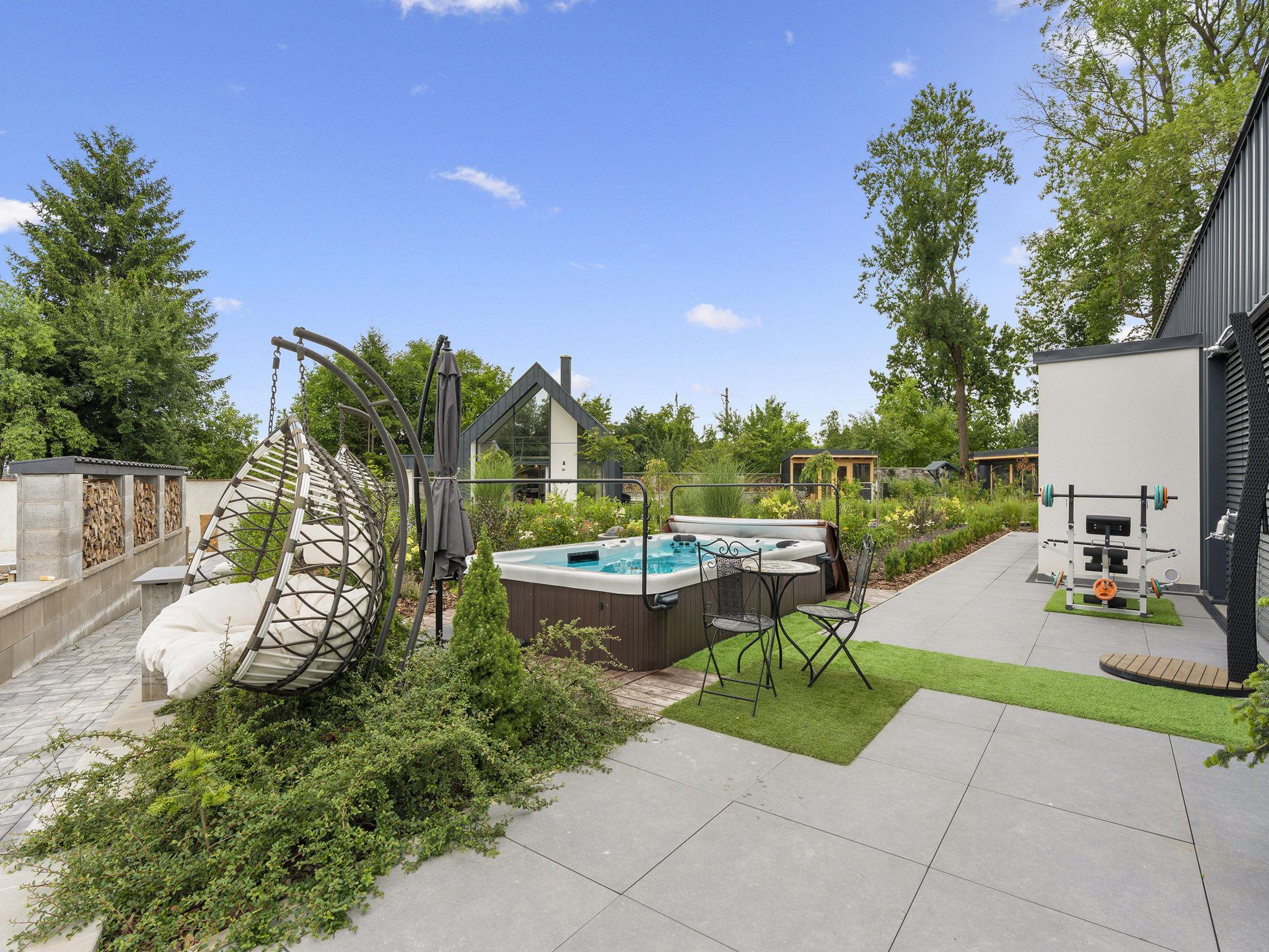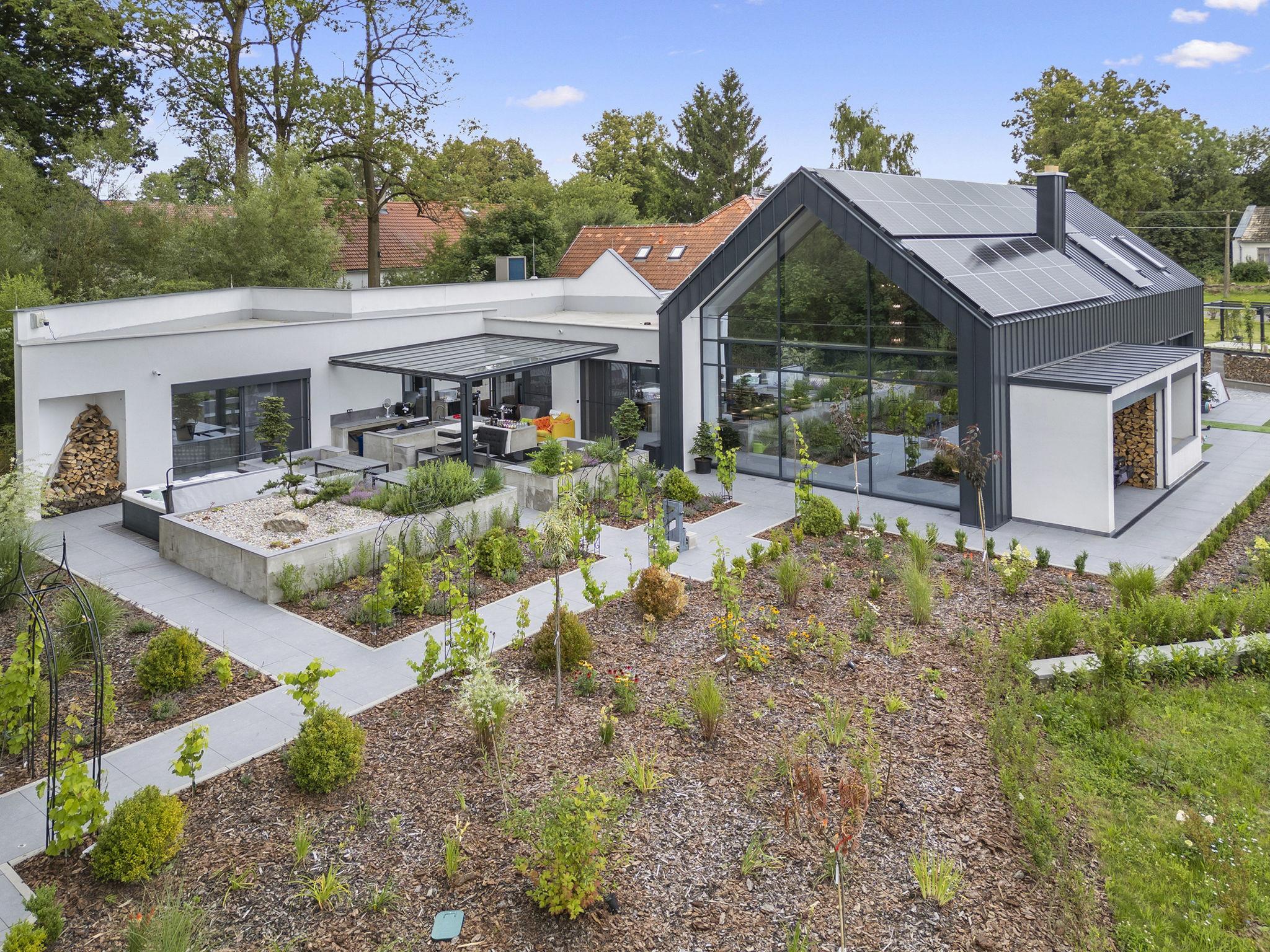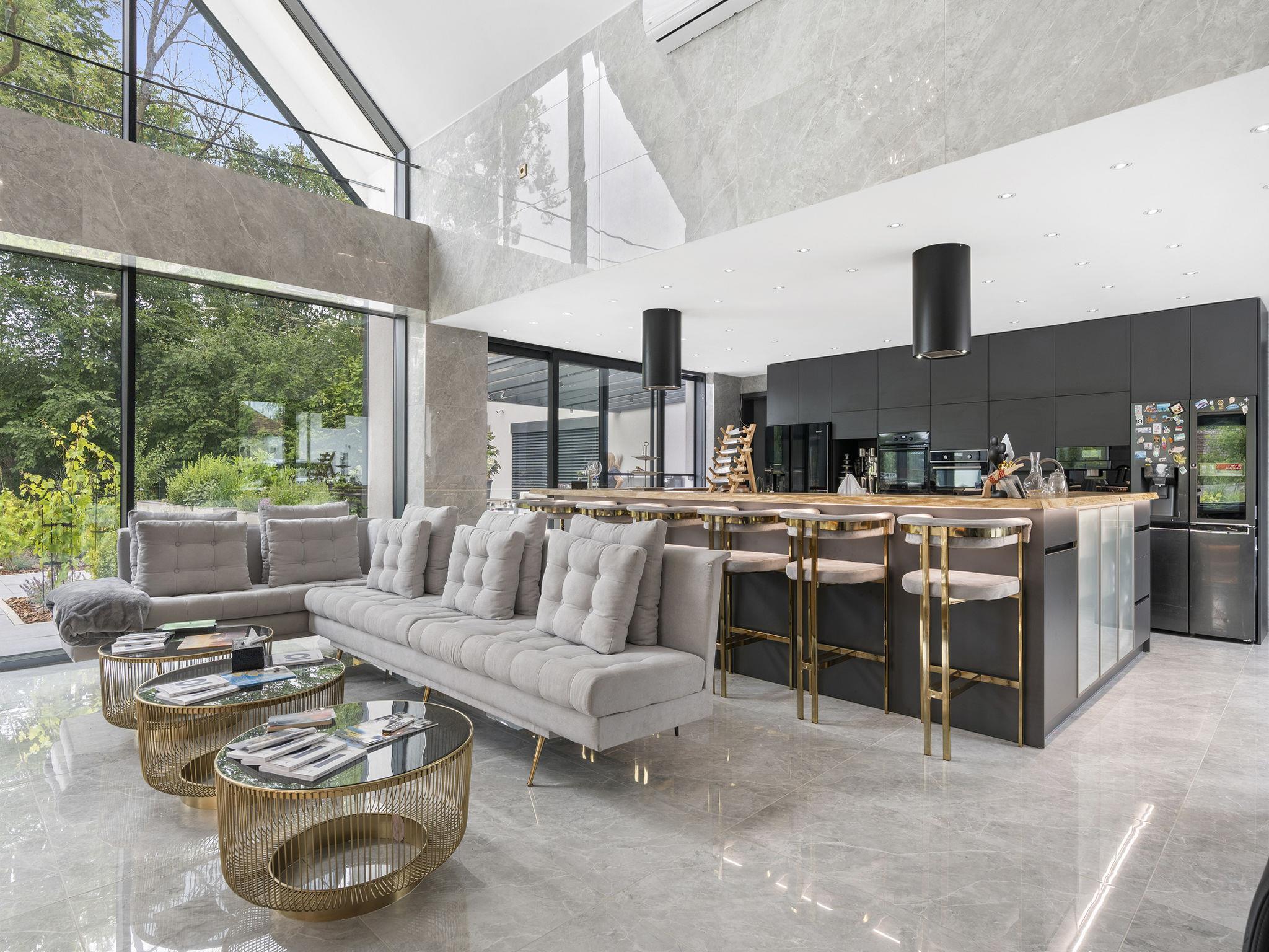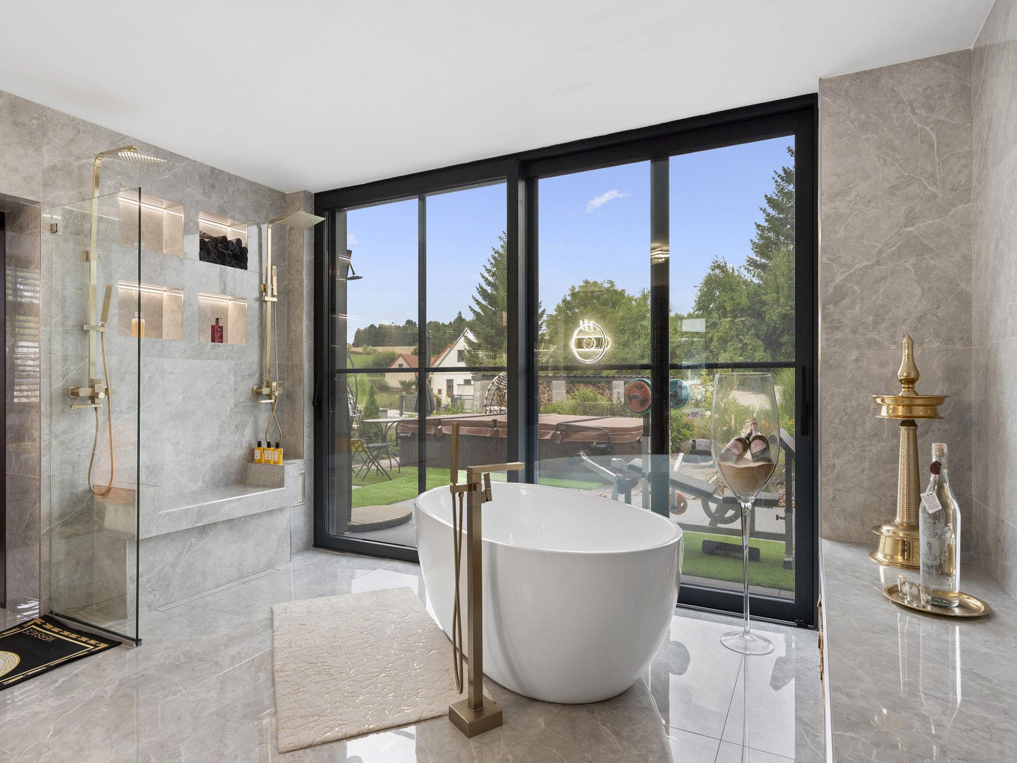 "Ayurvedic Palace", 7-room house 250 m2 on 2 levels. Modern and luxurious furnishings: large living room with hydro massage bath and TV. 1 room with 1 double bed, shower/WC and TV. Walk-through room with shower/WC. 1 room with 1 double bed and TV. Exit to the terrace. 1 room with 1 double bed and TV. Exit to the terrace. Open kitchen (oven, dishwasher, 4 induction hot plates, kettle, microwave, electric coffee machine, Capsules for coffee machine (Nesperesso)) with dining table. Hydro massage bath. Upper floor: 1 room with 1 double bed, shower/WC and TV. 1 room with 1 double bed, shower/WC and TV. Terrace. Terrace furniture. Facilities: Internet (WiFi, free). Please note: non-smoking house. Maximum 2 pets/ dogs allowed. No lift. The dominant feature of this property is an open living room with an unconventional duplex solution (ceiling height 9 meters). Teppanyaki style with seating for 10 people - suitable for cooking courses or other forms of shared gastronomy, which is also reflected in the kitchen equipment: Professional MIELE coffee machine, 3x AEG oven, ice cream maker, chocolate fountain, pancake maker and other professional kitchen equipment. Double-sided fireplace. Indoor hydromassage bathtub for 6 people, 190 diagonal TV, home cinema. 3 x highly efficient electric massage chair with 180 relaxation programs. The indoor Tepanyaki is followed by a summer kitchen with seating for up to 20 people with a grill and tap equipment and cooling for 4 drinks. Private outdoor Swim Spa hydro massage bath with countercurrent (length 4 m). On request: 3 x rooms with 1x bed and 1x double bed (180 cm), shared bathroom with shower and toilet.