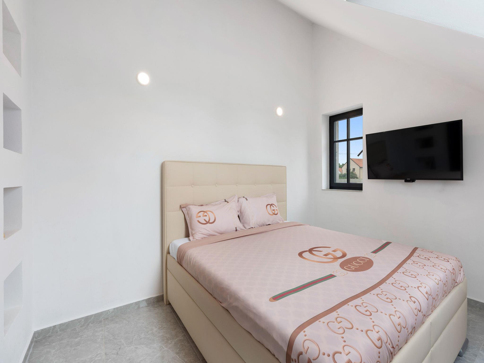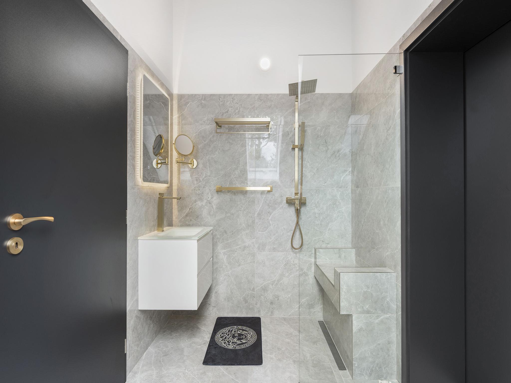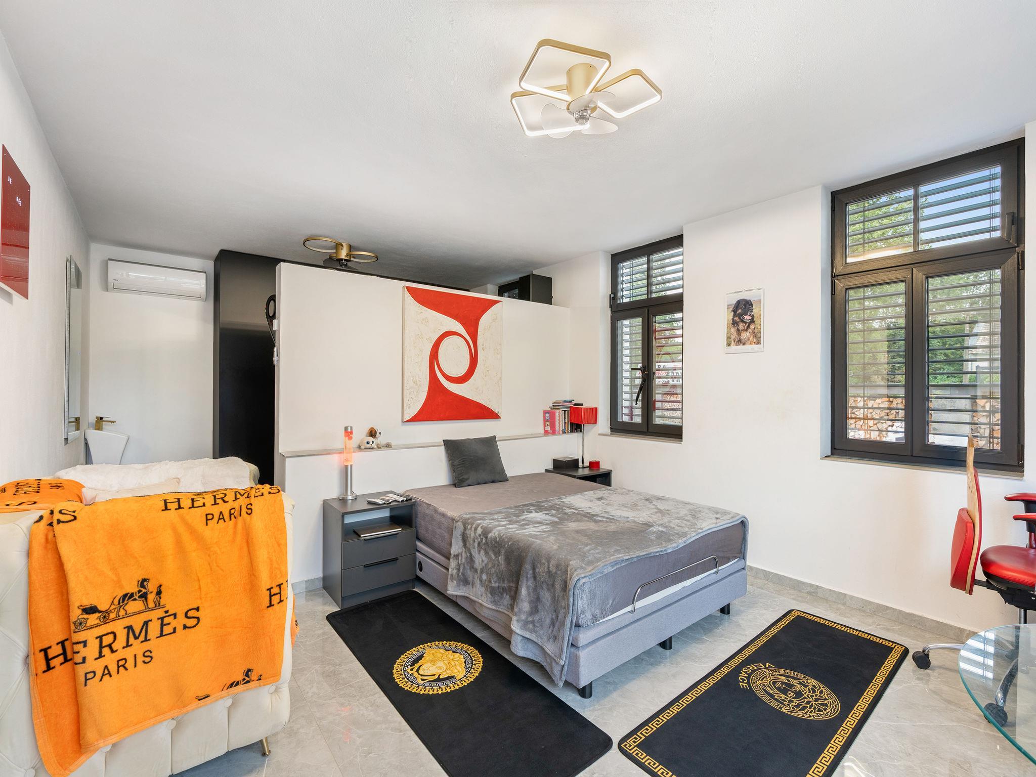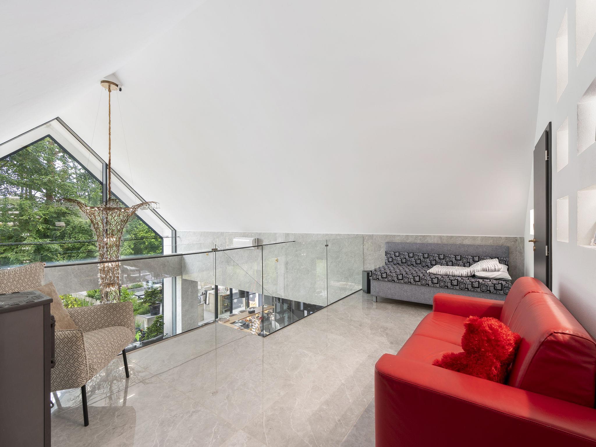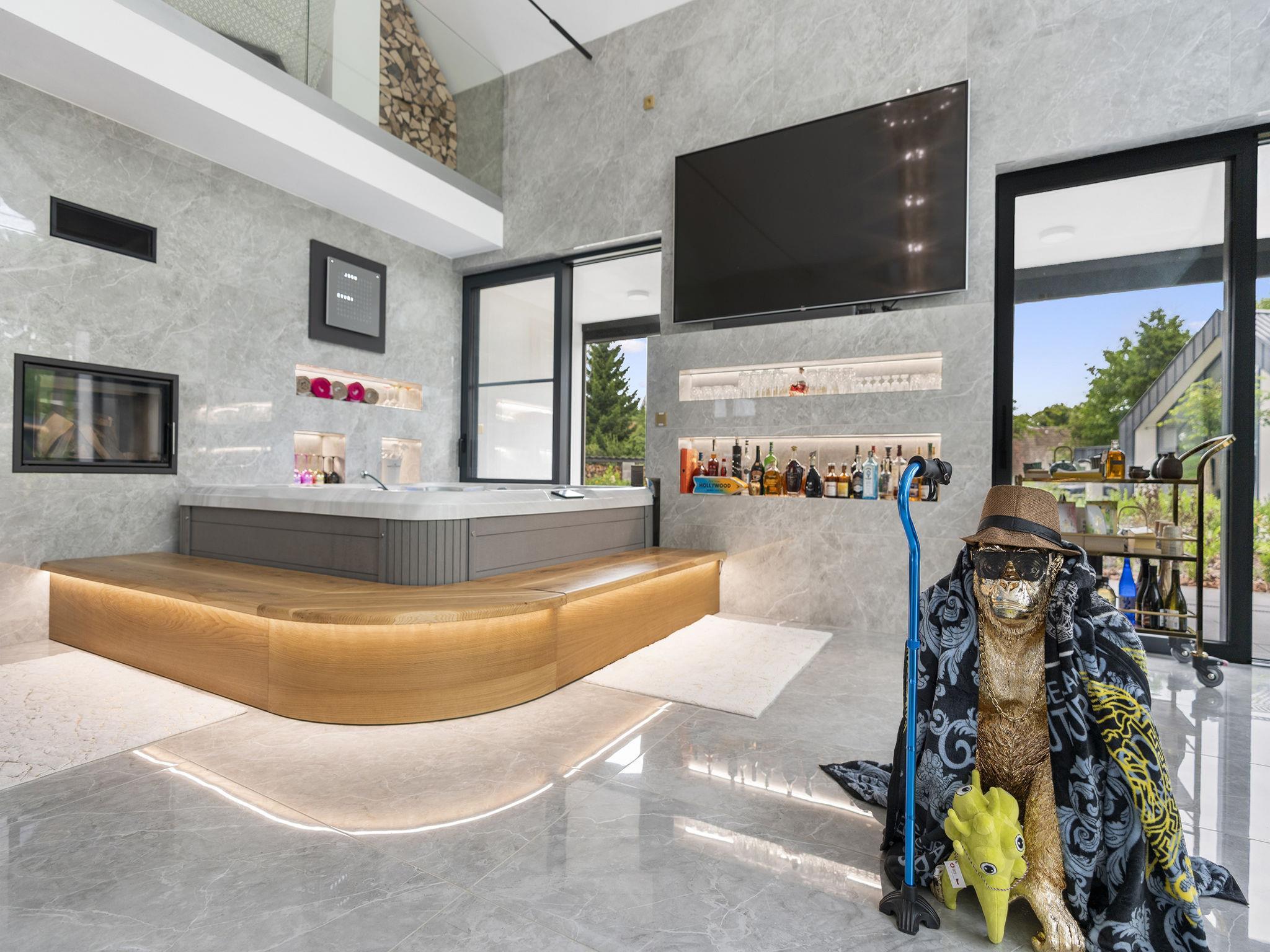 "Ayurvedic Palace", 7-room house 250 m2 on 2 levels. Modern and luxurious furnishings: large living room with hydro massage bath and TV. 1 room with 1 double bed, shower/WC and TV. Walk-through room with shower/WC. 1 room with 1 double bed and TV. Exit to the terrace. 1 room with 1 double bed and TV. Exit to the terrace. Open kitchen (oven, dishwasher, 4 induction hot plates, kettle, microwave, electric coffee machine, Capsules for coffee machine (Nesperesso)) with dining table. Hydro massage bath. Upper floor: 1 room with 1 double bed, shower/WC and TV. 1 room with 1 double bed, shower/WC and TV. Terrace. Terrace furniture. Facilities: Internet (WiFi, free). Please note: non-smoking house. Maximum 2 pets/ dogs allowed. No lift. The dominant feature of this property is an open living room with an unconventional duplex solution (ceiling height 9 meters). Teppanyaki style with seating for 10 people - suitable for cooking courses or other forms of shared gastronomy, which is also reflected in the kitchen equipment: Professional MIELE coffee machine, 3x AEG oven, ice cream maker, chocolate fountain, pancake maker and other professional kitchen equipment. Double-sided fireplace. Indoor hydromassage bathtub for 6 people, 190 diagonal TV, home cinema. 3 x highly efficient electric massage chair with 180 relaxation programs. The indoor Tepanyaki is followed by a summer kitchen with seating for up to 20 people with a grill and tap equipment and cooling for 4 drinks. Private outdoor Swim Spa hydro massage bath with countercurrent (length 4 m). On request: 3 x rooms with 1x bed and 1x double bed (180 cm), shared bathroom with shower and toilet.