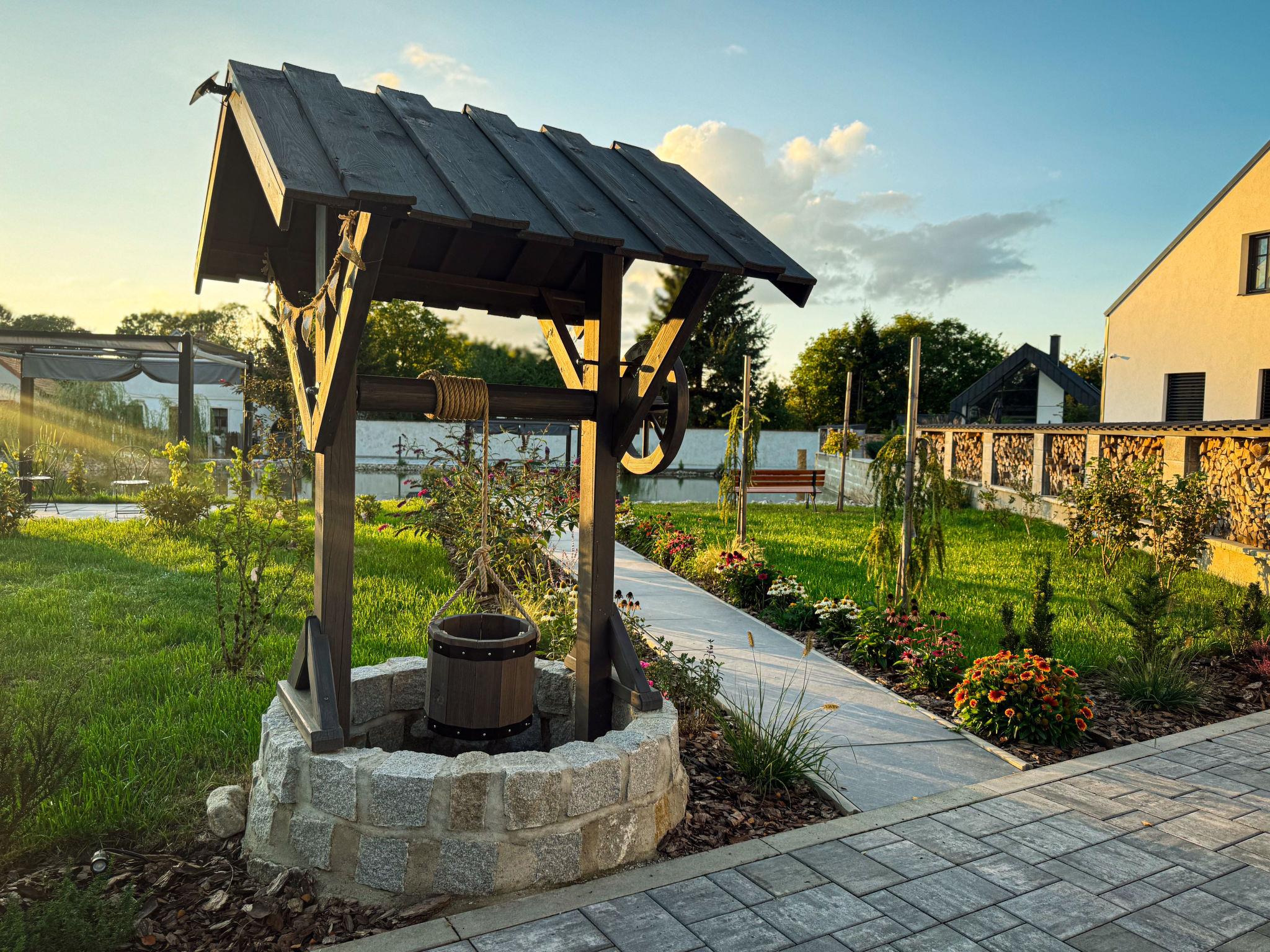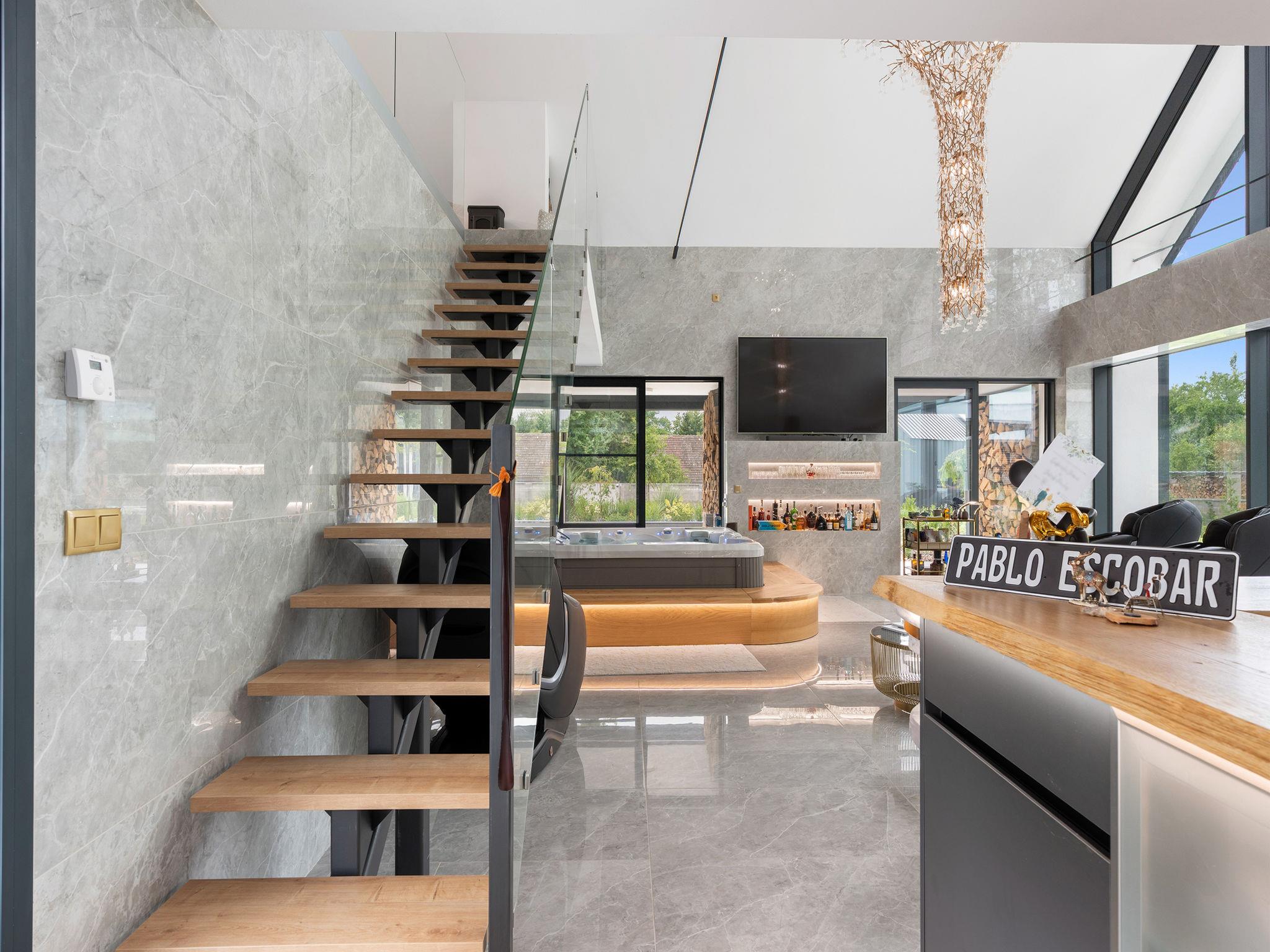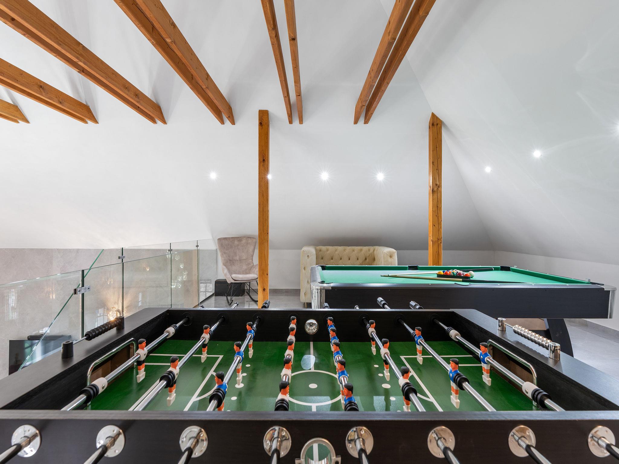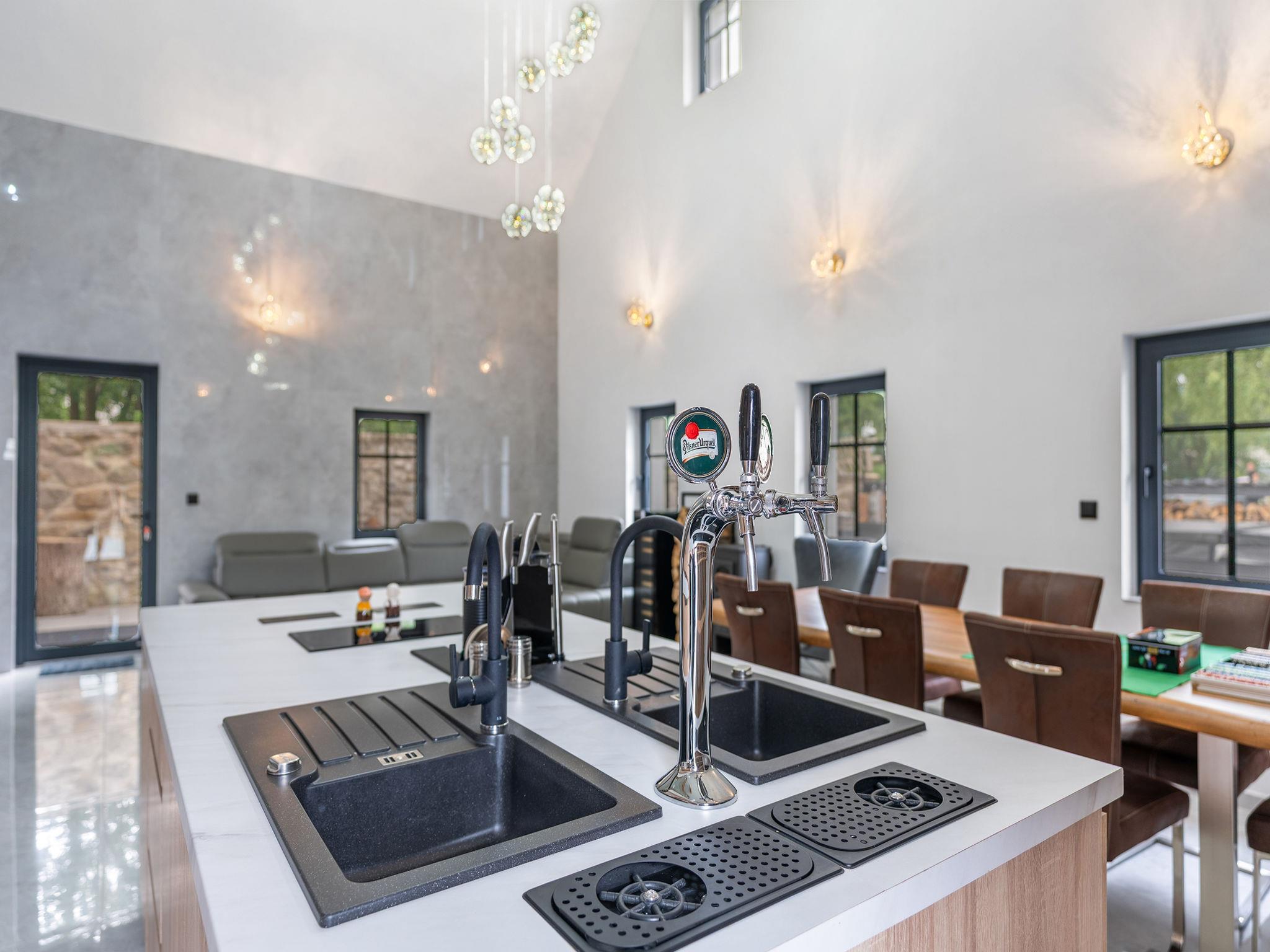 "Luxury Retreat Resort", 15-room house 550 m2 on 2 levels. Spacious, modern and luxurious furnishings: open living room with 1 double sofabed, open-hearth fireplace and TV. 1 room with 1 double bed (180 cm), shower/WC and TV. 1 room with 1 bed and 1 double bed (180 cm), shower/WC. Open living room with open-hearth fireplace, dining table, kitchen corner, TV and air conditioning. 1 room with 1 double bed (160 cm), TV. Large living room with dining table, kitchen corner, hydro massage shower and TV. 1 room with 1 double bed, bath/WC and TV. Walk-through room with bath/WC. 1 room with 1 double bed and TV. Exit to the terrace. 1 room with 1 double bed and TV. Exit to the terrace. Open kitchen (oven, dishwasher, 4 induction hot plates, toaster, kettle, microwave, electric coffee machine, Capsules for coffee machine (Nesperesso)) with dining table. Shower/WC, hydro massage bath. Upper floor: 1 room with 1 double bed (180 cm), shower/WC. Playroom with 1 bed and TV. Open gallery with Dressing room with 1 double bed (180 cm), bathroom. 1 room with 1 double bed, bath/WC and TV. 1 room with 1 double bed, shower/WC and TV. Sep. WC, hydro massage bath (private). Large terrace 40 m2, terrace 25 m2. Terrace furniture, barbecue (portable). Beautiful view of the garden. Facilities: washing machine, dryer. Internet (WiFi, free). E-charging station. Please note: non-smoking house. Maximum 2 pets/ dogs allowed. No lift. Available in the complex: 3 x grill, 4 x hydro massage bath, 1 x Swimm Spa with counter-current, stainless steel heating barrel for 6 people, sauna, petanque court, gazebo on the pond, summer kitchen with seating for up to 20 people with grill and tap equipment and cooling for 4 drinks. On request: 3 x room with 1x bed and 1x double bed (180 cm) and shared bathroom with shower and toilet.