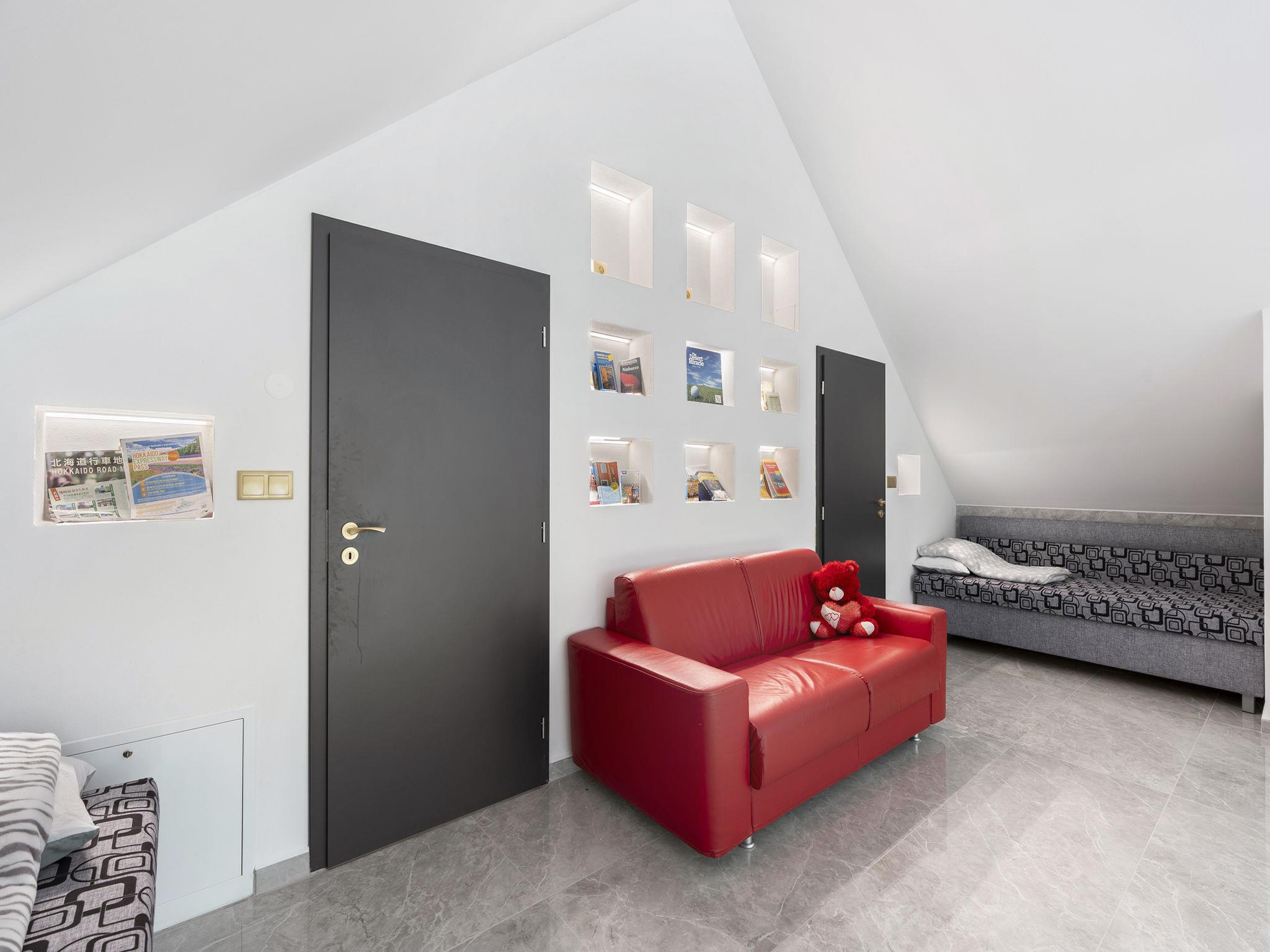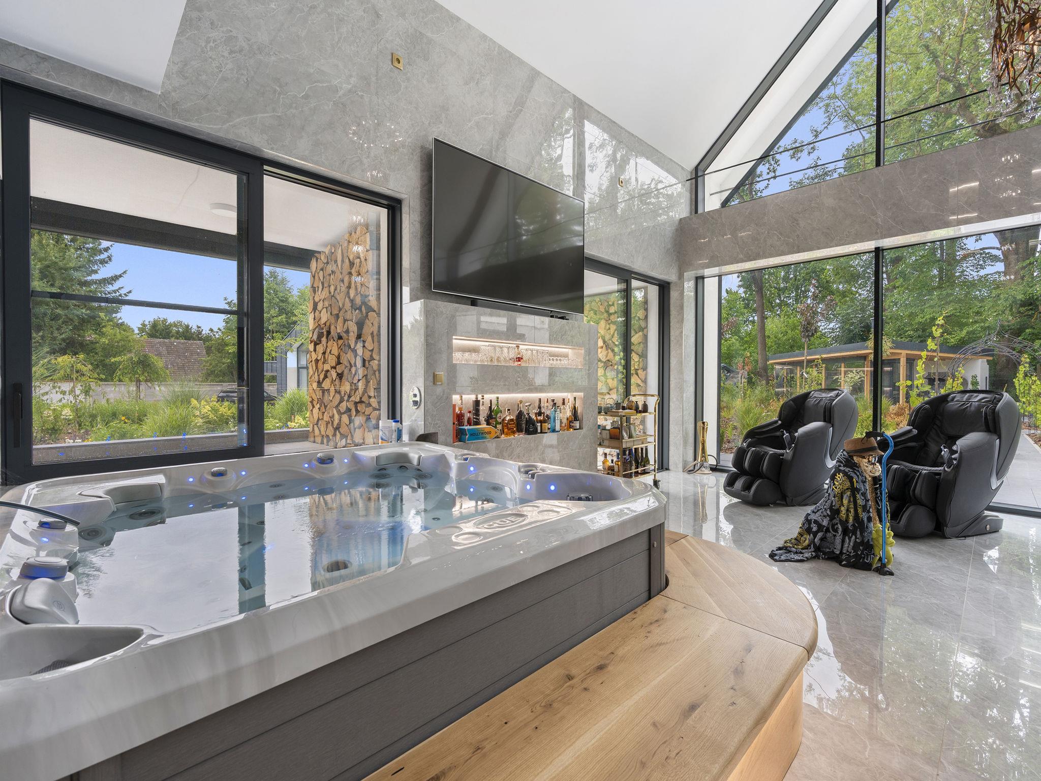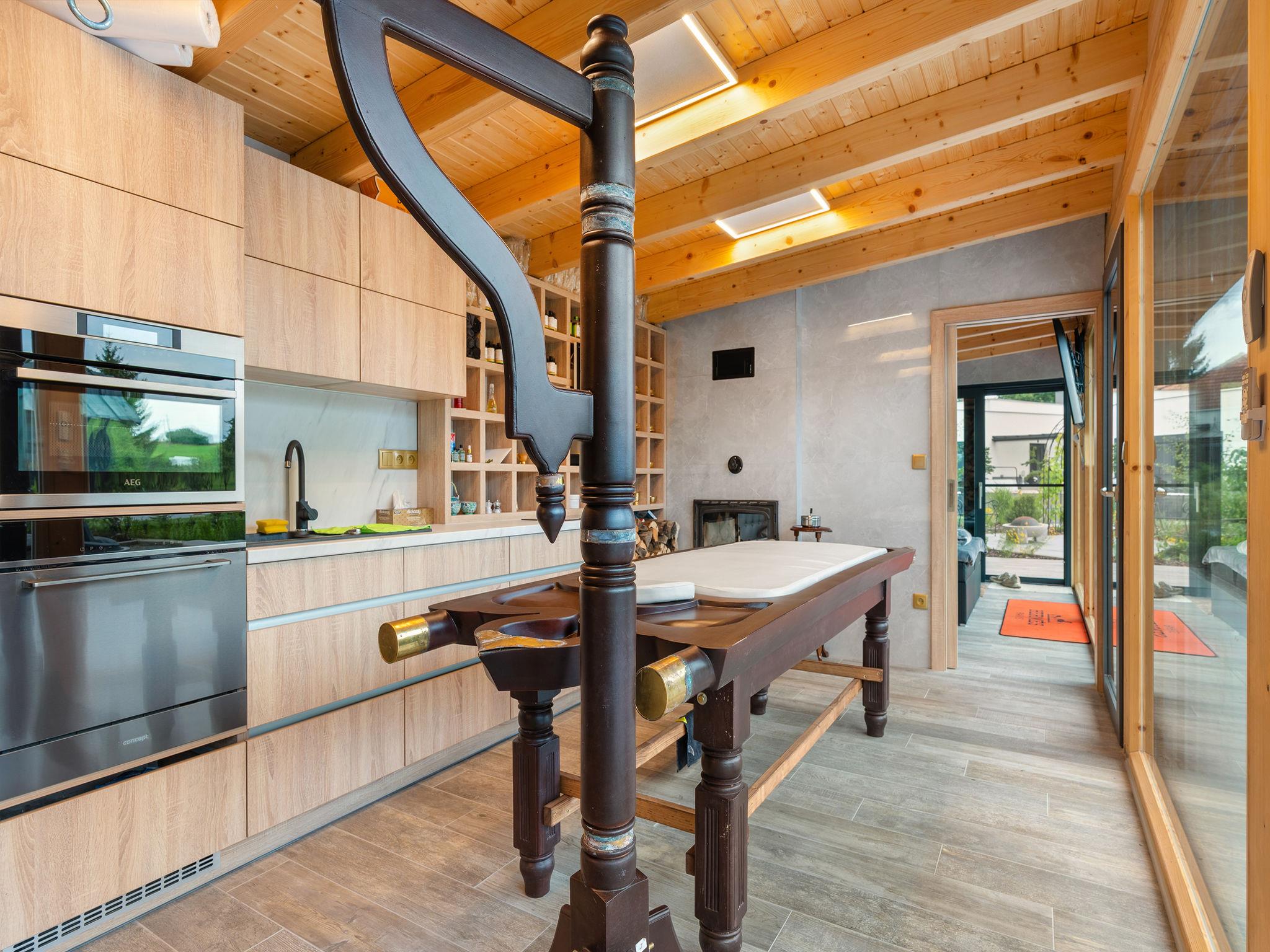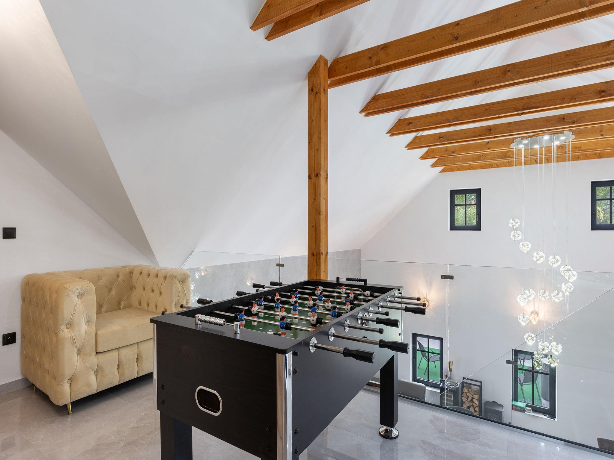 "Luxury Retreat Resort", 15-room house 550 m2 on 2 levels. Spacious, modern and luxurious furnishings: open living room with 1 double sofabed, open-hearth fireplace and TV. 1 room with 1 double bed (180 cm), shower/WC and TV. 1 room with 1 bed and 1 double bed (180 cm), shower/WC. Open living room with open-hearth fireplace, dining table, kitchen corner, TV and air conditioning. 1 room with 1 double bed (160 cm), TV. Large living room with dining table, kitchen corner, hydro massage shower and TV. 1 room with 1 double bed, bath/WC and TV. Walk-through room with bath/WC. 1 room with 1 double bed and TV. Exit to the terrace. 1 room with 1 double bed and TV. Exit to the terrace. Open kitchen (oven, dishwasher, 4 induction hot plates, toaster, kettle, microwave, electric coffee machine, Capsules for coffee machine (Nesperesso)) with dining table. Shower/WC, hydro massage bath. Upper floor: 1 room with 1 double bed (180 cm), shower/WC. Playroom with 1 bed and TV. Open gallery with Dressing room with 1 double bed (180 cm), bathroom. 1 room with 1 double bed, bath/WC and TV. 1 room with 1 double bed, shower/WC and TV. Sep. WC, hydro massage bath (private). Large terrace 40 m2, terrace 25 m2. Terrace furniture, barbecue (portable). Beautiful view of the garden. Facilities: washing machine, dryer. Internet (WiFi, free). E-charging station. Please note: non-smoking house. Maximum 2 pets/ dogs allowed. No lift. Available in the complex: 3 x grill, 4 x hydro massage bath, 1 x Swimm Spa with counter-current, stainless steel heating barrel for 6 people, sauna, petanque court, gazebo on the pond, summer kitchen with seating for up to 20 people with grill and tap equipment and cooling for 4 drinks. On request: 3 x room with 1x bed and 1x double bed (180 cm) and shared bathroom with shower and toilet.