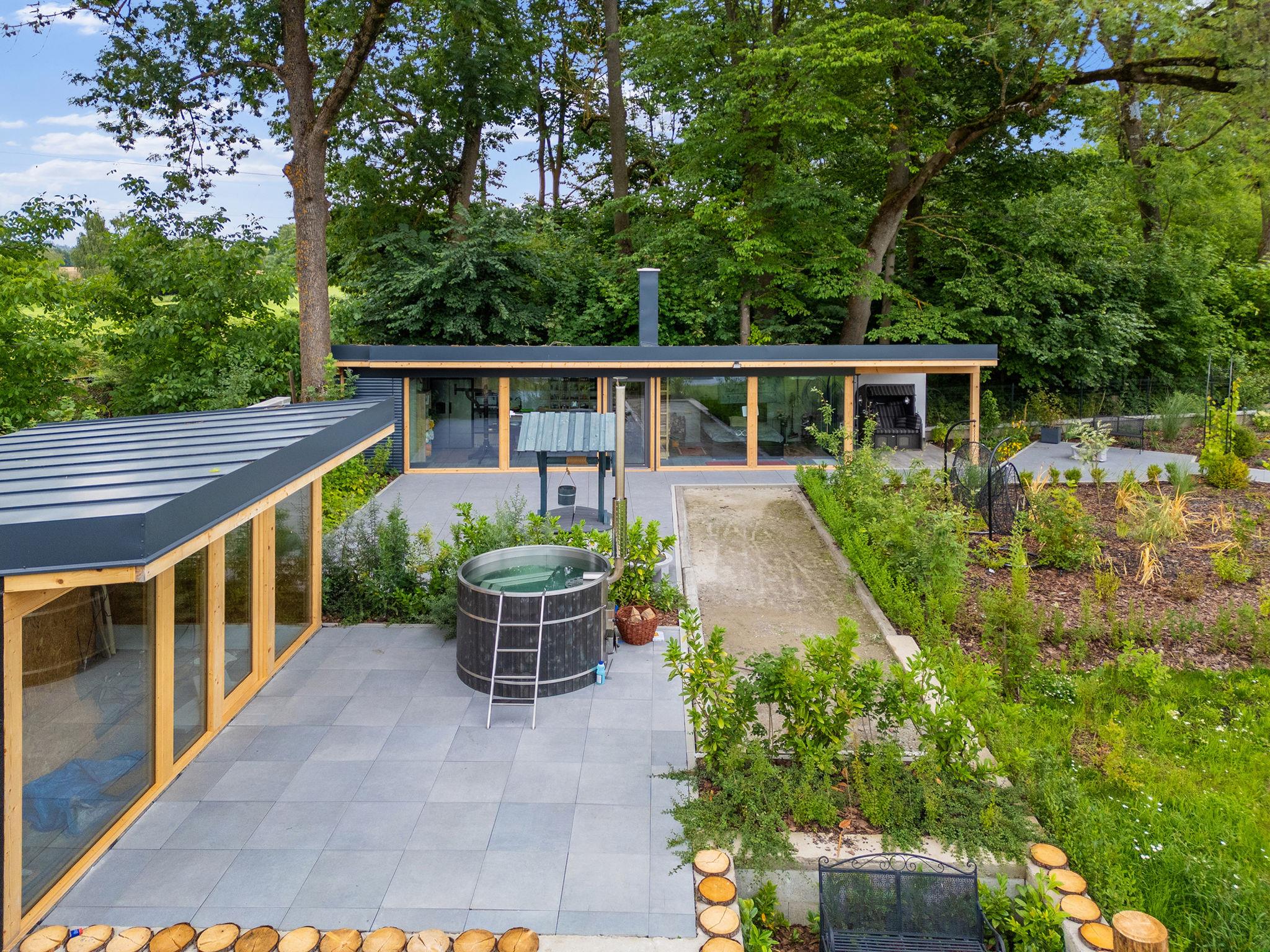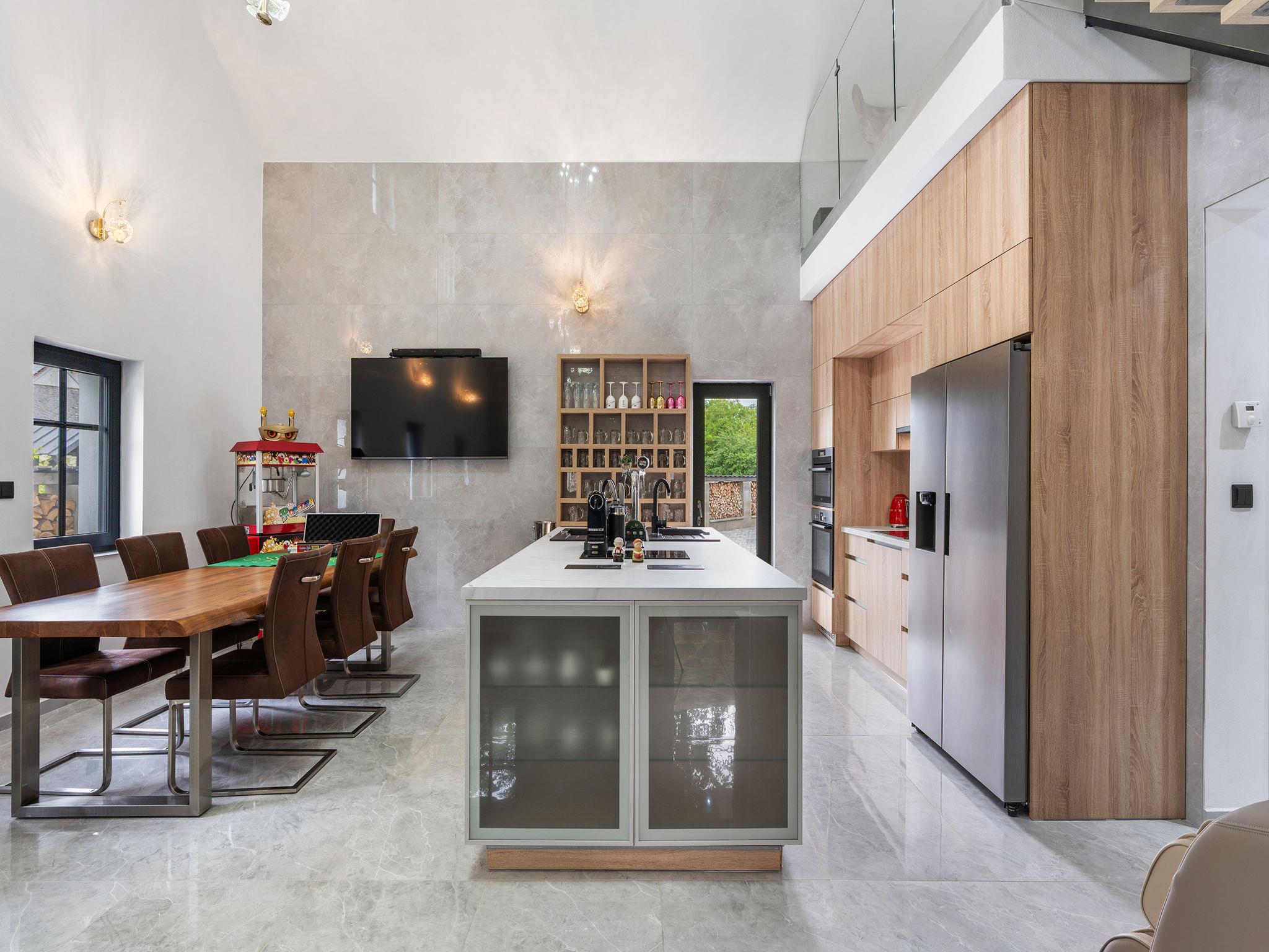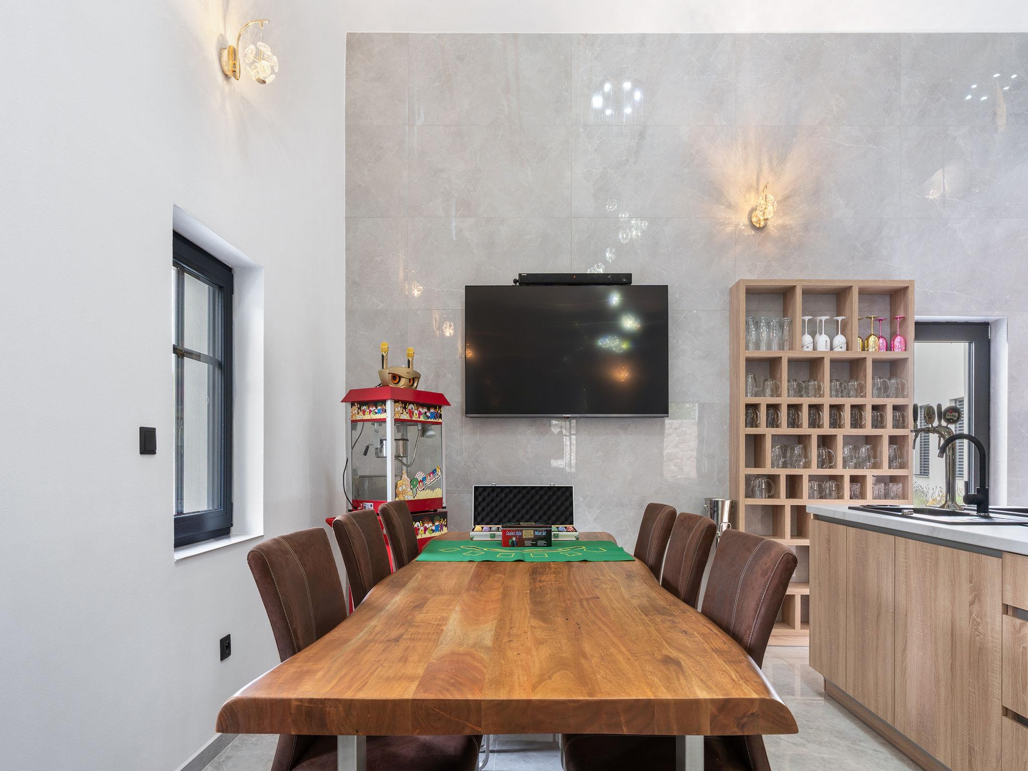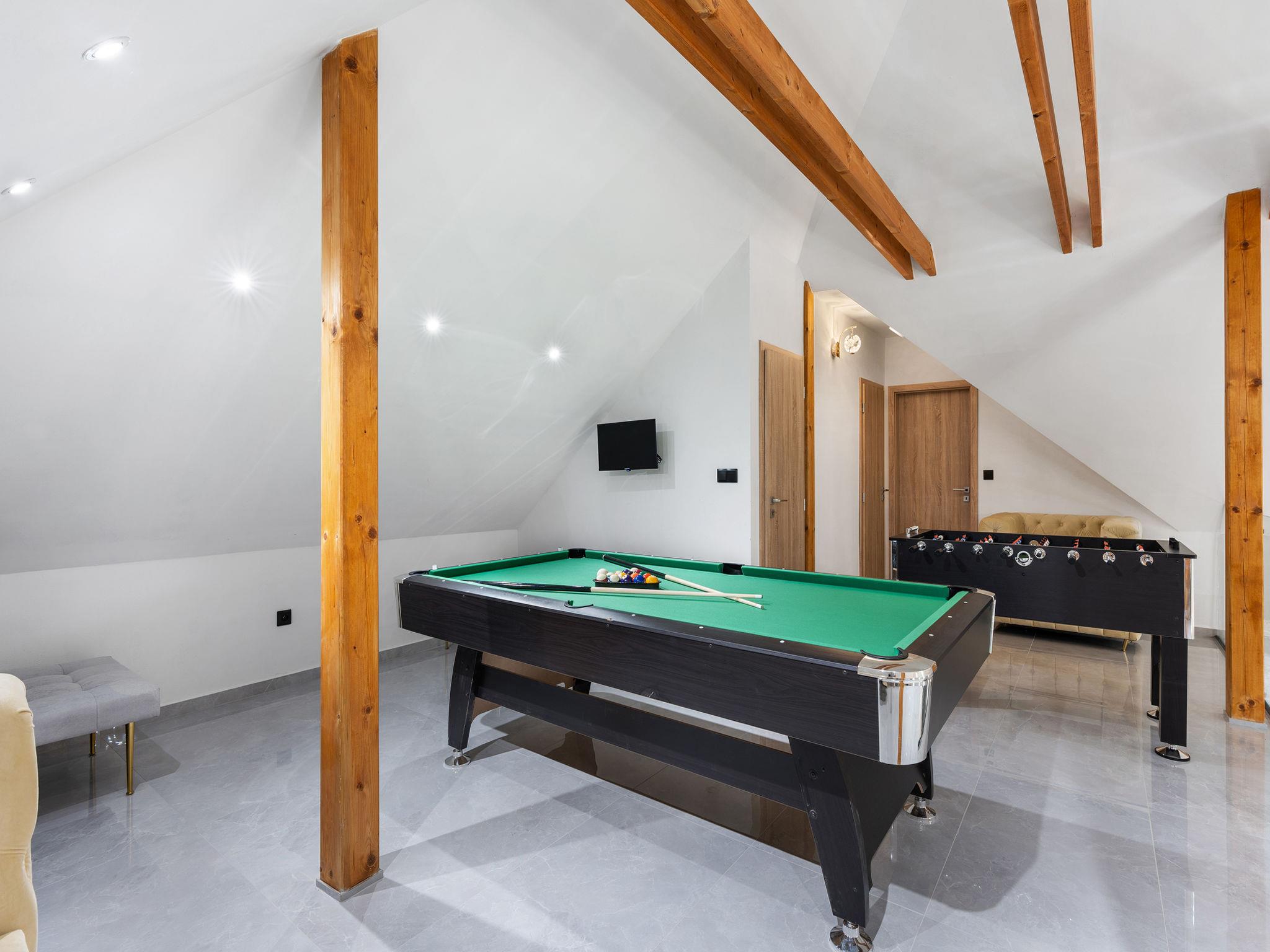 "Luxury Retreat Resort", 15-room house 550 m2 on 2 levels. Spacious, modern and luxurious furnishings: open living room with 1 double sofabed, open-hearth fireplace and TV. 1 room with 1 double bed (180 cm), shower/WC and TV. 1 room with 1 bed and 1 double bed (180 cm), shower/WC. Open living room with open-hearth fireplace, dining table, kitchen corner, TV and air conditioning. 1 room with 1 double bed (160 cm), TV. Large living room with dining table, kitchen corner, hydro massage shower and TV. 1 room with 1 double bed, bath/WC and TV. Walk-through room with bath/WC. 1 room with 1 double bed and TV. Exit to the terrace. 1 room with 1 double bed and TV. Exit to the terrace. Open kitchen (oven, dishwasher, 4 induction hot plates, toaster, kettle, microwave, electric coffee machine, Capsules for coffee machine (Nesperesso)) with dining table. Shower/WC, hydro massage bath. Upper floor: 1 room with 1 double bed (180 cm), shower/WC. Playroom with 1 bed and TV. Open gallery with Dressing room with 1 double bed (180 cm), bathroom. 1 room with 1 double bed, bath/WC and TV. 1 room with 1 double bed, shower/WC and TV. Sep. WC, hydro massage bath (private). Large terrace 40 m2, terrace 25 m2. Terrace furniture, barbecue (portable). Beautiful view of the garden. Facilities: washing machine, dryer. Internet (WiFi, free). E-charging station. Please note: non-smoking house. Maximum 2 pets/ dogs allowed. No lift. Available in the complex: 3 x grill, 4 x hydro massage bath, 1 x Swimm Spa with counter-current, stainless steel heating barrel for 6 people, sauna, petanque court, gazebo on the pond, summer kitchen with seating for up to 20 people with grill and tap equipment and cooling for 4 drinks. On request: 3 x room with 1x bed and 1x double bed (180 cm) and shared bathroom with shower and toilet.