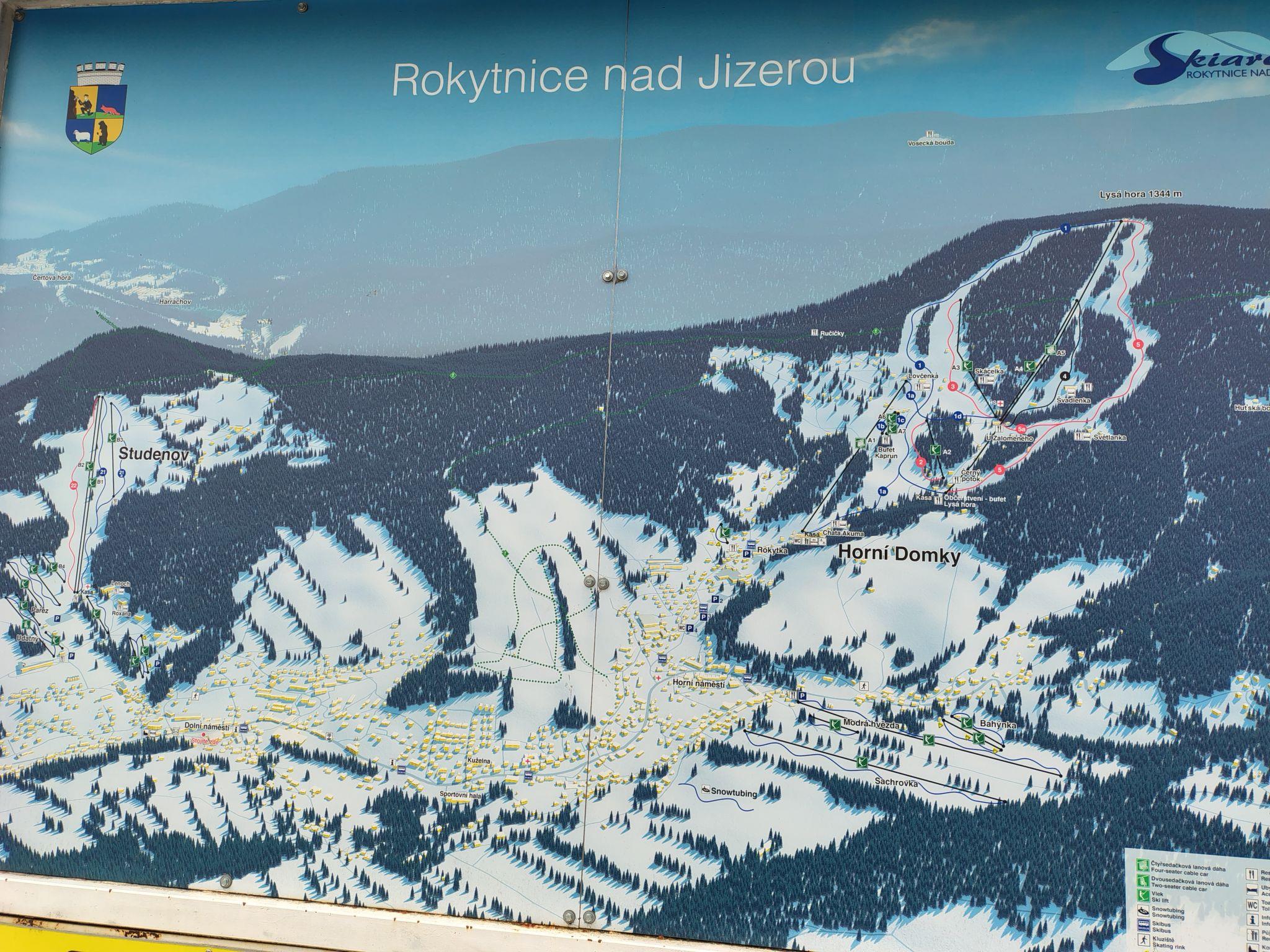Beautiful apartment block "Rosie-Dolní námestí", 3 storeys, built in 1998. In the centre of Rokytnice nad Jizerou, in a central, sunny position, in the heart of the city, 500 m from the skiing area. In the house: central heating system. Parking, public parking extra. Supermarket, restaurant, café 50 m, bus stop "Rokytnice nad Jizerou, nám." 100 m. Ski lift 500 m, ski bus stop 100 m, ski school 500 m. Nearby attractions: Stráž 2.5 km, Hutský vodopád 4.2 km, Františkov 3.2 km. Well-known ski regions can easily be reached: Rokytnice nad Jizerou 3 km, Harrachov 6.5 km, Paseky nad Jizerou 5 km. Hiking paths: Dvoracky 6 km, Labská bouda 12 km, szrenica 11 km.