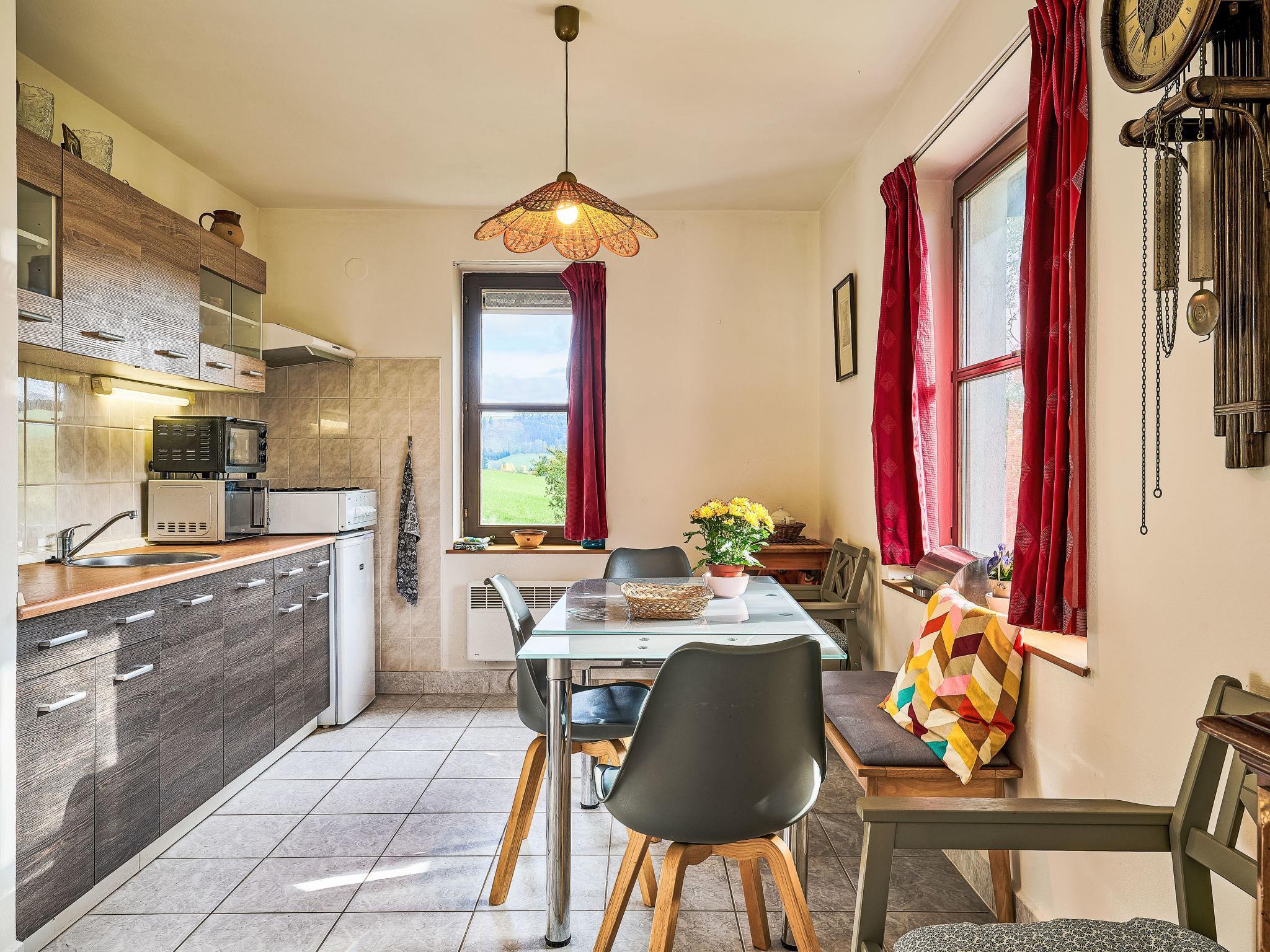 Stárkov 18 km from Náchod: Resort "Stárkov", 450 m a.s.l., detached, built in 1997, renovated, surrounded by meadows. 22 houses in the resort. On the outskirts, in a sunny, elevated position on a slope, along the wooded area, 24 km from the lake, 10 km from the skiing area, in the countryside. For shared use: property 10 ha, meadow, pond, swimming pool (8 x 4 m, depth 150 cm, seasonal availability: 15.Jun. - 16.Sep.). Table tennis, volleyball, badminton, volleyball court, beach volleyball, patio, barbecue, fireplace, children's playground (slide, swing, sandbox). In the complex: reception, lounge, bistro, massage (extra). Billiard table, table football, trampoline, kiosk, storage room for bicycles, laundry (extra). Linen change (suppl. charge extra). Towel change (suppl. charge extra). Room cleaning on request (extra). Bread roll service possible on request. Pre-arrival grocery service. Motor access to 200 m from the house. Parking at the house. Grocery 1 km, supermarket 8 km, restaurant 1 km, café 10 m, bus stop "Stárkov,mlékárna" 280 m, railway station "Ždár nad Metují" 4.6 km, indoor swimming pool 18 km. Golf course (9 hole) 26 km, sailing school 26 km, tennis 500 m, riding stable, walking paths from the house, cycle lane 10 m, ski lift 6 km, ski school 17 km, cross country ski track 100 m, ice rink 8 km, children's playground 10 m. Nearby attractions: Adršpašsko-teplické skály 15 km, Náchod 17 km, Broumovské steny 17 km, Ratiborice a Babiccino údolí 22 km, Broumov 24 km, Relaxpark Pec pod Snežkou 50 km. Well-known ski regions can easily be reached: Radvanice 10 km, Petríkovice 17 km, Mladé Buky 36 km. Well-known lakes can easily be reached: vodní nádrž Rozkoš 26 km. Please note: suitable for families, suitable for seniors baby equipment on request (included).