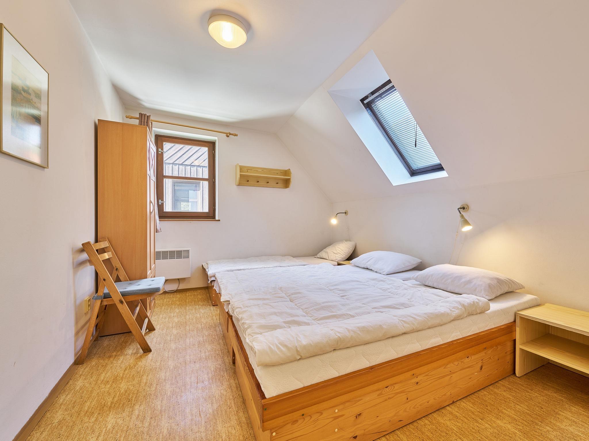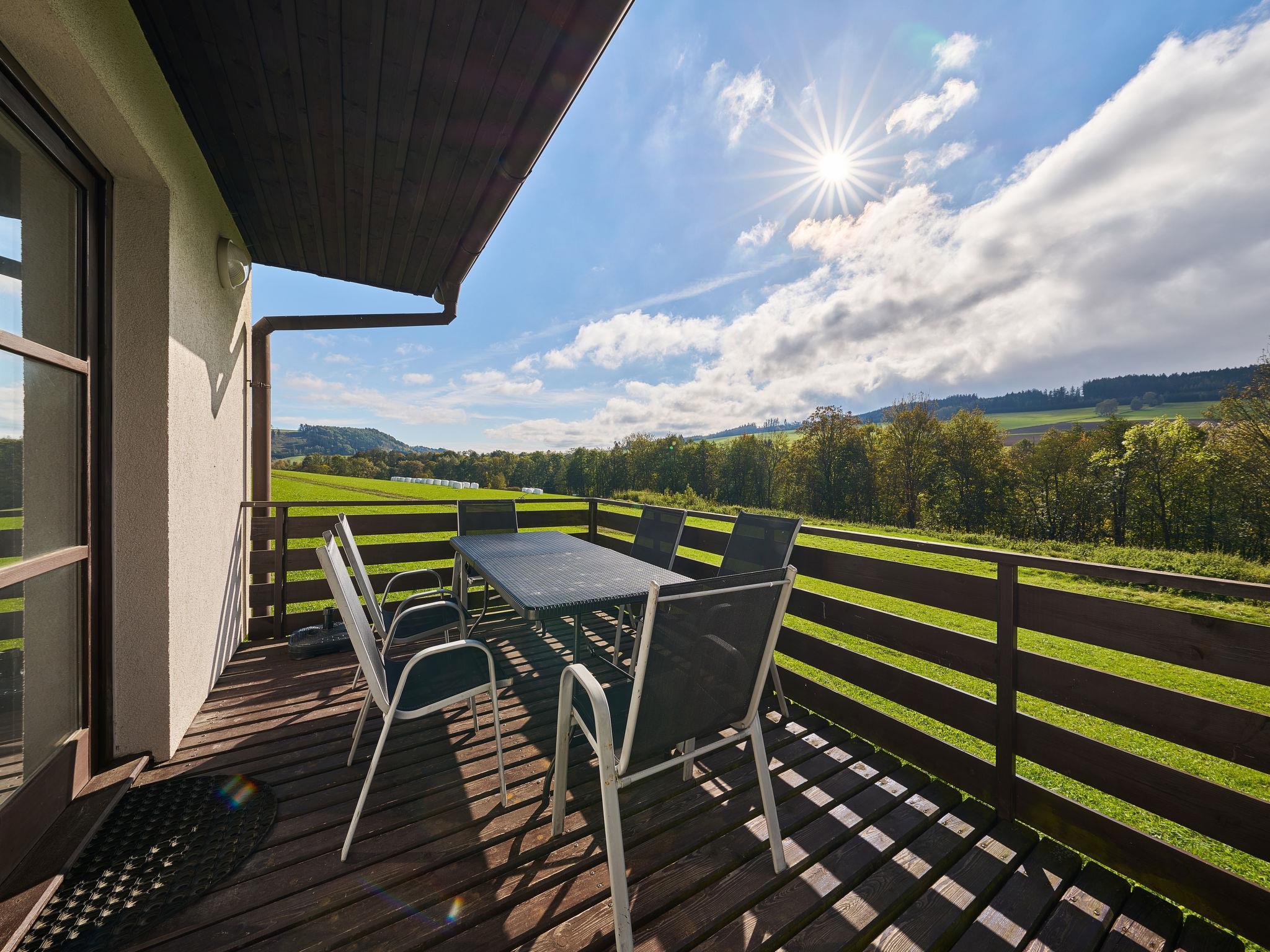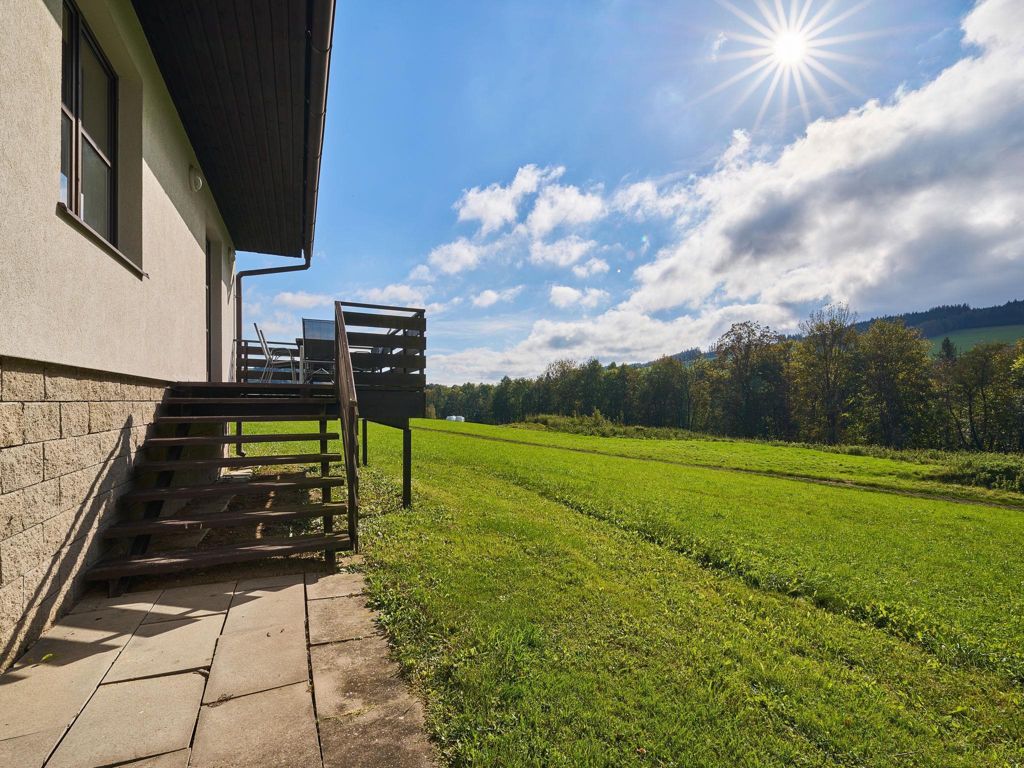 Stárkov 18 km from Náchod: Resort "Stárkov", 450 m a.s.l., semi-detached, built in 1997, surrounded by meadows. 22 houses in the resort. On the outskirts, in a sunny, elevated position on a slope, along the wooded area, 24 km from the lake, 10 km from the skiing area, in the countryside. For shared use: property 10 ha, meadow, pond, swimming pool (8 x 4 m, depth 150 cm, seasonal availability: 15.Jun. - 16.Sep.). Table tennis, volleyball, badminton, volleyball court, beach volleyball, patio, barbecue, fireplace, children's playground (slide, swing, sandbox). In the complex: reception, lounge, bistro, massage (extra). Billiard table, table football, trampoline, kiosk, storage room for bicycles, laundry (extra). Linen change (suppl. charge extra). Towel change (suppl. charge extra). Room cleaning on request (extra). Bread roll service possible on request. Pre-arrival grocery service. Motor access to 200 m from the house. Parking at the house. Grocery 1 km, supermarket 8 km, restaurant 1 km, café 10 m, bus stop "Stárkov,mlékárna" 280 m, railway station "Ždár nad Metují" 4.6 km, indoor swimming pool 18 km. Golf course (9 hole) 26 km, sailing school 26 km, tennis 500 m, riding stable, walking paths from the house, cycle lane 10 m, ski lift 6 km, ski school 17 km, cross country ski track 100 m, ice rink 8 km, children's playground 10 m. Nearby attractions: Adršpašsko-teplické skály 15 km, Náchod 17 km, Broumovské steny 17 km, Ratiborice a Babiccino údolí 22 km, Broumov 24 km, Relaxpark Pec pod Snežkou 50 km. Well-known ski regions can easily be reached: Radvanice 10 km, Petríkovice 17 km, Mladé Buky 36 km. Well-known lakes can easily be reached: vodní nádrž Rozkoš 26 km. Please note: suitable for families, suitable for seniors baby equipment on request (included).