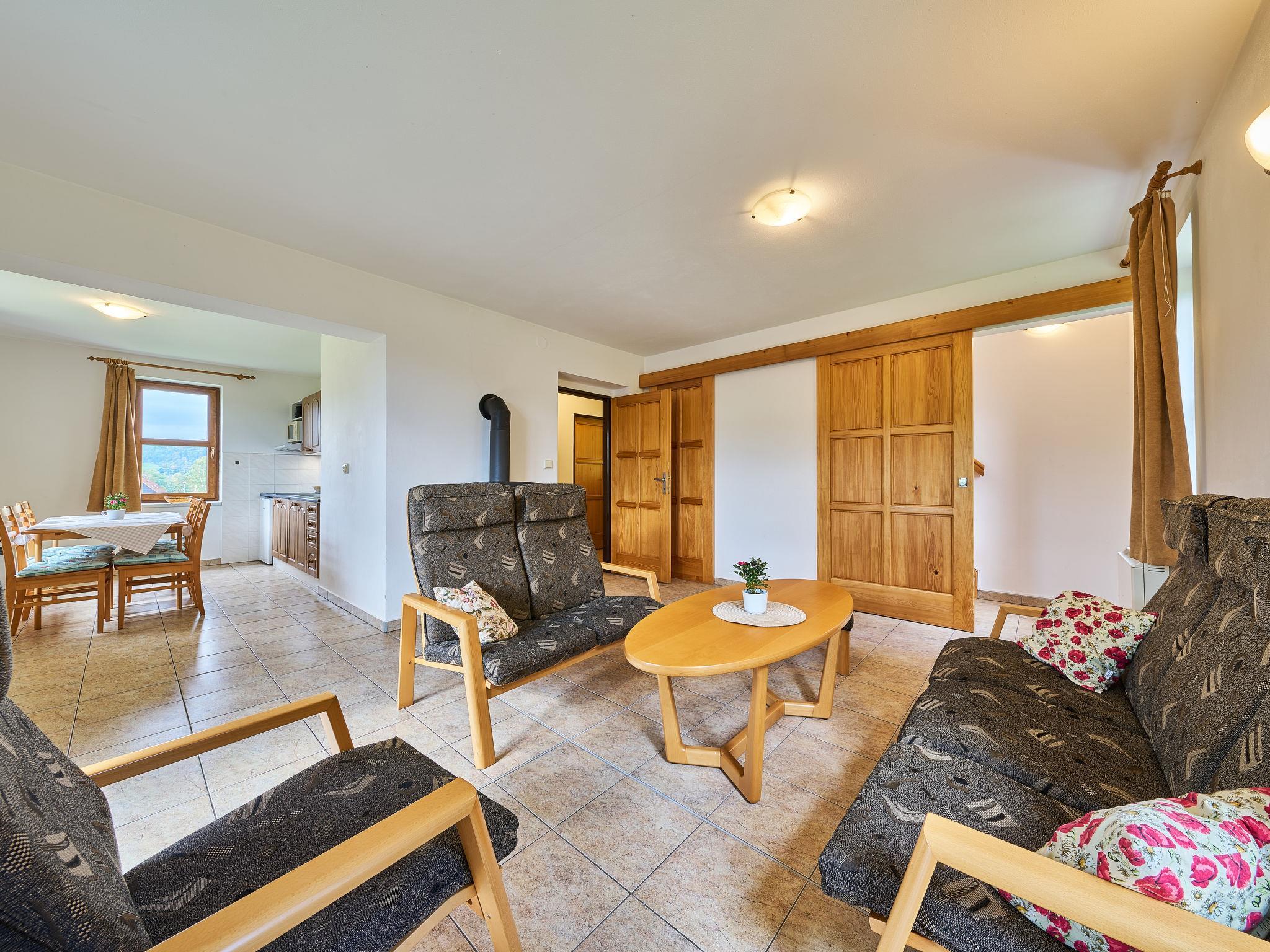 4-room chalet 100 m2 on 2 levels. Bright, fully renovated, cosy furnishings: living room with Scandinavian wood stove, satellite TV and flat screen. Exit to the terrace. Open kitchen (4 hot plates, toaster, kettle, microwave, freezer, electric coffee machine) with dining table. Bath/WC, sep. WC. Electric heating. Upper floor: 1 room with 2 beds. 1 room with 2 beds. 1 room with 1 double bed. Sep. WC. Terrace 11 m2. Terrace furniture. Beautiful panoramic view of the valley and the countryside. Facilities: iron, children's high chair, baby cot (extra). Internet (WiFi, extra). Please note: suitable for families. Non-smoking house. Maximum 2 pets/ dogs allowed.