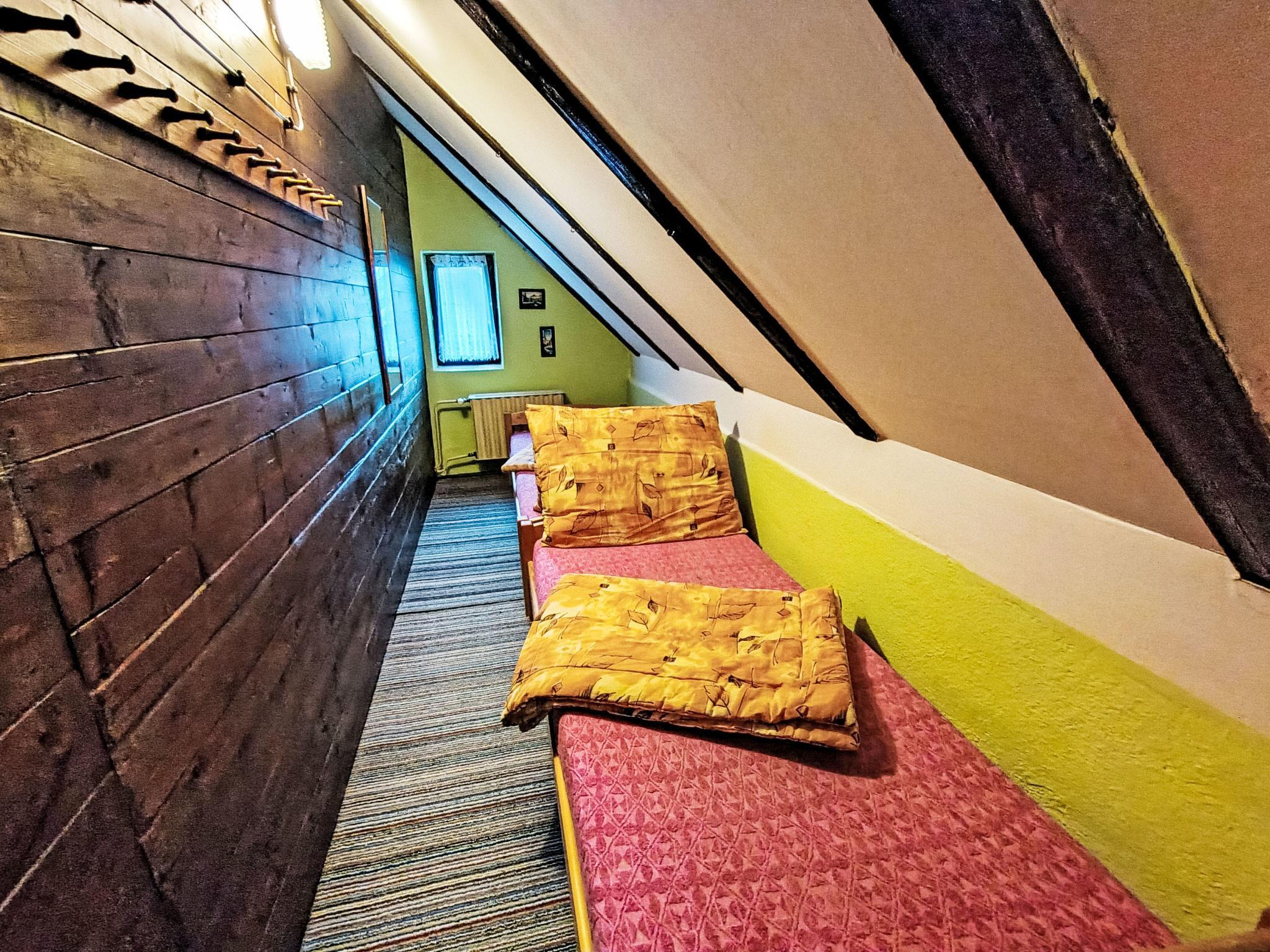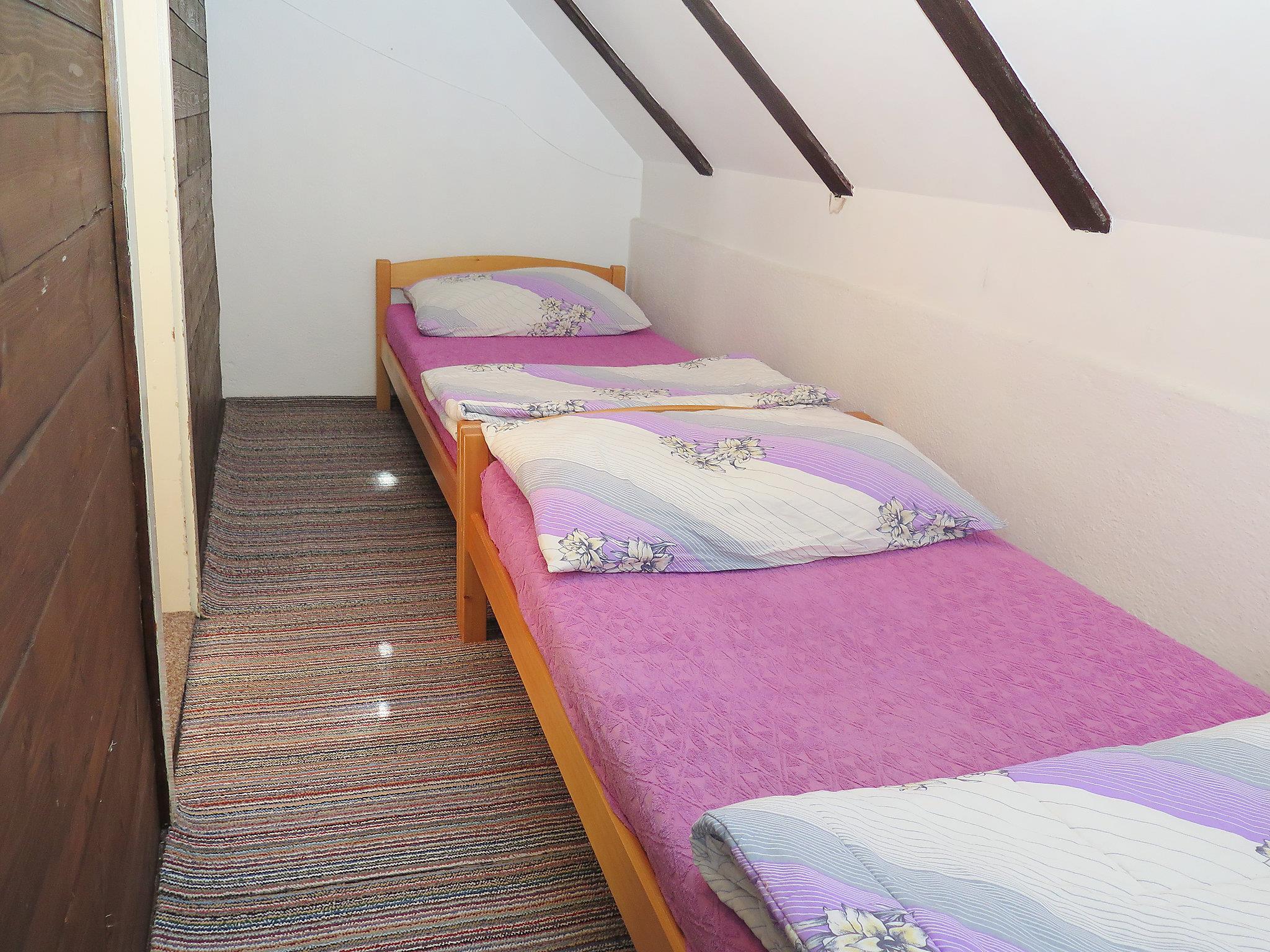 4-room apartment 80 m2 on 1st floor. Partly with sloping ceilings, simple furnishings: living/dining room with satellite TV, radio and CD-player. 2 small rooms with sloping ceilings, each room with 2 beds. 1 room with 1 double bed. Kitchen (4 hot plates, oven, kettle, microwave, freezer, electric coffee machine). Shower, sep. WC. Suitable for families. Wellness area with sauna (extra, on request) in lower floor is accessible through the garden, available only to guests.
