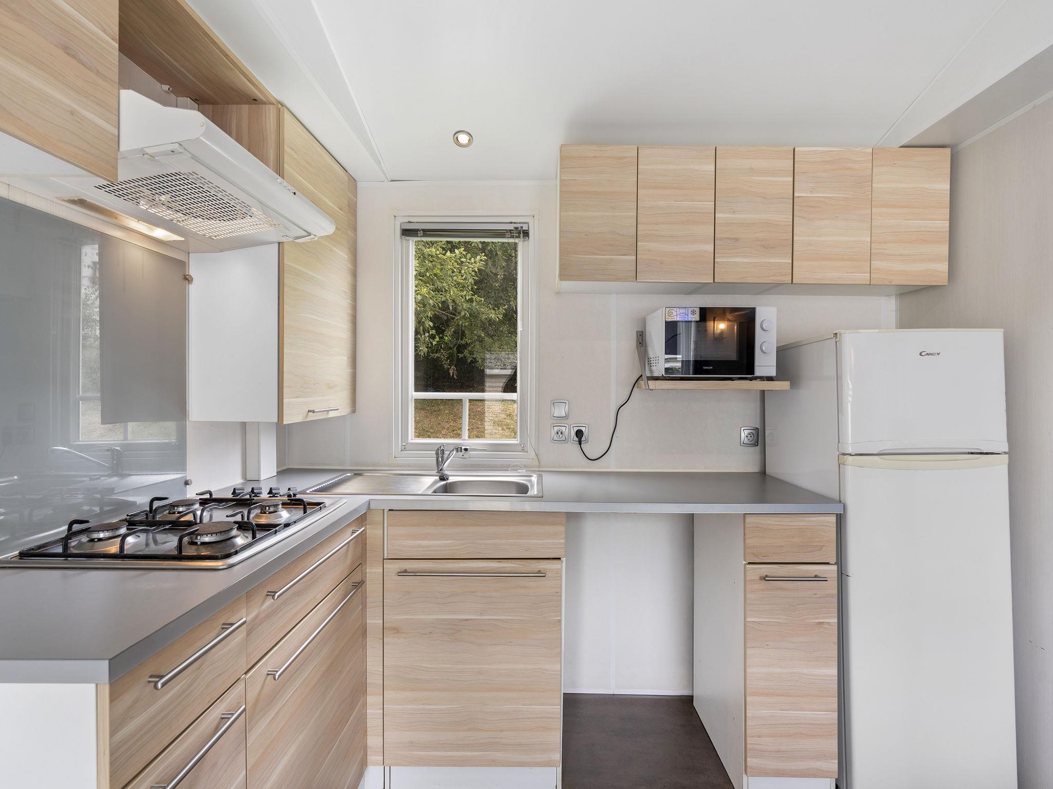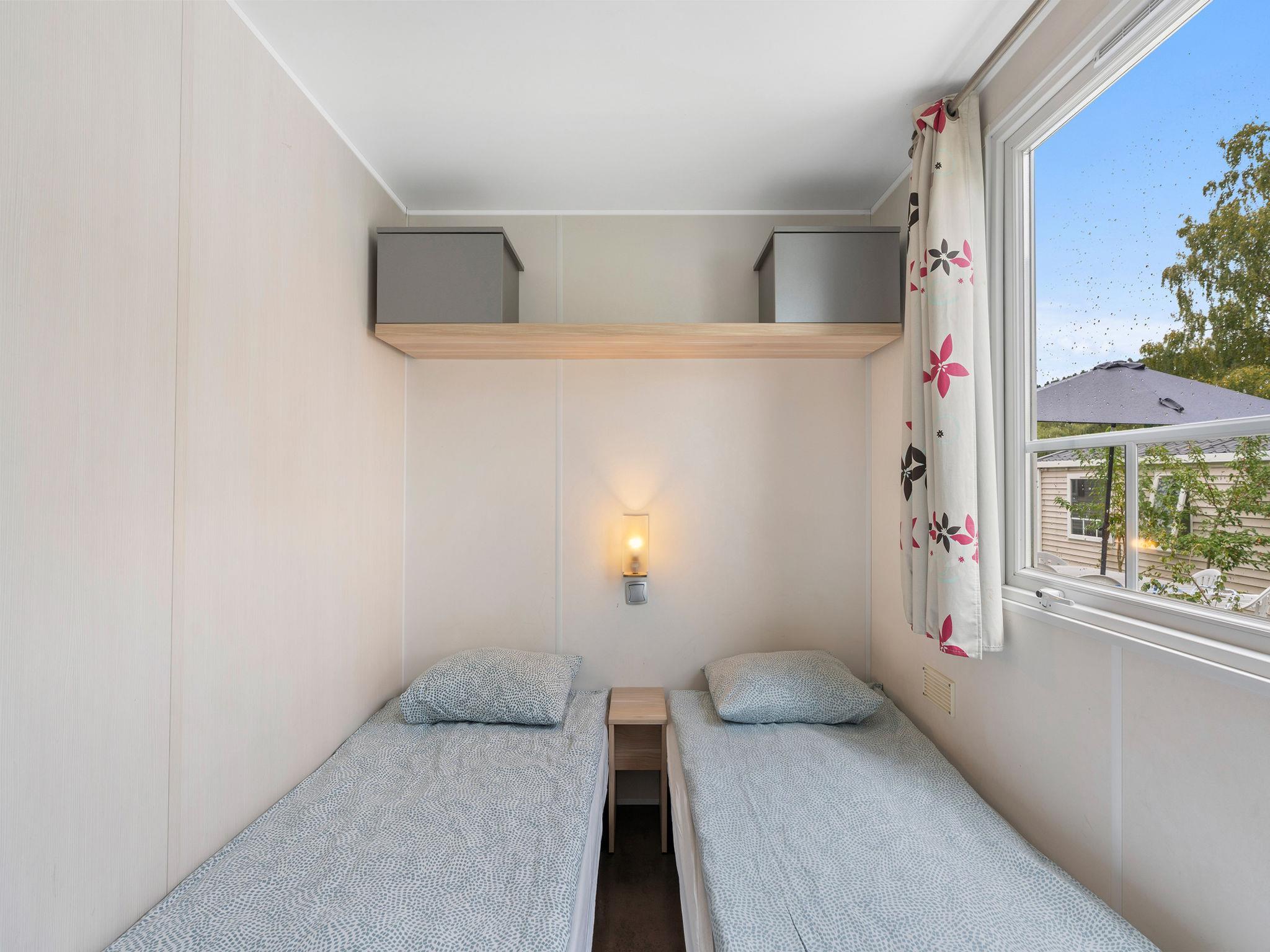 "Prima Plus", 4-room bungalow 32 m2. Living room with 1 sofabed. 1 room with 1 double bed. 2 rooms, each room with 2 beds. Kitchen (4 gas rings, microwave, freezer, electric coffee machine). Shower, sep. WC. Heating, air-conditioning. Terrace. Terrace furniture. Facilities: Internet (WiFi, free). Suitable for families. Maximum 1 pet/ dog allowed.