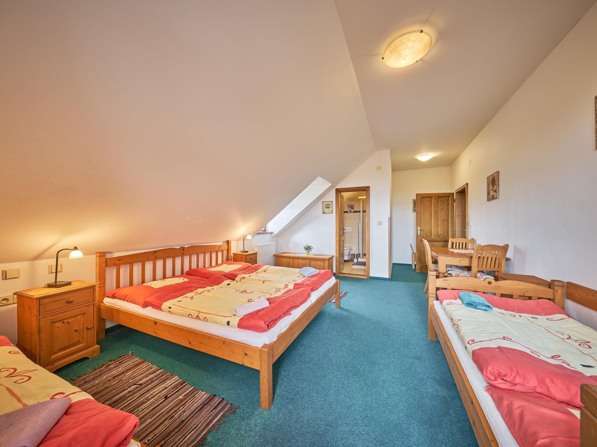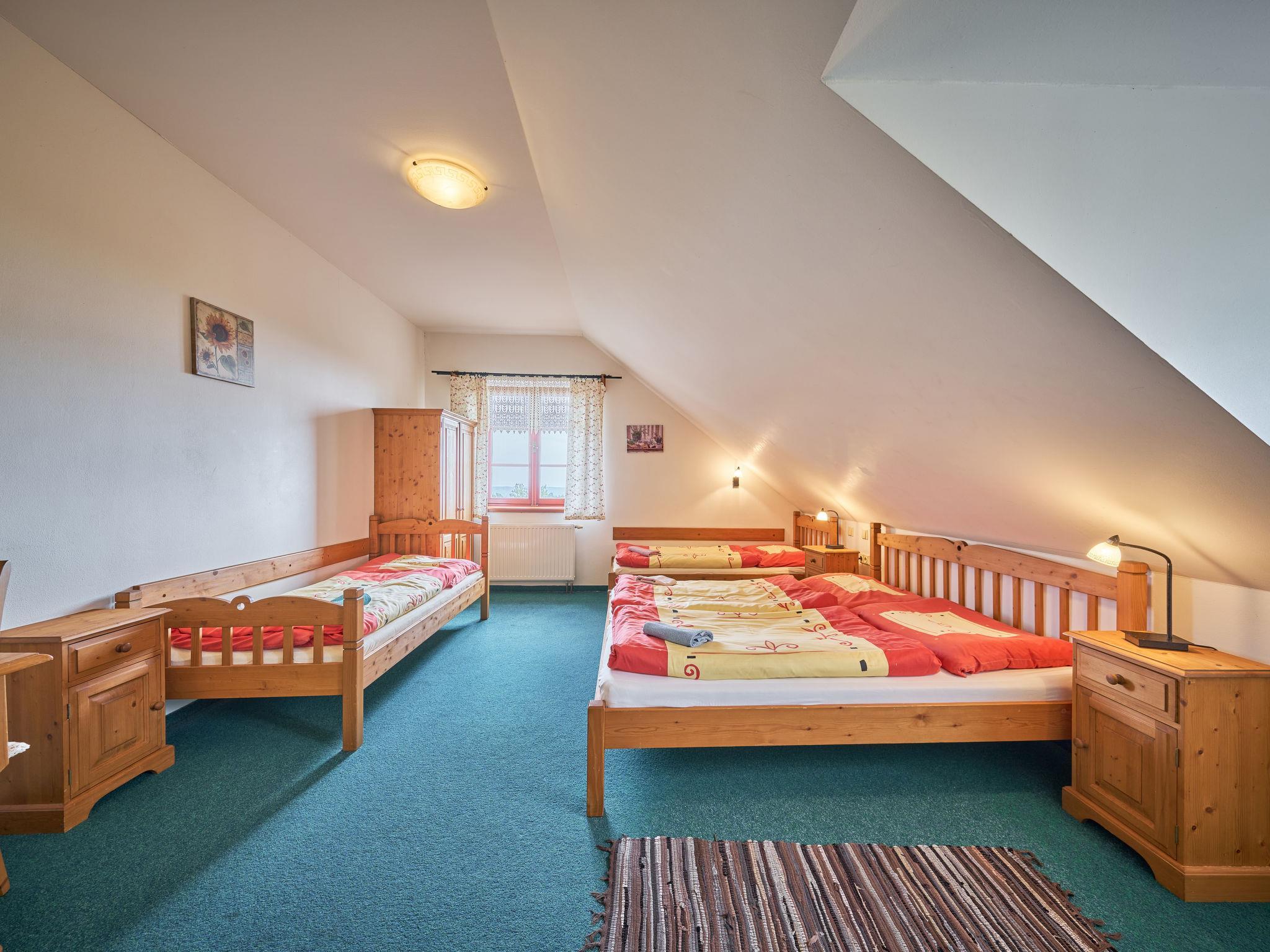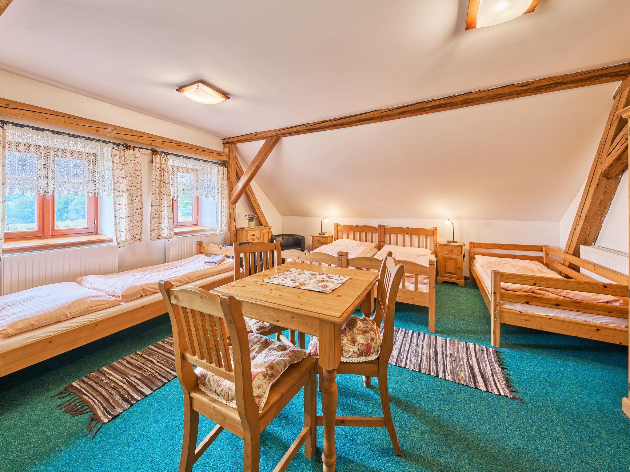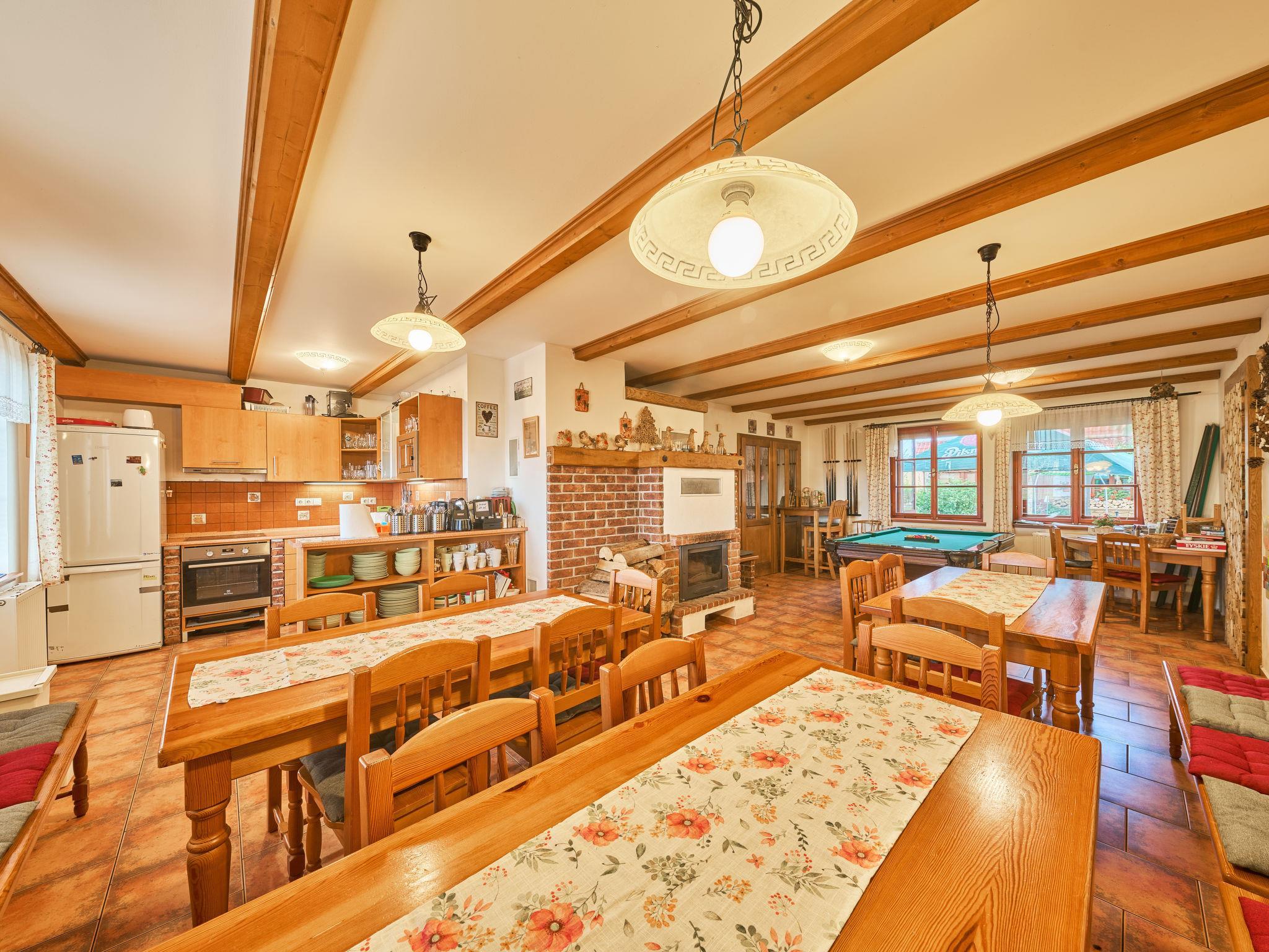 Beautiful country house "Ružovka", 2 storeys, semi-detached, built in 2010. 1.5 km from the centre of Uhlejov, 3 km from the centre of Miletín, 13 km from the centre of Dvur Králové, in a quiet, elevated position, 10 km from the skiing area. For shared use: property 400 m2, meadow. Private: swimming pool (3,6 m diameter, depth 90 cm, seasonal availability: 01.Jun. - 30.Sep.). In the house: billiard table. 1.5 km long motor access to the house (via unmade road). Parking (for 8 cars) on the premises. Shop 3 km, supermarket 10 km, bus stop "Trebihošt, tocna" 3.2 km, railway station "Bílá Tremešná" 6.5 km, indoor swimming pool 10 km. Ski lift 45 km, chair lift 45 km, slopes 10 km, cross country ski track 100 m. Nearby attractions: Miletín 3 km, Horice 10 km, Lázne Belohrad 10 km, Zoo Dvur Králové 13 km. Well-known ski regions can easily be reached: Jánské Lázne 45 km. Please note: the owner lives on the same property. Hot Tub (extra).
