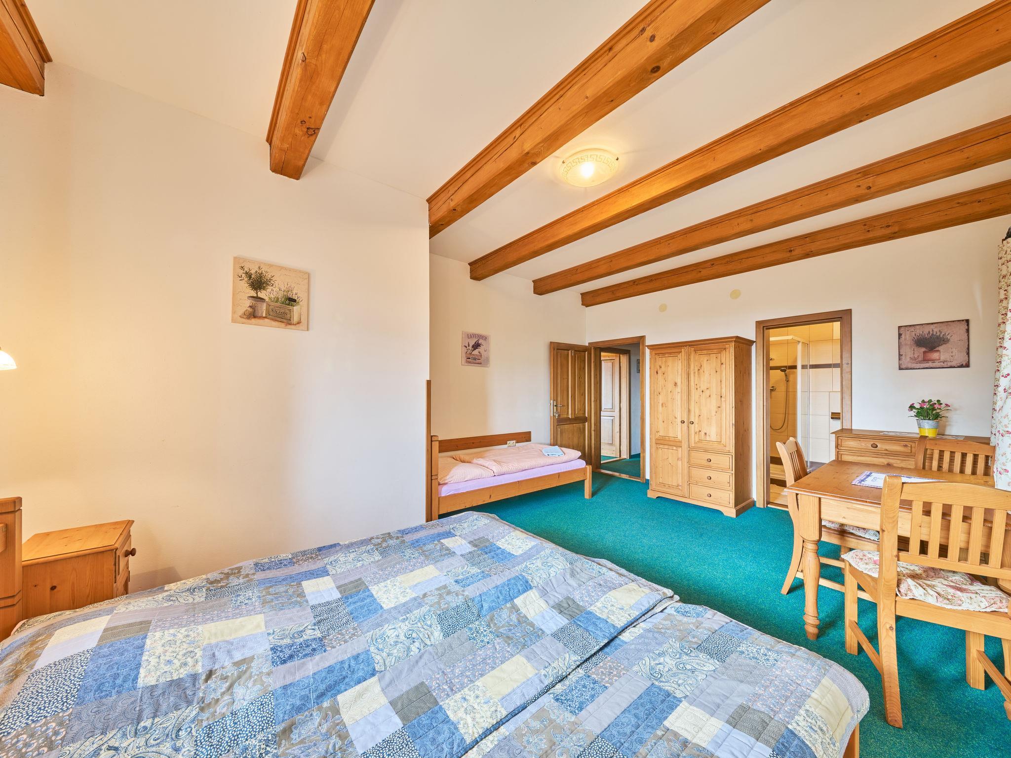 8-room house 330 m2 on 2 levels. Bright, stylish and wooden furniture furnishings: 1 room with 1 bed, 1 double bed and shower/WC. 1 room with 2 beds, 1 double bed and shower/WC. Kitchen-/living room (4 hot plates, oven, dishwasher, toaster, kettle, microwave, freezer, electric coffee machine) with Scandinavian wood stove, dining table, dining nook, satellite TV, CD-player and electric heating. Electric heating. Top floor: 1 room with sloping ceilings with 1 bed, 1 double bed and shower/WC. 1 room with sloping ceilings with 1 bed, 1 double bed and shower/WC. 1 room with sloping ceilings with 1 bed, 1 double bed, kitchen corner and shower/WC. 1 room with sloping ceilings with 4 beds and shower/WC. 1 room with sloping ceilings with 2 beds, 1 double bed, kitchen corner and shower/WC. Terrace. Terrace furniture, barbecue (portable). Marvellous panoramic view of the valley. Facilities: children's high chair, baby cot (extra). Internet (WiFi, free). Please note: suitable for families. Non-smoking house. Maximum 2 pets/ dogs allowed.