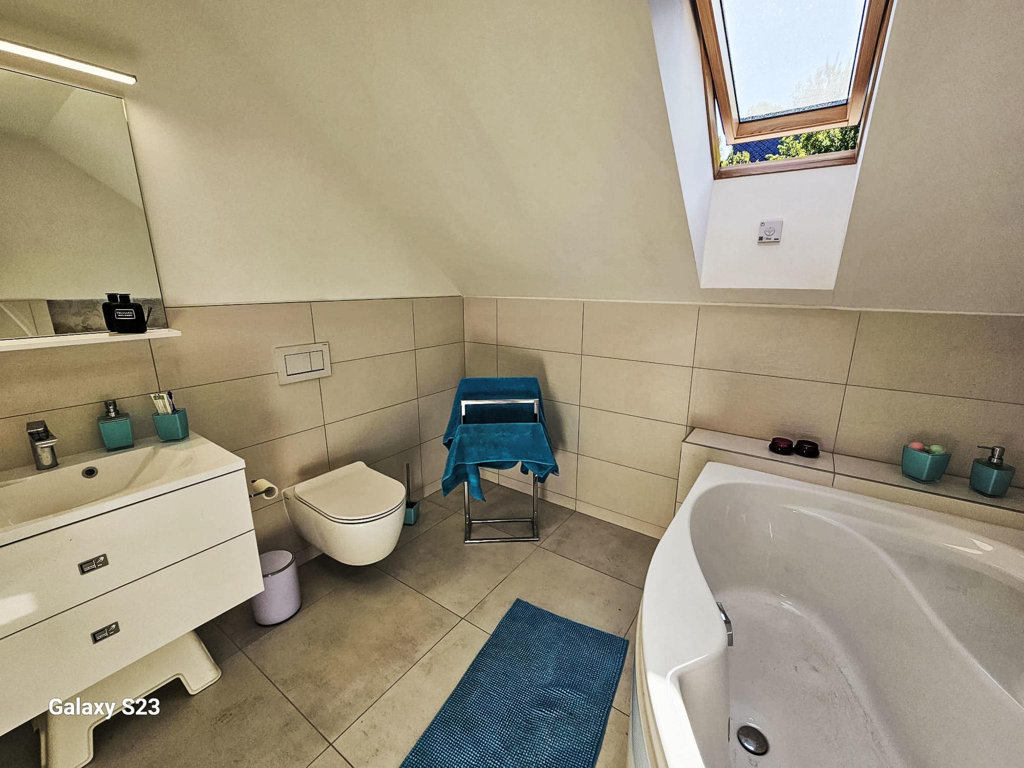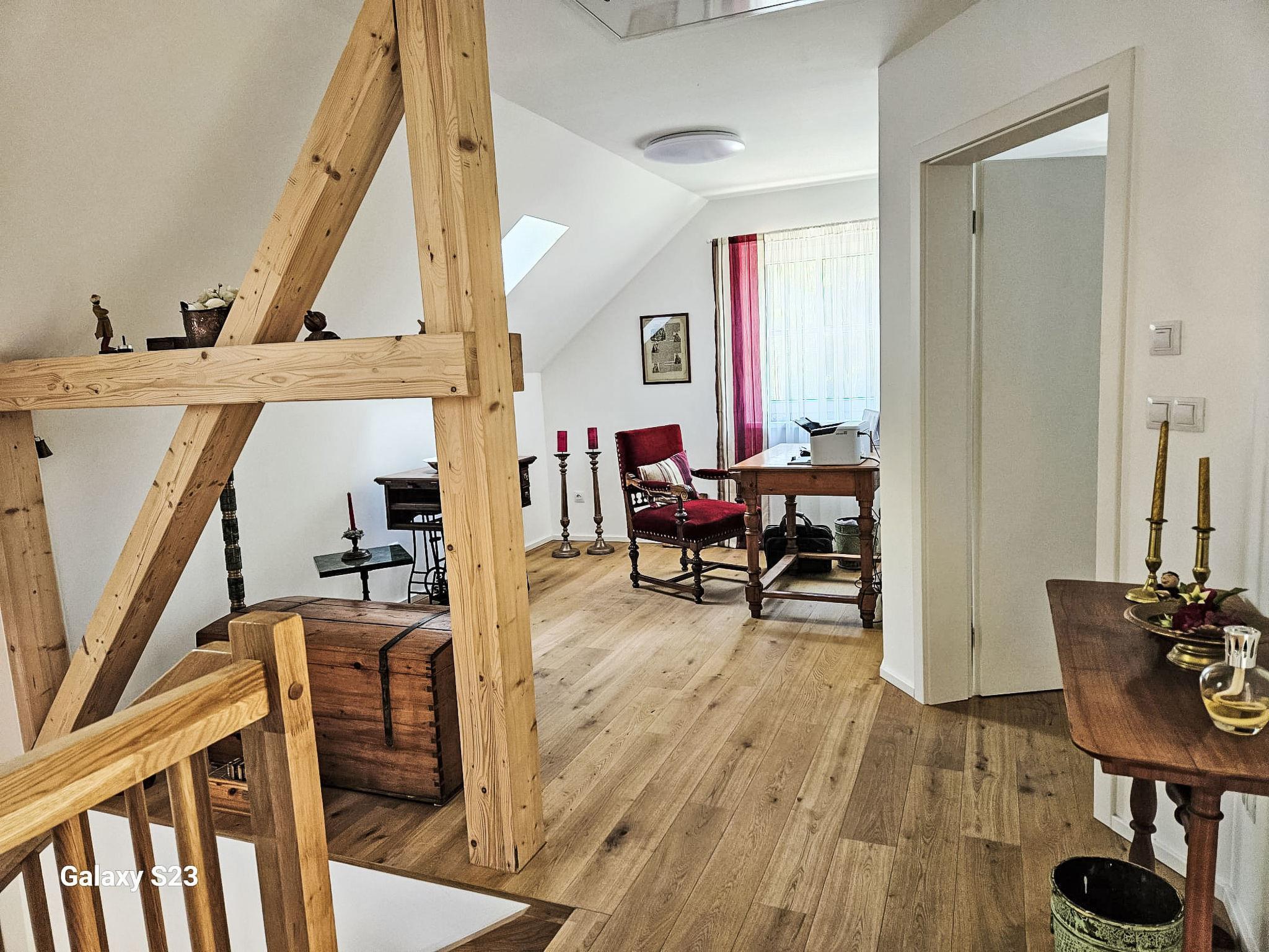 "Casa Lenka", 4-room house 120 m2 on 2 levels. Spacious and bright, tasteful and cosy furnishings: living/dining room with Scandinavian wood stove and satellite TV. Exit to the terrace. Kitchenette (oven, 4 ceramic glass hob hotplates, kettle, electric coffee machine). Bathroom, sep. WC. Underfloor heating. Upper floor: 2 rooms, each room with 2 double beds. Office with bath/WC. Floor heating. Side view of the garden. Facilities: baby cot. Internet (WiFi, free). E-charging station. Please note: suitable for families. Maximum 1 pet/ dog allowed. Smoke alarm, fire extinguisher.