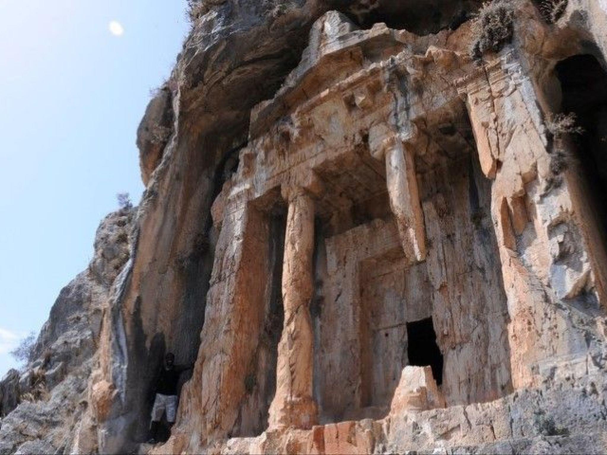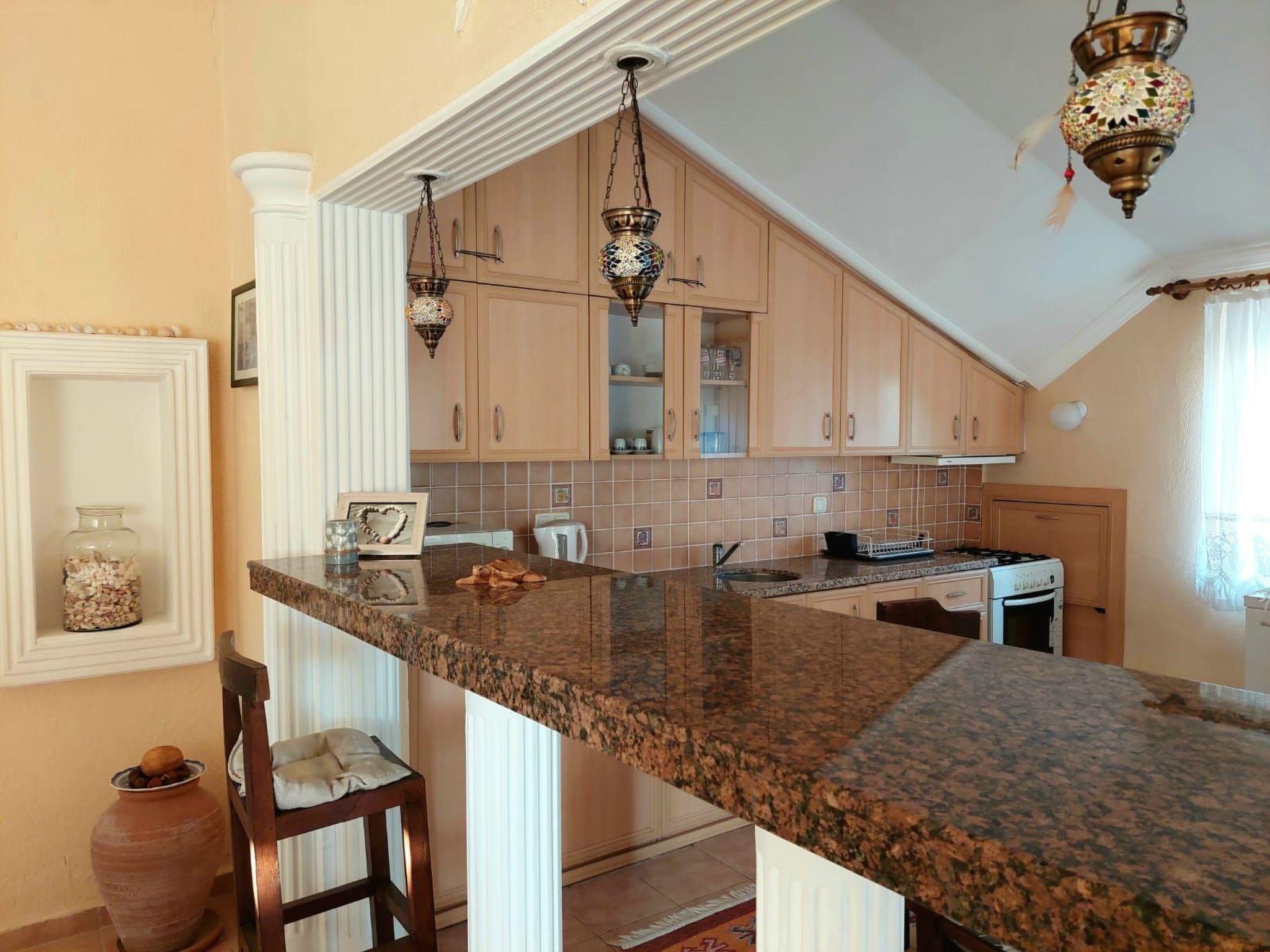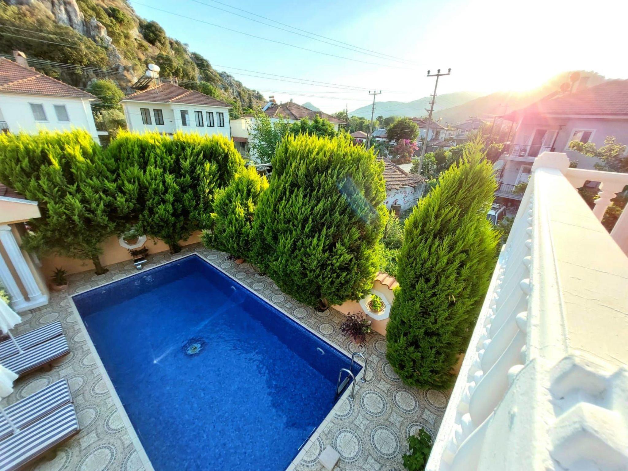 The interior of this five-bedroom villa radiates luxury and comfort, accommodating up to 13 guests. Every room is air-conditioned, featuring marble floors and modernly refurbished bathrooms, ensuring a stay that combines modernity with comfort. The villa boasts a fully equipped kitchen with all essentials including a fridge freezer, washing machine, dishwasher, oven, hob, electric kettle, and toaster. The living areas are spacious, adorned with comfortable furnishings, providing views over the enchanting Lycian Rock Tombs, making it a perfect residence for those seeking a blend of opulence and convenience.