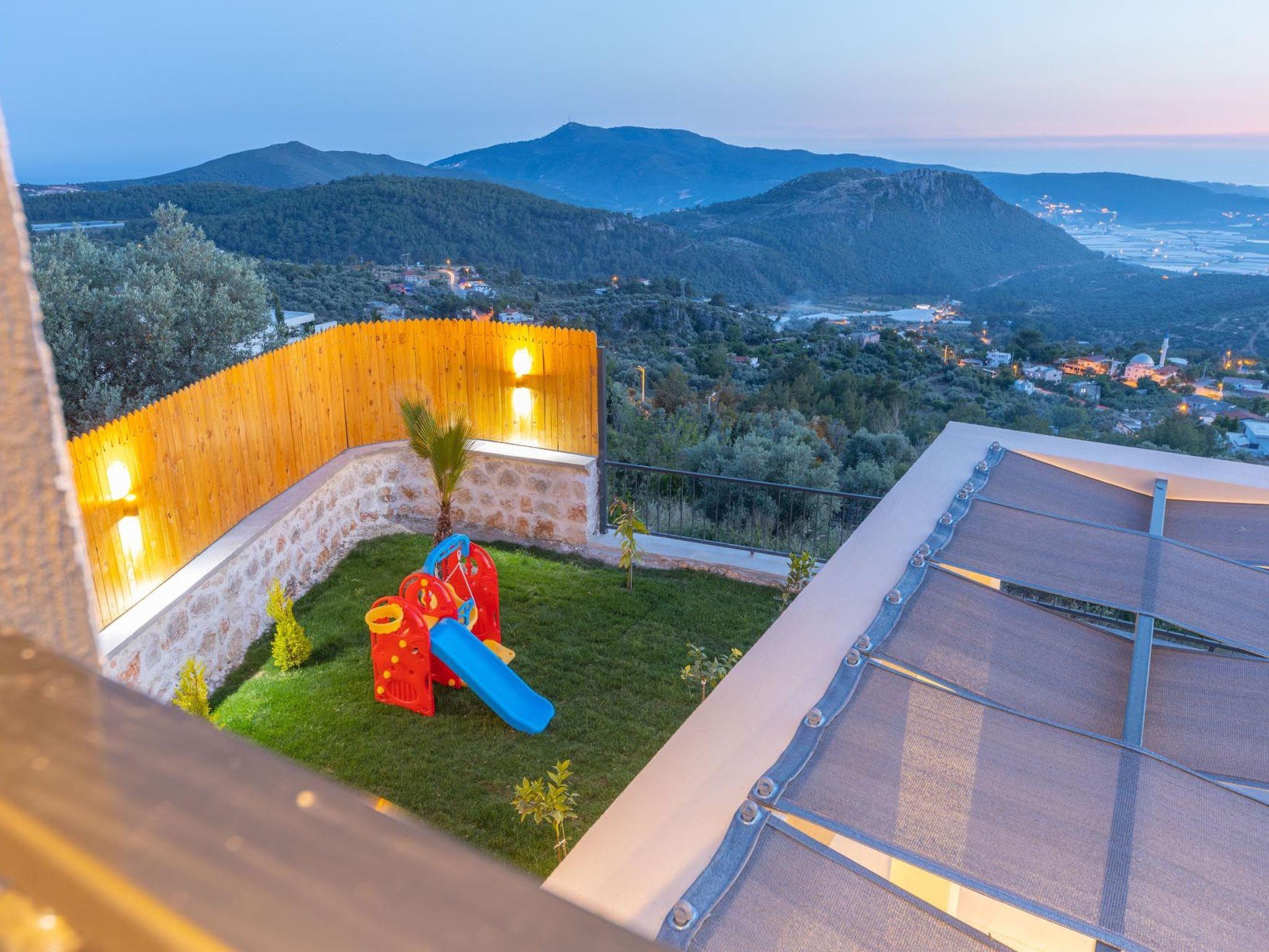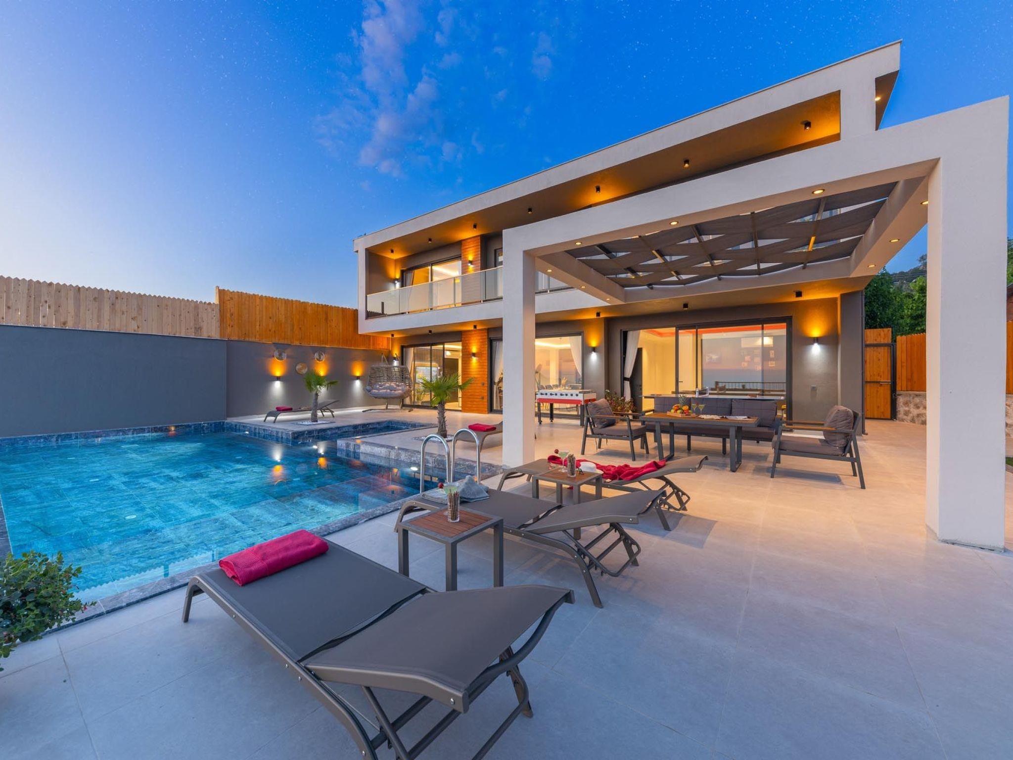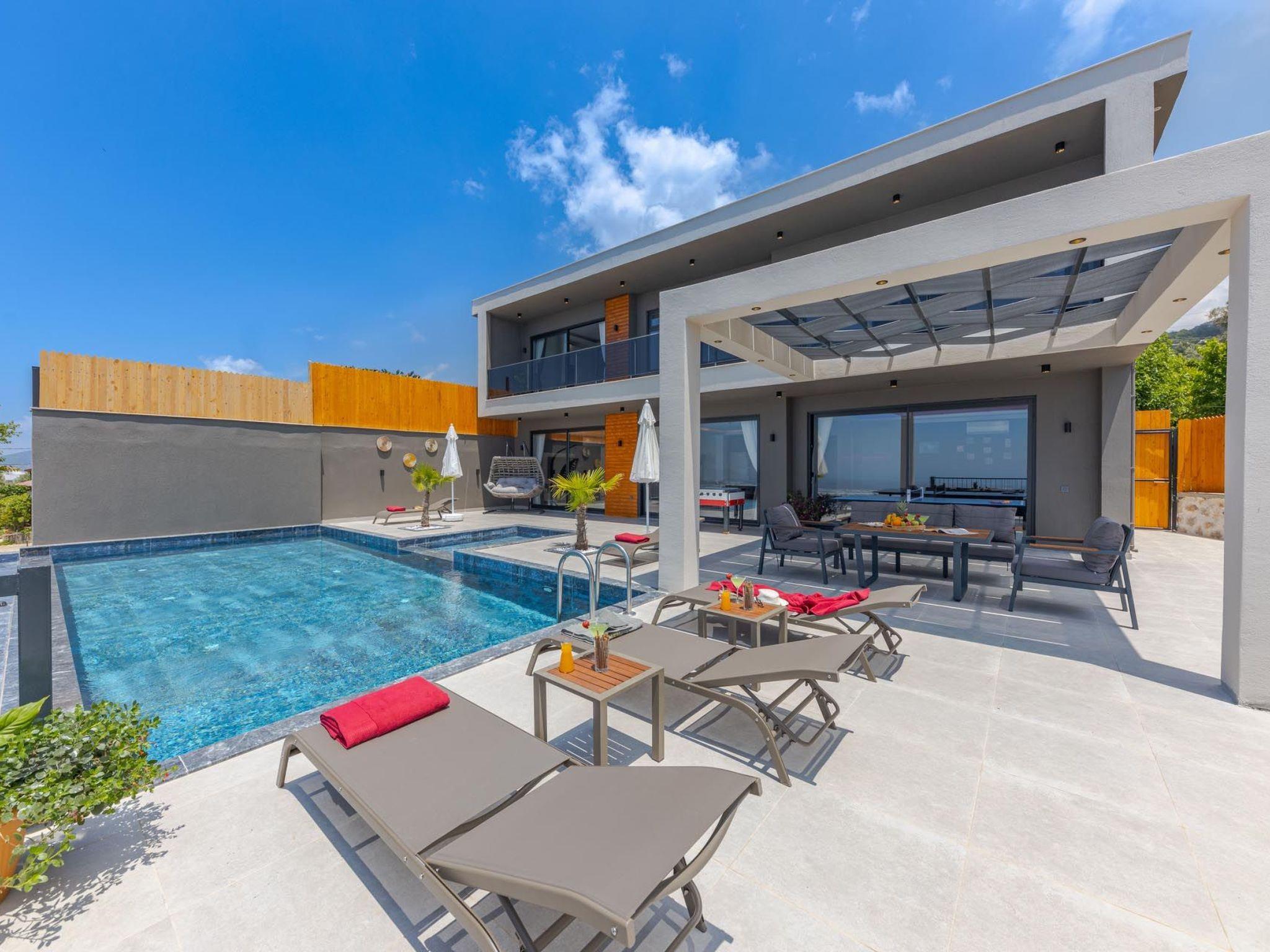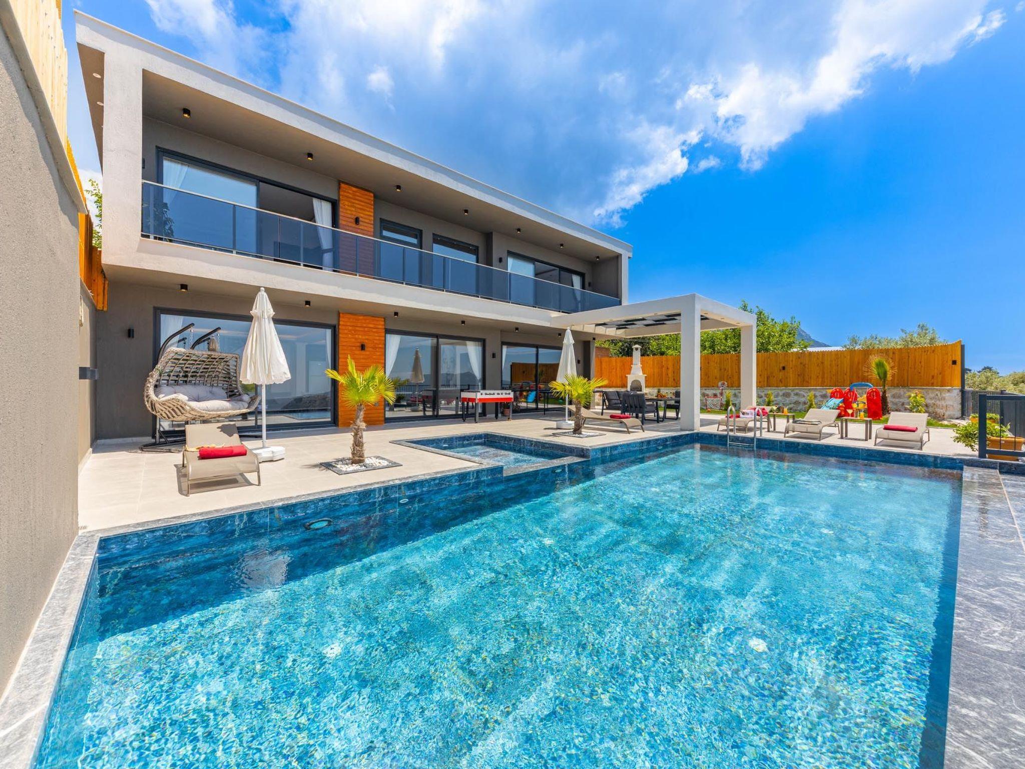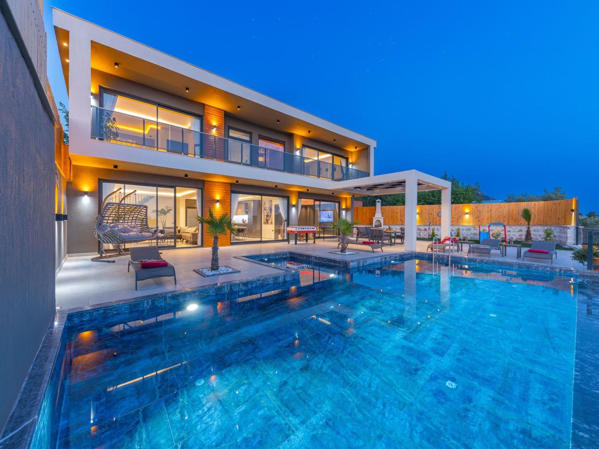 The villa is a luxurious villa located in Üzümlü, a quiet area and the best holiday resort of Kalkan. It offers a breathtaking view and you can even see the world famous Patara beach with a length of 13 km in the distance. The villa is spacious and has a special children's playground, a park and a garden area for families with children. The pool and pool terrace are generously designed and offer privacy. Therefore, the villa is an ideal choice for conservative families and honeymoon couples. The villa consists of a total of 2 suites. On the ground floor there is a modern kitchen and a living room. Thanks to the bed in the cinema room in the basement, a total of 7 people can be accommodated. Our villa offers a marvellous view from every room and provides a comfortable service with its sauna. There is a hot tub in both rooms, making it a villa with two hot tubs. With all these features, our villa awaits its valued guests. In addition, there is table tennis and table football for your entertainment in the villa.