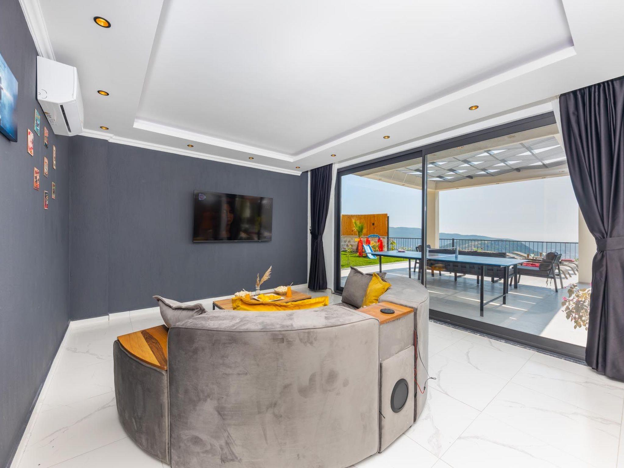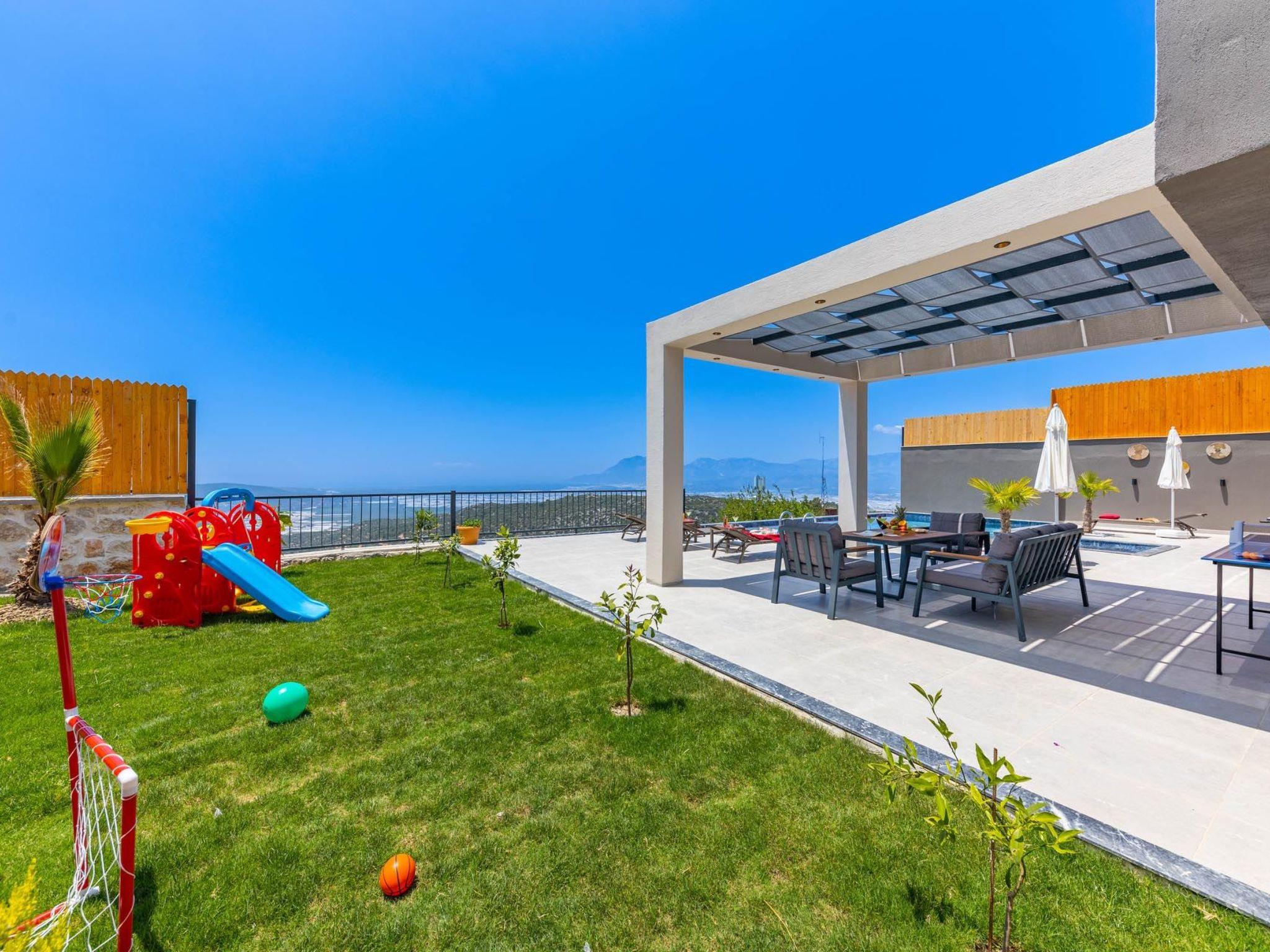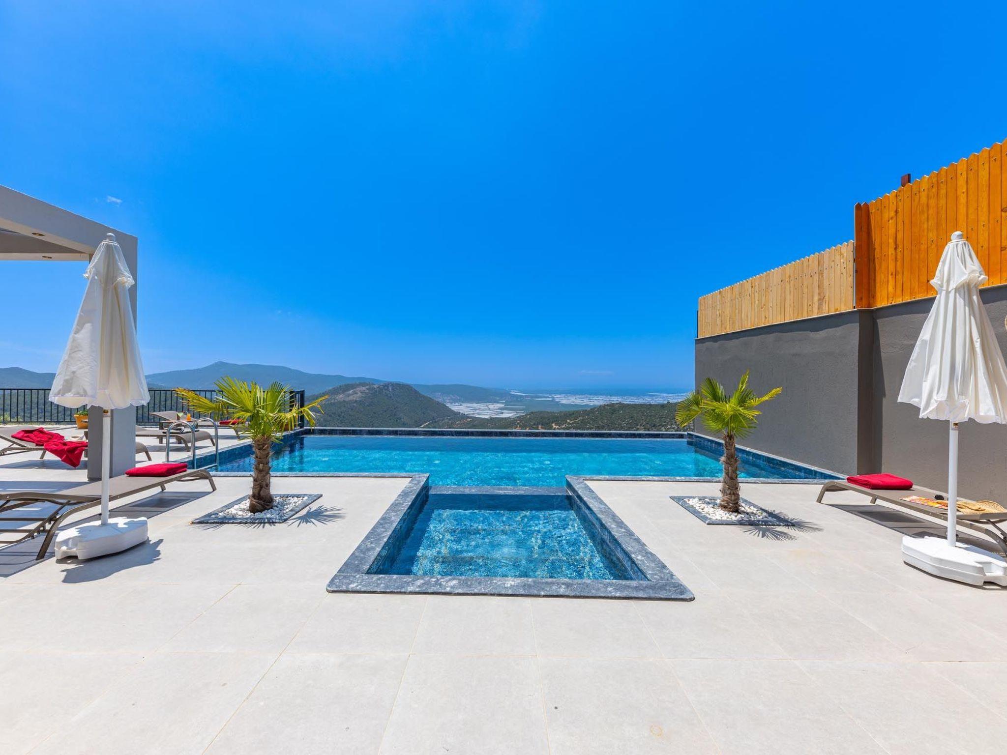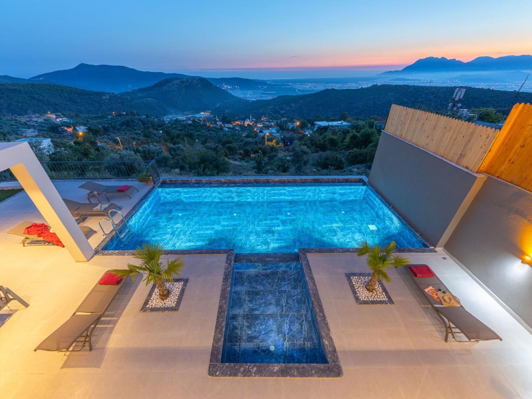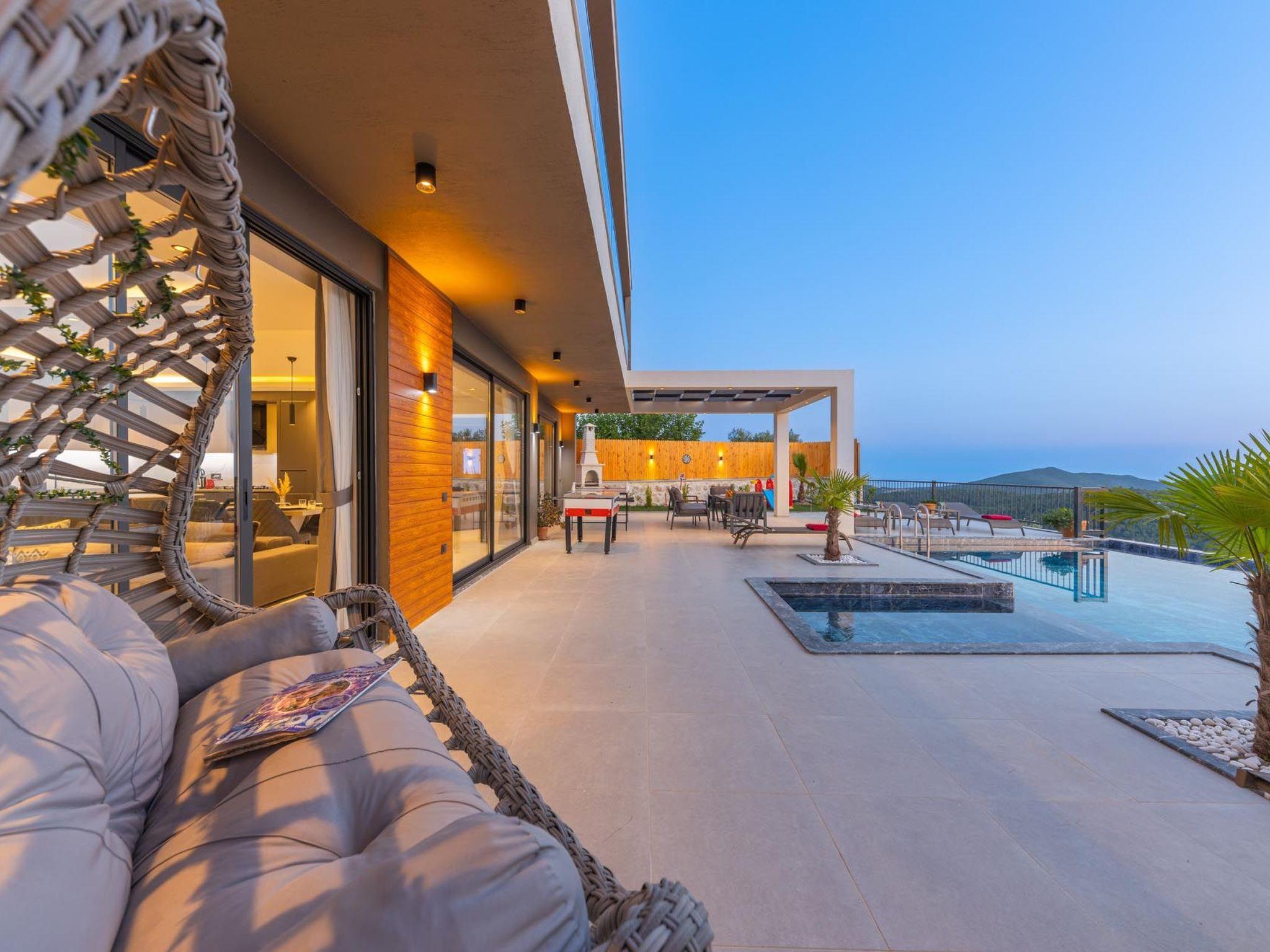 The villa is a luxurious villa located in Üzümlü, a quiet area and the best holiday resort of Kalkan. It offers a breathtaking view and you can even see the world famous Patara beach with a length of 13 km in the distance. The villa is spacious and has a special children's playground, a park and a garden area for families with children. The pool and pool terrace are generously designed and offer privacy. Therefore, the villa is an ideal choice for conservative families and honeymoon couples. The villa consists of a total of 2 suites. On the ground floor there is a modern kitchen and a living room. Thanks to the bed in the cinema room in the basement, a total of 7 people can be accommodated. Our villa offers a marvellous view from every room and provides a comfortable service with its sauna. There is a hot tub in both rooms, making it a villa with two hot tubs. With all these features, our villa awaits its valued guests. In addition, there is table tennis and table football for your entertainment in the villa.