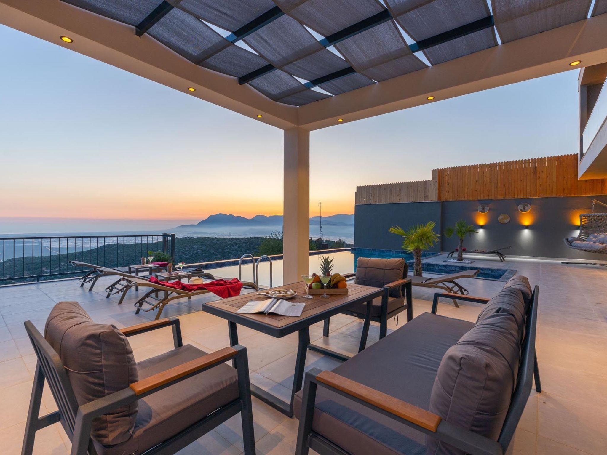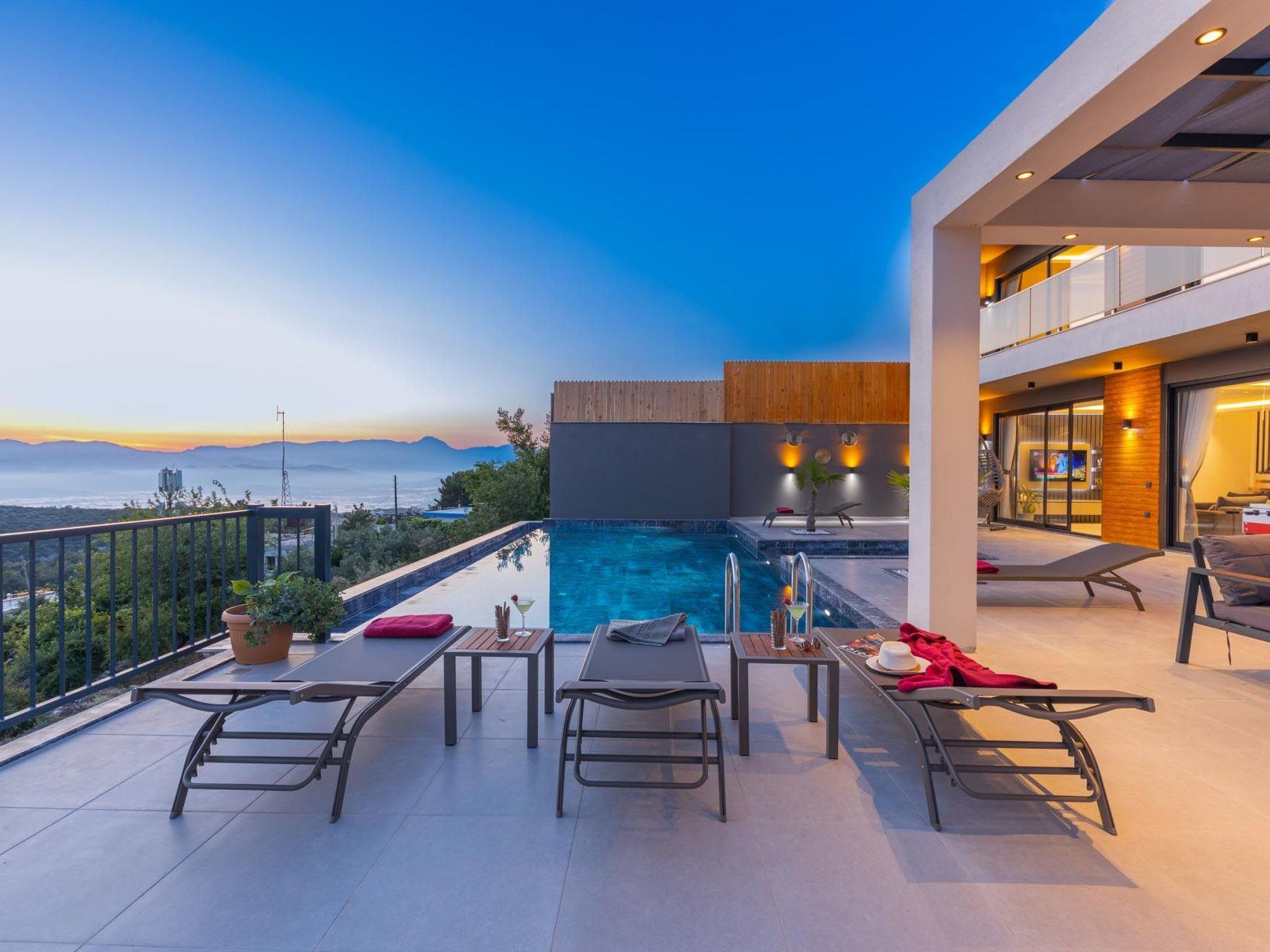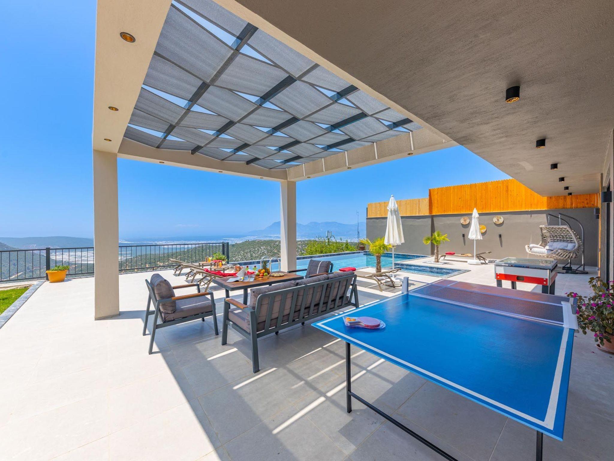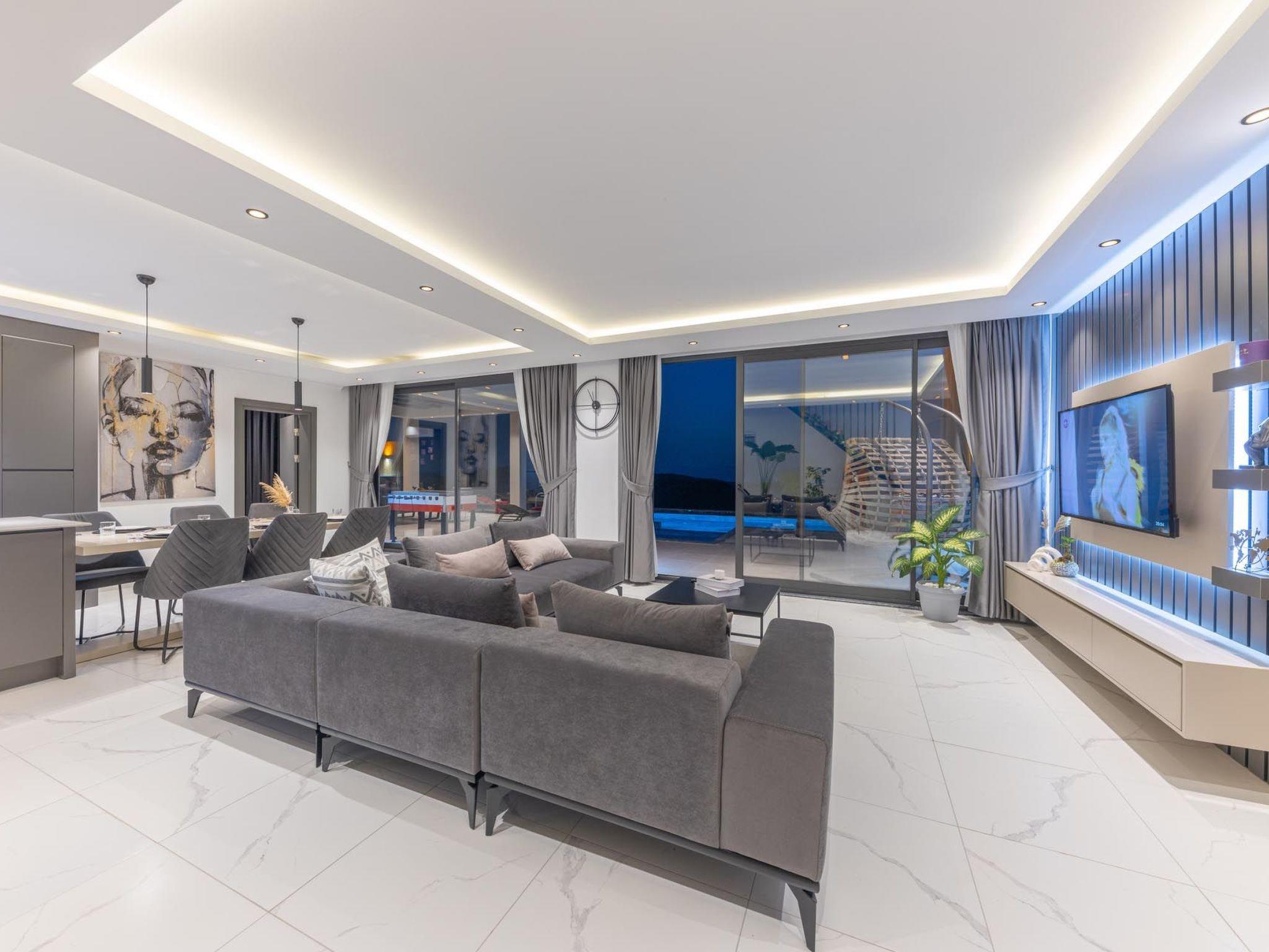 The villa is a luxurious villa located in Üzümlü, a quiet area and the best holiday resort of Kalkan. It offers a breathtaking view and you can even see the world famous Patara beach with a length of 13 km in the distance. The villa is spacious and has a special children's playground, a park and a garden area for families with children. The pool and pool terrace are generously designed and offer privacy. Therefore, the villa is an ideal choice for conservative families and honeymoon couples. The villa consists of a total of 2 suites. On the ground floor there is a modern kitchen and a living room. Thanks to the bed in the cinema room in the basement, a total of 7 people can be accommodated. Our villa offers a marvellous view from every room and provides a comfortable service with its sauna. There is a hot tub in both rooms, making it a villa with two hot tubs. With all these features, our villa awaits its valued guests. In addition, there is table tennis and table football for your entertainment in the villa.