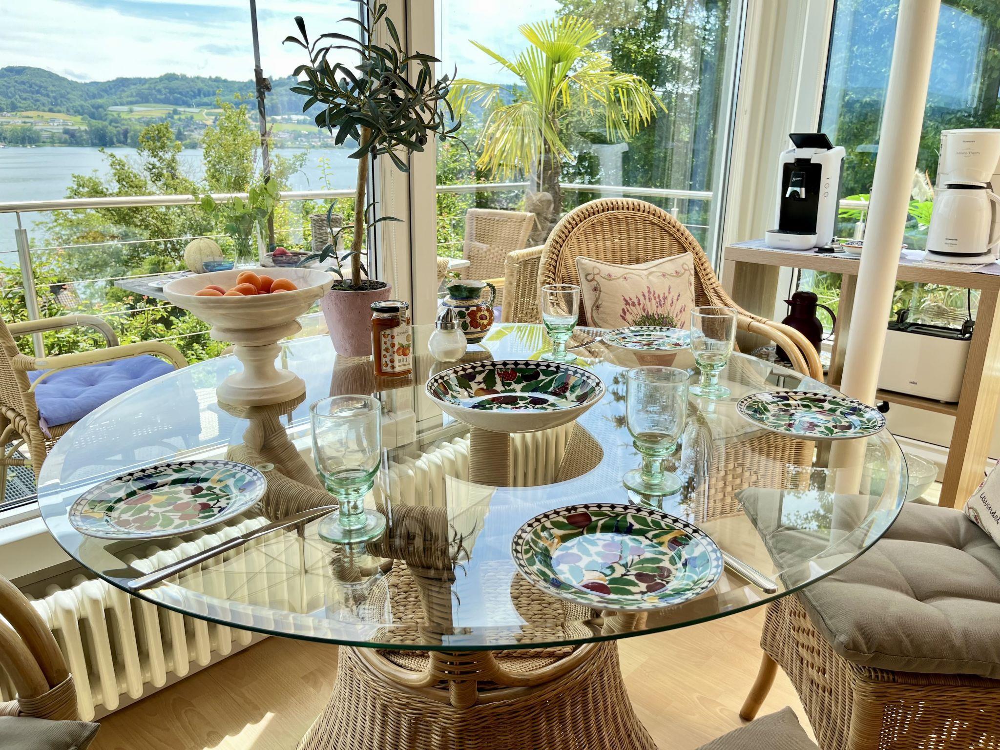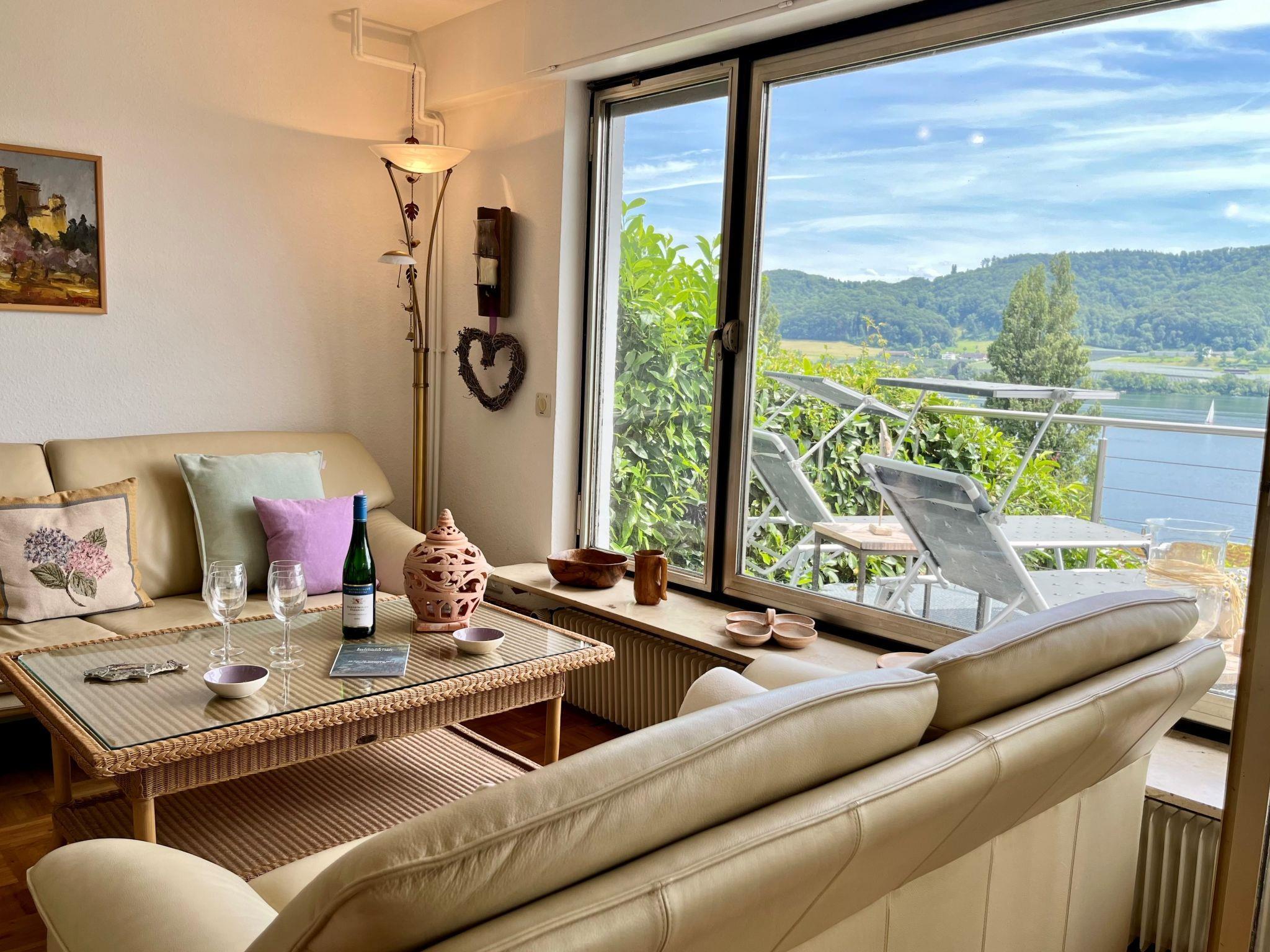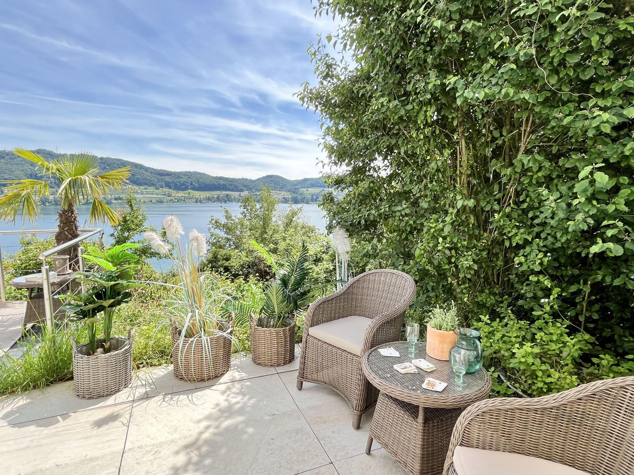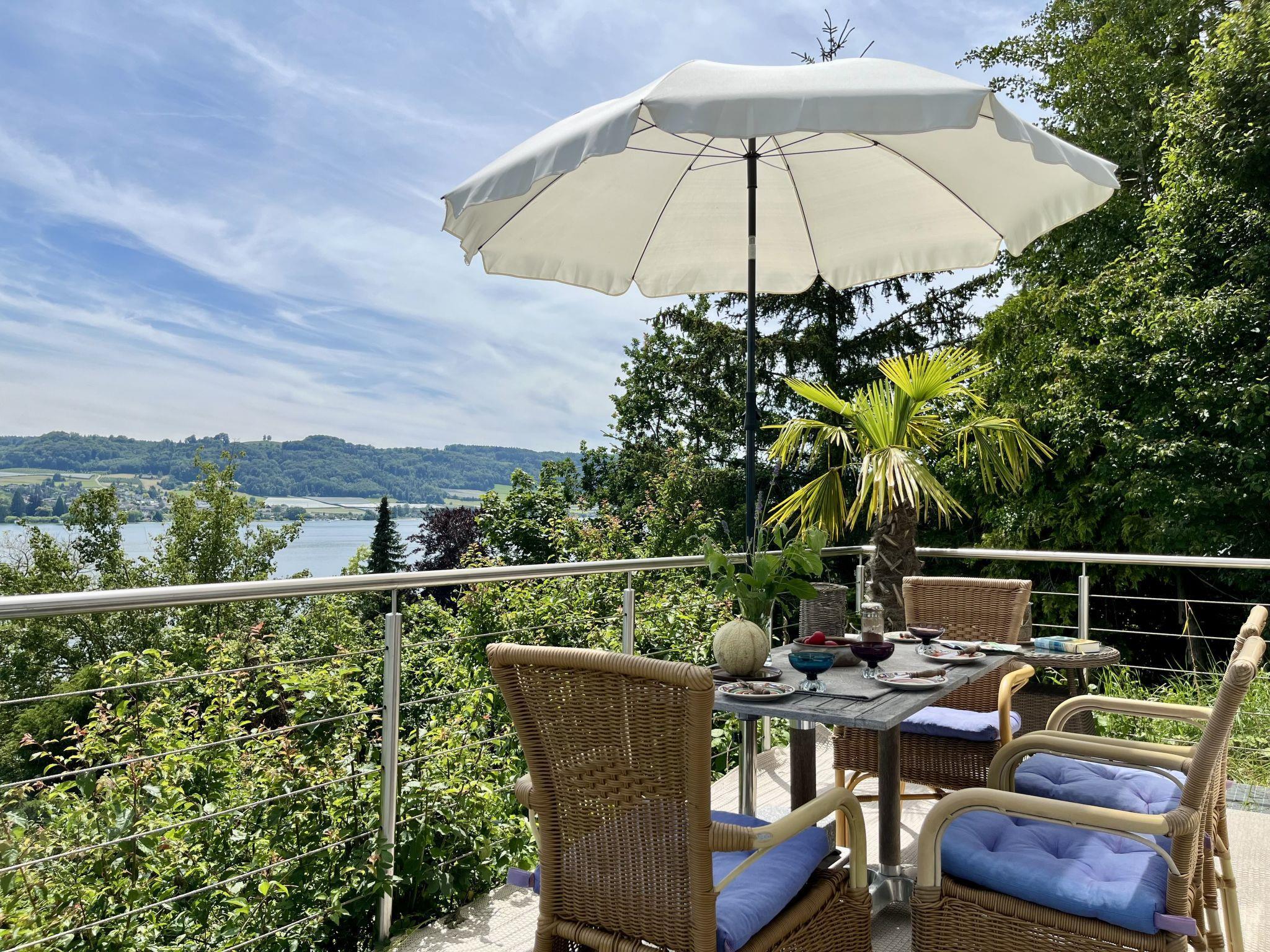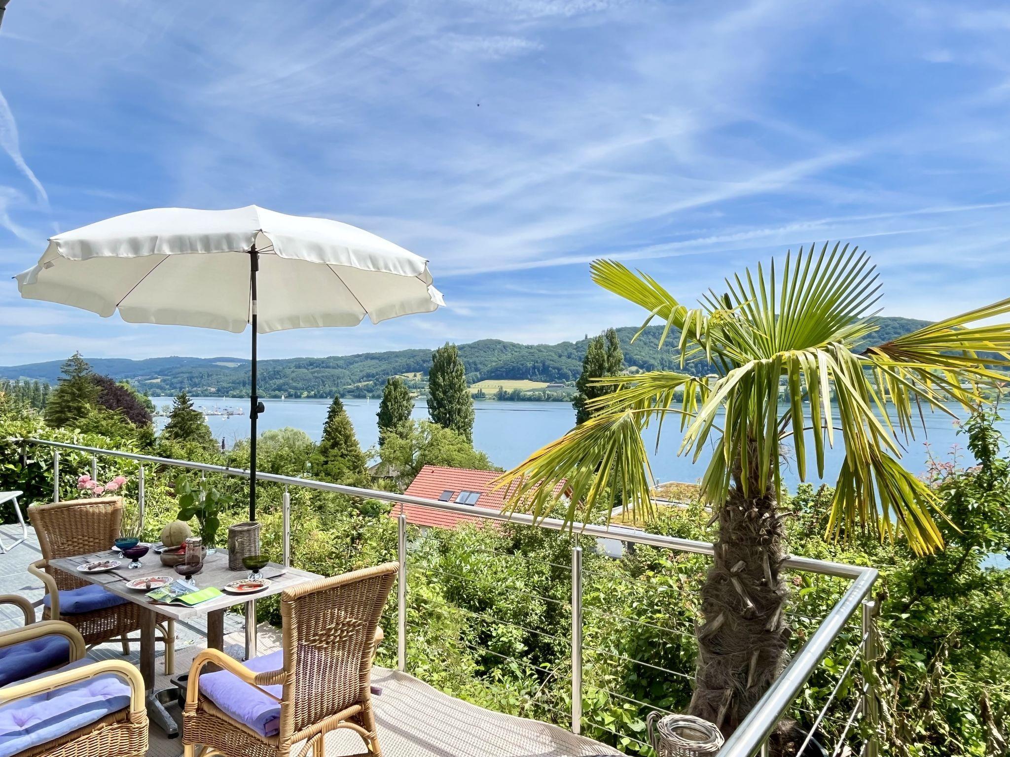 "Seepanorama", 4-room semi-detached house 90 m2 on 3 levels. Bright, partly renovated in 2022, beautiful and cosy furnishings: living room with satellite TV (flat screen), hi-fi system. Walk-through room with dining table. Exit to the balcony, to the terrace. Open kitchen (oven, dishwasher, 4 ceramic glass hob hotplates, kettle, electric coffee machine). Bath/WC. Heating. On the lower ground floor: 1 double bedroom with 1 double bed (2 x 90 cm, length 200 cm). Walk-through room with 2 x 1 bunk beds (90 cm, length 200 cm), hand-basin. Upper floor: 1 double bedroom with 1 double bed (180 cm, length 200 cm). Large balcony, south facing position, large terrace, south facing position and west facing position. Terrace furniture, balcony furniture, electric barbecue (portable), deck chairs (2). Marvellous view of the lake. Facilities: washing machine, dryer, hair dryer. Internet (WiFi, free). Parking at the house. Please note: not suitable for small children. Non-smoking house. Smoke alarm, fire extinguisher. For reasons of space, the oven, washing machine and tumble dryer are located in the basement of the house. Bed layout is flexible. There are more sleeping options available than the maximum number of people allowed which may, however, not be exceeded.