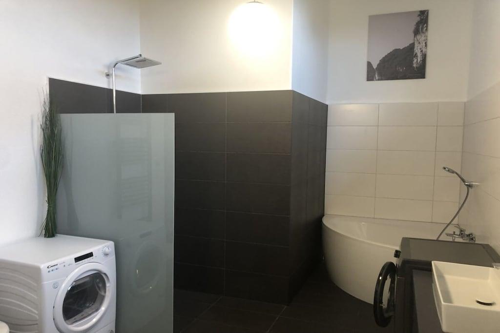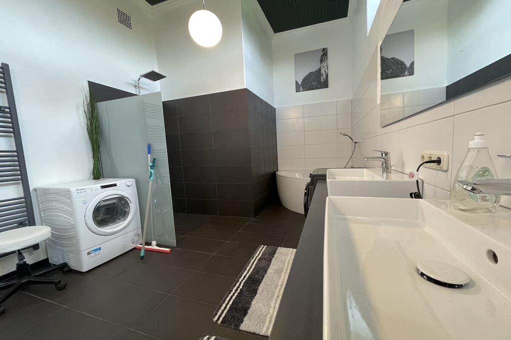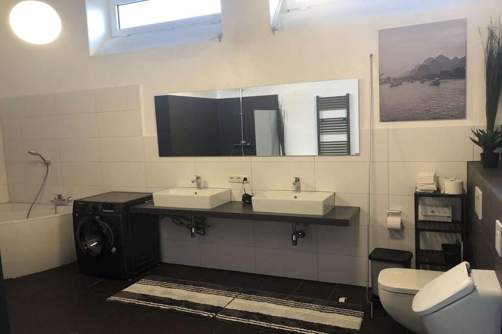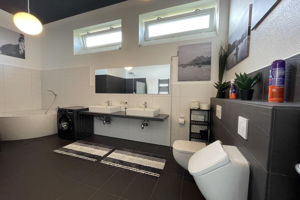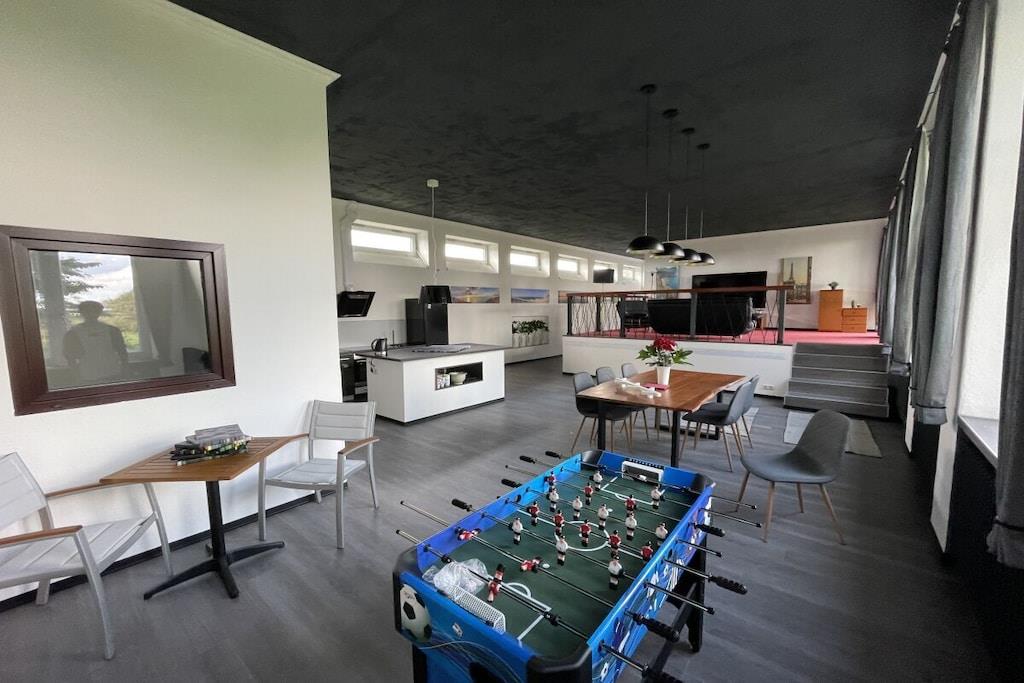 Indkvarteringen ligger på første sal med 15 trin :-) På cirka 200 m² kan op til otte personer nyde godt af masser af plads med en loftshøjde på 3,6 m. Der er tre soveværelser, to værelser til to personer, og et værelse kan rumme op til fire personer. Alle boxmadrassenge er flytbare. På øverste niveau er der et 75-tommer tv og opholdsstue. Gulv-til-loft-vinduer giver dig mulighed for at nyde udsigten helt til Nordsødiget. Hurtig fiberoptisk Wi-Fi er tilgængelig gratis i hele huset. Det lille badeværelse har bruser og toilet. Et stort badeværelse er synligt med badekar, bruser, vaskemaskine og tørretumbler. Haven kan nås via nødudgangen eller trappen foran og kan deles. 4000 m² græsplæne er til rådighed. Fodboldmål er til rådighed.