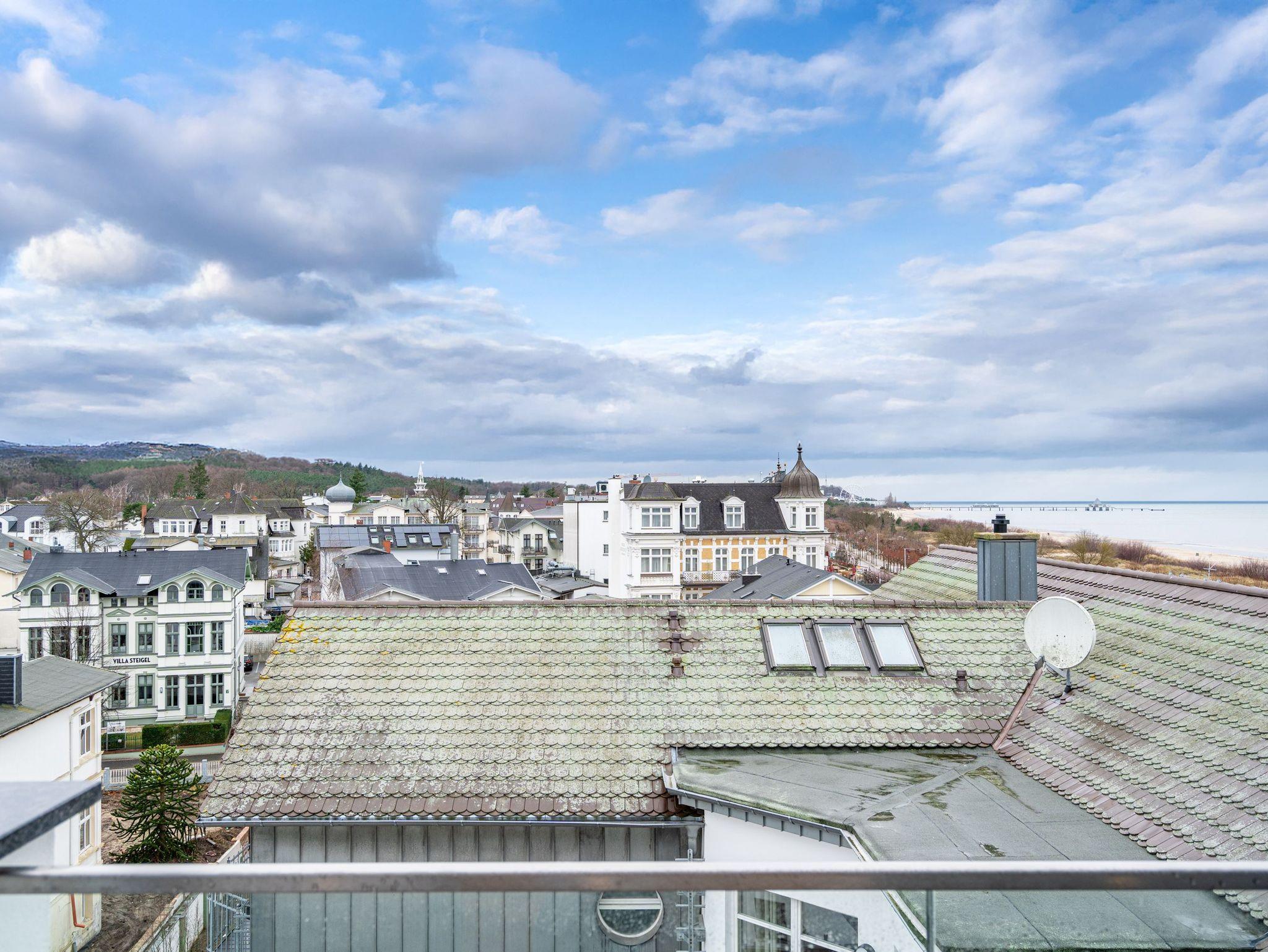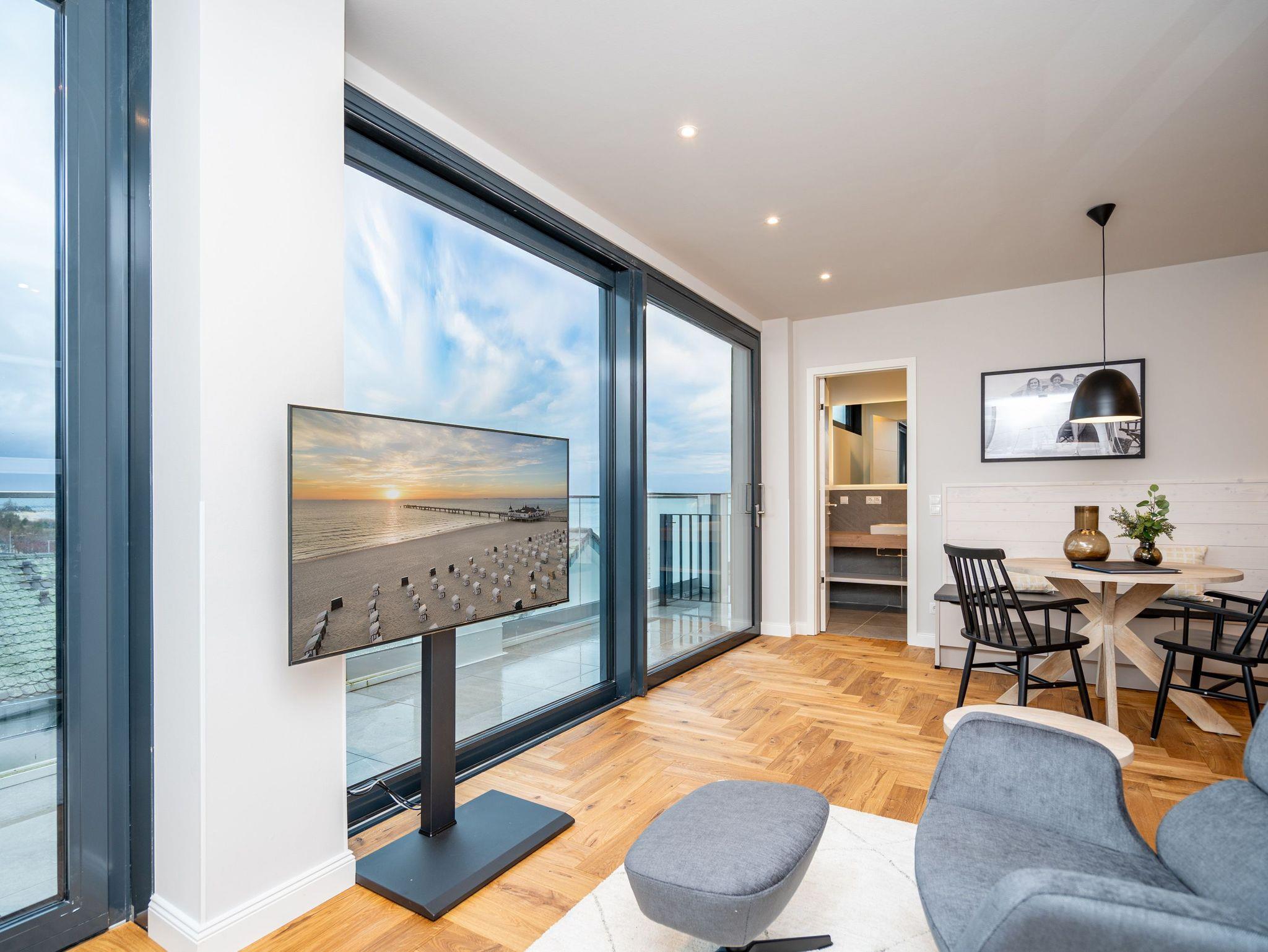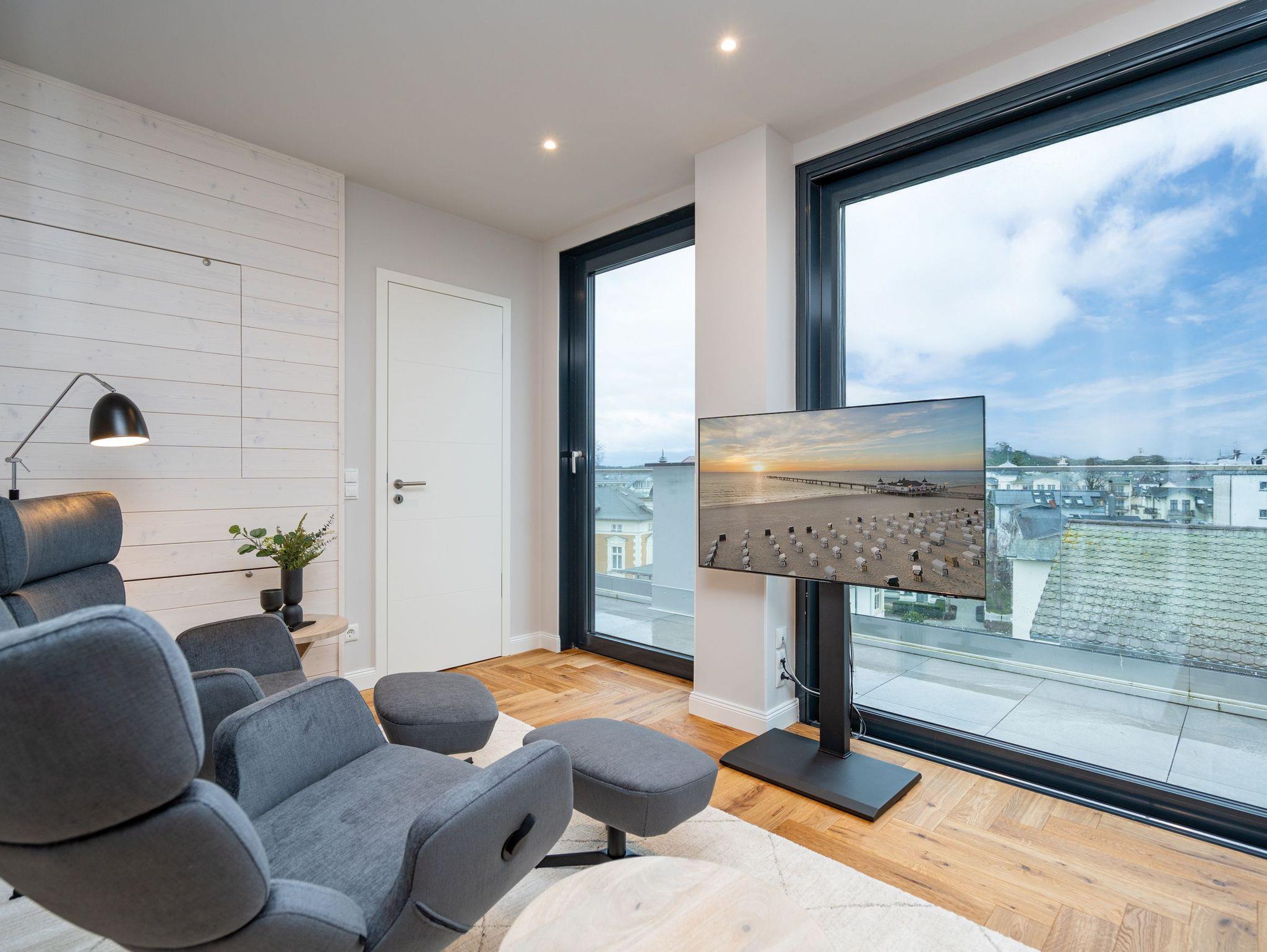 Willkommen im Penthouse-Appartement. 4.1! Dieses exklusive Appartement befindet sich im Penthouse des Hauses A auf der 4. Etage und begeistert mit einer stilvollen Einrichtung sowie einem atemberaubenden Meerblick über die Dächer von Ahlbeck. Auf 49 m² finden 2 Personen alles, was das Herz begehrt, um den Urlaub entspannt zu genießen. Der offene Wohnbereich mit edlem Echtholzparkett lädt zum Verweilen ein: Machen Sie es sich in den drehbaren Relaxsesseln bequem, die Füße entspannt auf dem Hocker, und genießen Sie Ihre Lieblingssendung auf dem 50-Zoll-Flat-TV oder lassen Sie einfach die Seele baumeln beim traumhaften Blick über die Ostsee. Die moderne Küchenzeile ist perfekt ausgestattet ? mit einem 3-Platten-Induktionsherd, Backofen mit Mikrowellenfunktion, Spülmaschine und allem, was Sie für Ihre kulinarischen Abenteuer benötigen. Der angrenzende Essbereich mit Sitzbank, Esstisch und zwei Stühlen bietet den idealen Ort für gemütliche Mahlzeiten. Das separate Schlafzimmer verspricht erholsame Nächte im komfortablen Boxspringdoppelbett (1,80 m x 2,00 m). Ein geräumiger Kleiderschrank und ein weiterer 43-Zoll-Flat-TV sorgen für zusätzlichen Komfort. Vom Wohnbereich haben Sie Zugang zur großzügigen Nord-West-Dachterrasse, wo Sie herrliche Sonnenuntergänge erleben können. Das moderne Tageslichtbad mit Dusche, Toilette und Waschtisch rundet das Angebot perfekt ab. Natürlich steht Ihnen kostenfreies WLAN zur Verfügung, und Ihr Auto parkt sicher auf dem Tiefgaragenstellplatz. Erleben Sie unvergessliche Tage an der Ostsee in dieser traumhaften Ferienwohnung ? wir freuen uns auf Sie!