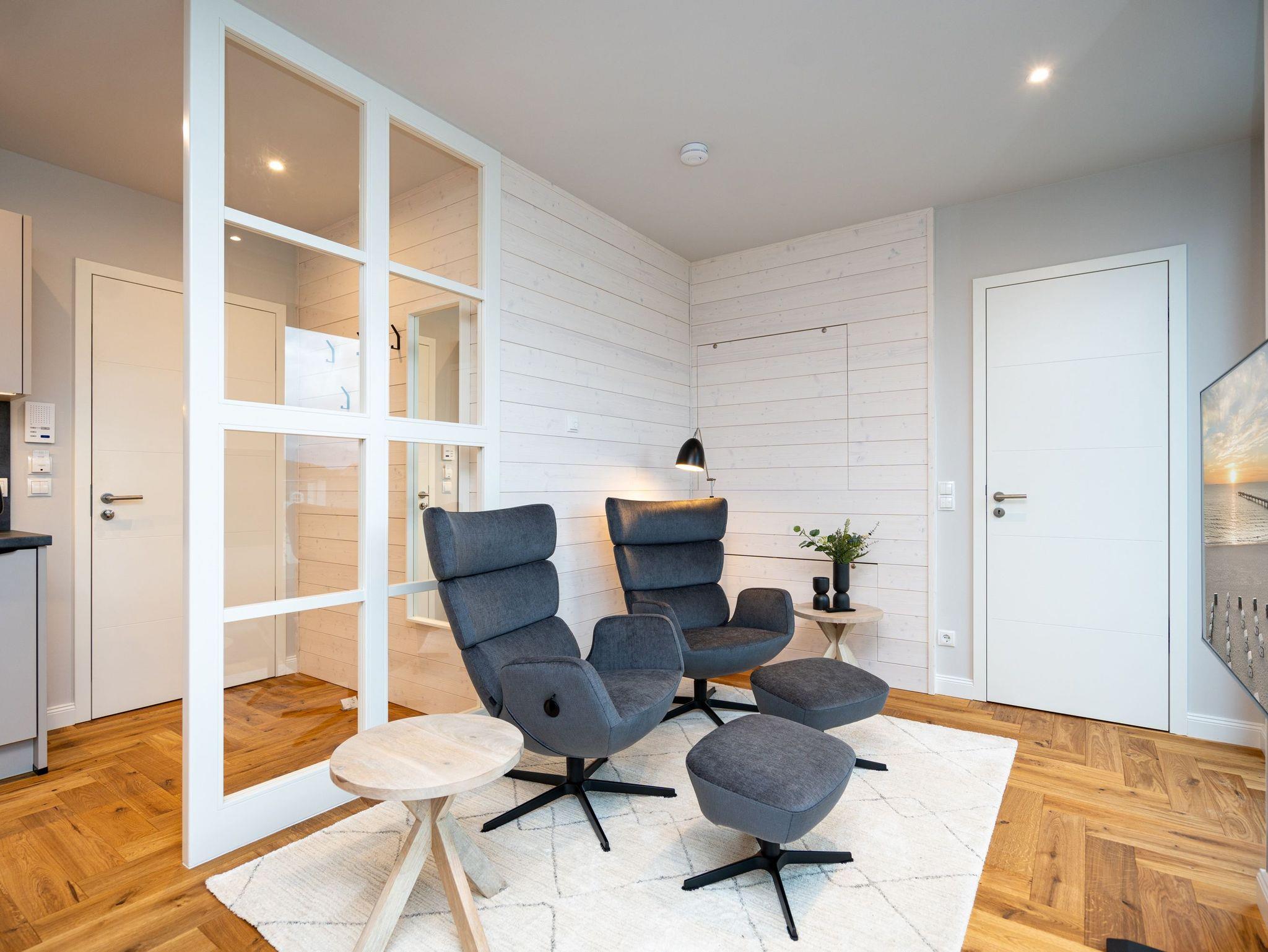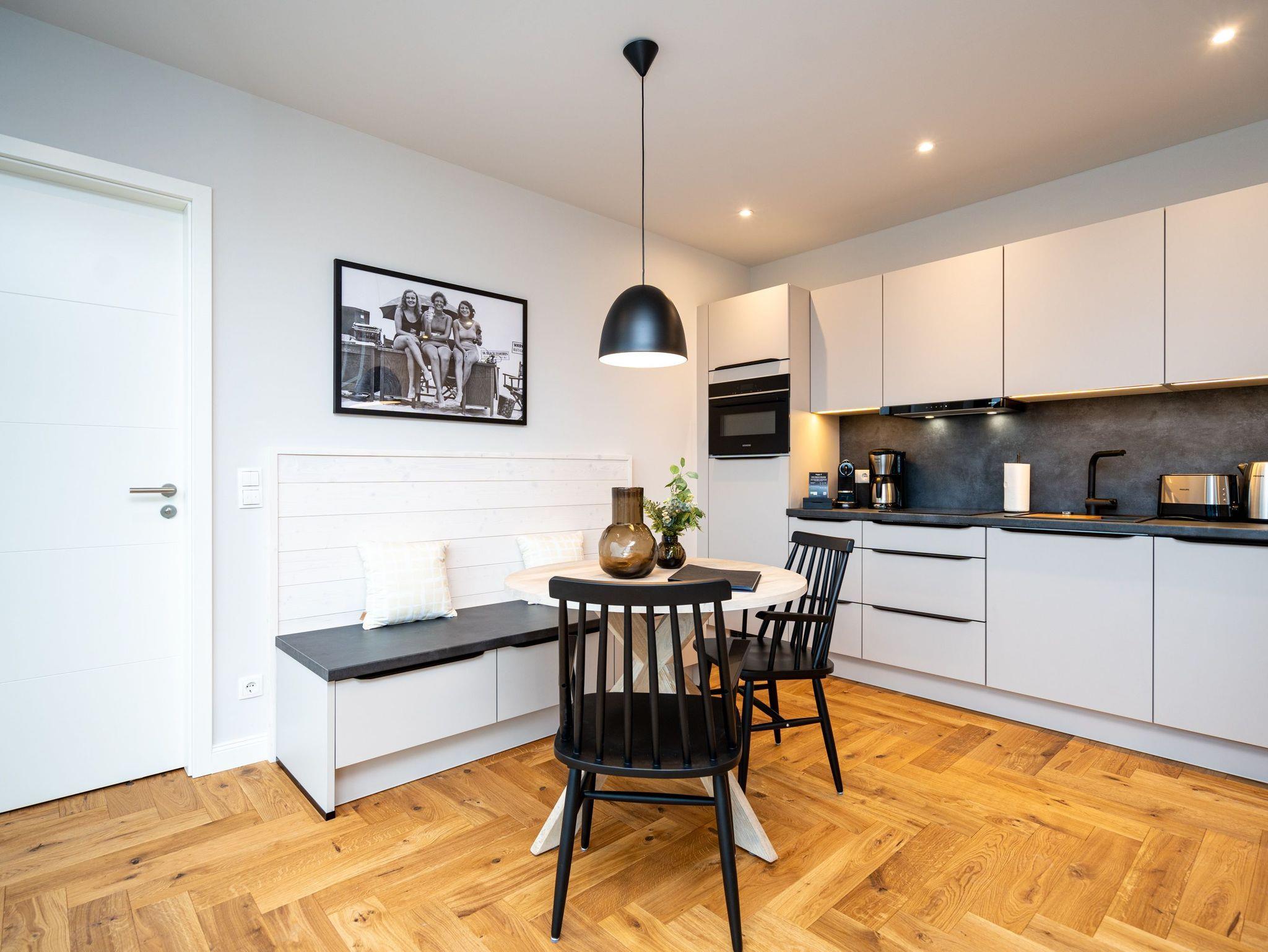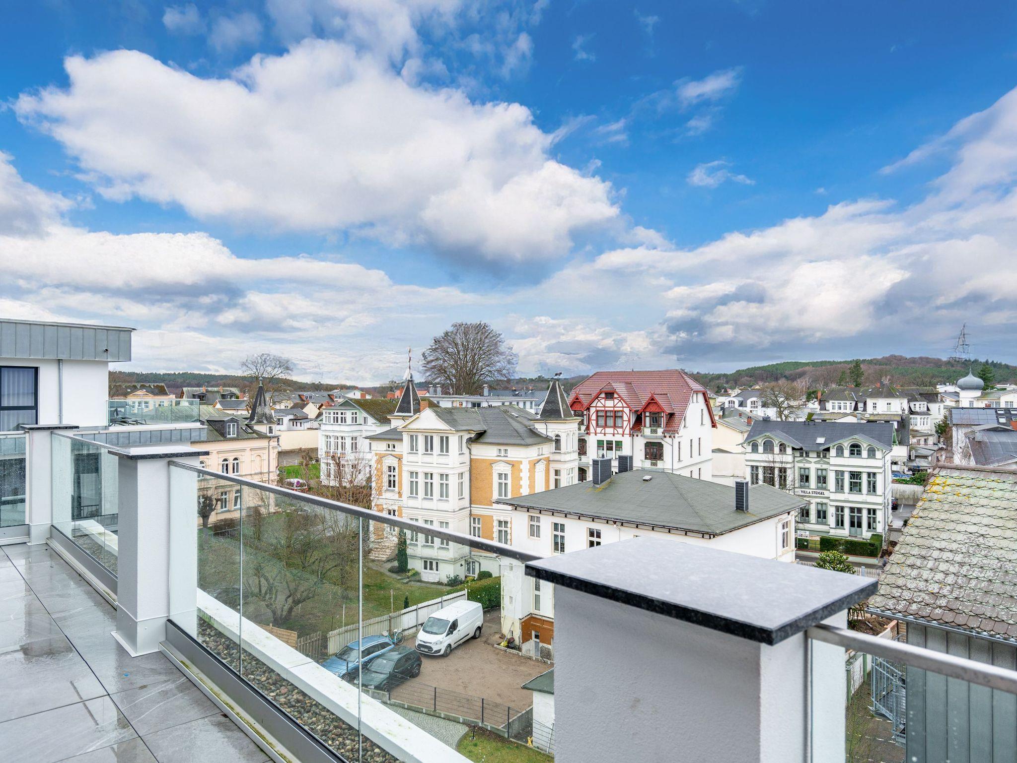 Willkommen im Penthouse-Appartement. 4.1! Dieses exklusive Appartement befindet sich im Penthouse des Hauses A auf der 4. Etage und begeistert mit einer stilvollen Einrichtung sowie einem atemberaubenden Meerblick über die Dächer von Ahlbeck. Auf 49 m² finden 2 Personen alles, was das Herz begehrt, um den Urlaub entspannt zu genießen. Der offene Wohnbereich mit edlem Echtholzparkett lädt zum Verweilen ein: Machen Sie es sich in den drehbaren Relaxsesseln bequem, die Füße entspannt auf dem Hocker, und genießen Sie Ihre Lieblingssendung auf dem 50-Zoll-Flat-TV oder lassen Sie einfach die Seele baumeln beim traumhaften Blick über die Ostsee. Die moderne Küchenzeile ist perfekt ausgestattet ? mit einem 3-Platten-Induktionsherd, Backofen mit Mikrowellenfunktion, Spülmaschine und allem, was Sie für Ihre kulinarischen Abenteuer benötigen. Der angrenzende Essbereich mit Sitzbank, Esstisch und zwei Stühlen bietet den idealen Ort für gemütliche Mahlzeiten. Das separate Schlafzimmer verspricht erholsame Nächte im komfortablen Boxspringdoppelbett (1,80 m x 2,00 m). Ein geräumiger Kleiderschrank und ein weiterer 43-Zoll-Flat-TV sorgen für zusätzlichen Komfort. Vom Wohnbereich haben Sie Zugang zur großzügigen Nord-West-Dachterrasse, wo Sie herrliche Sonnenuntergänge erleben können. Das moderne Tageslichtbad mit Dusche, Toilette und Waschtisch rundet das Angebot perfekt ab. Natürlich steht Ihnen kostenfreies WLAN zur Verfügung, und Ihr Auto parkt sicher auf dem Tiefgaragenstellplatz. Erleben Sie unvergessliche Tage an der Ostsee in dieser traumhaften Ferienwohnung ? wir freuen uns auf Sie!