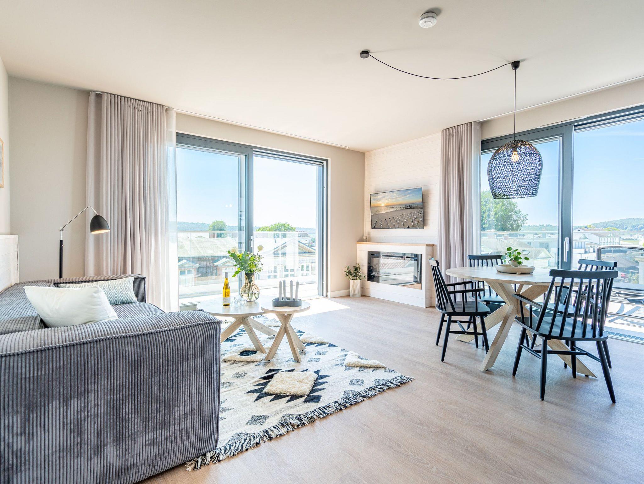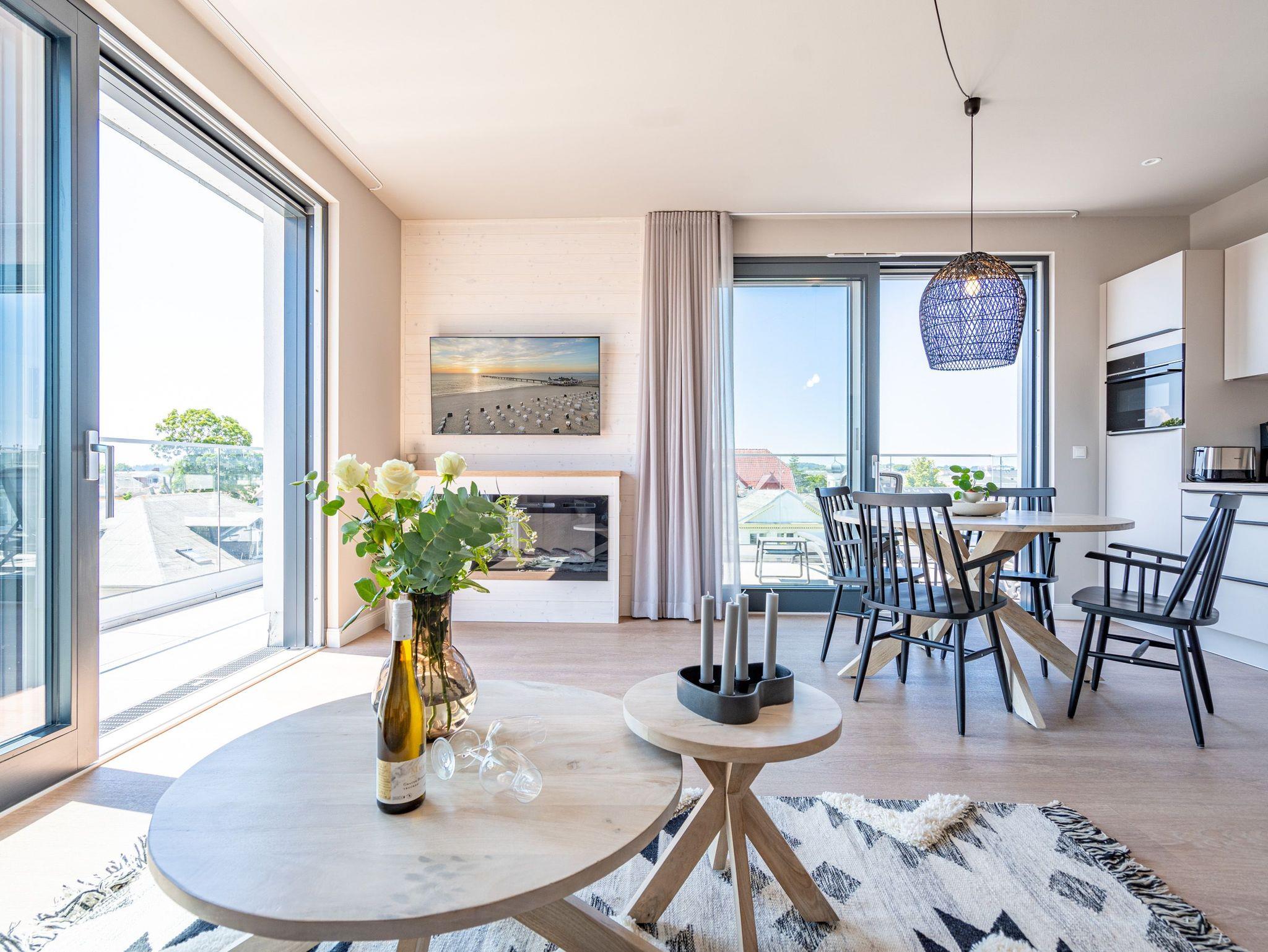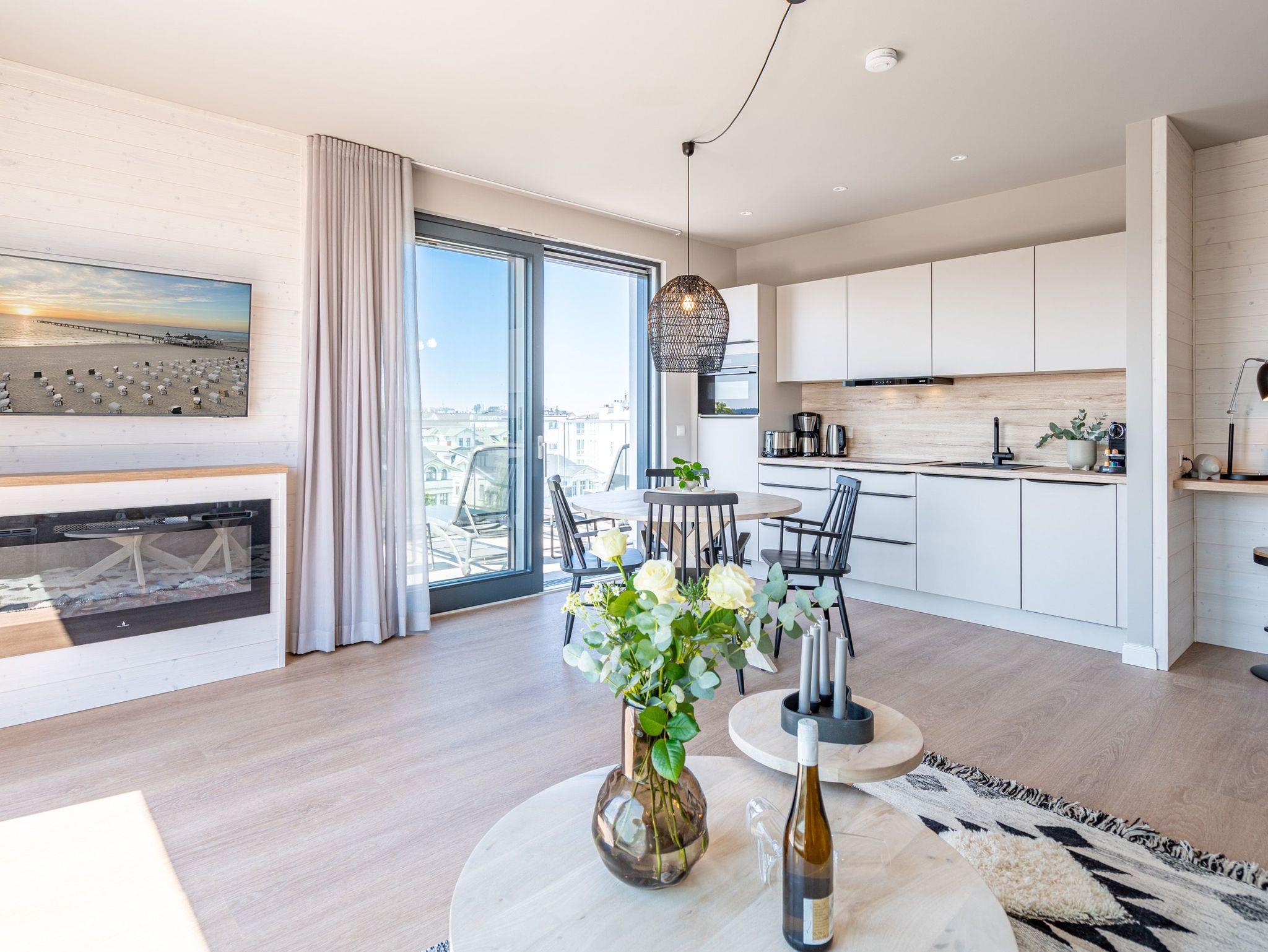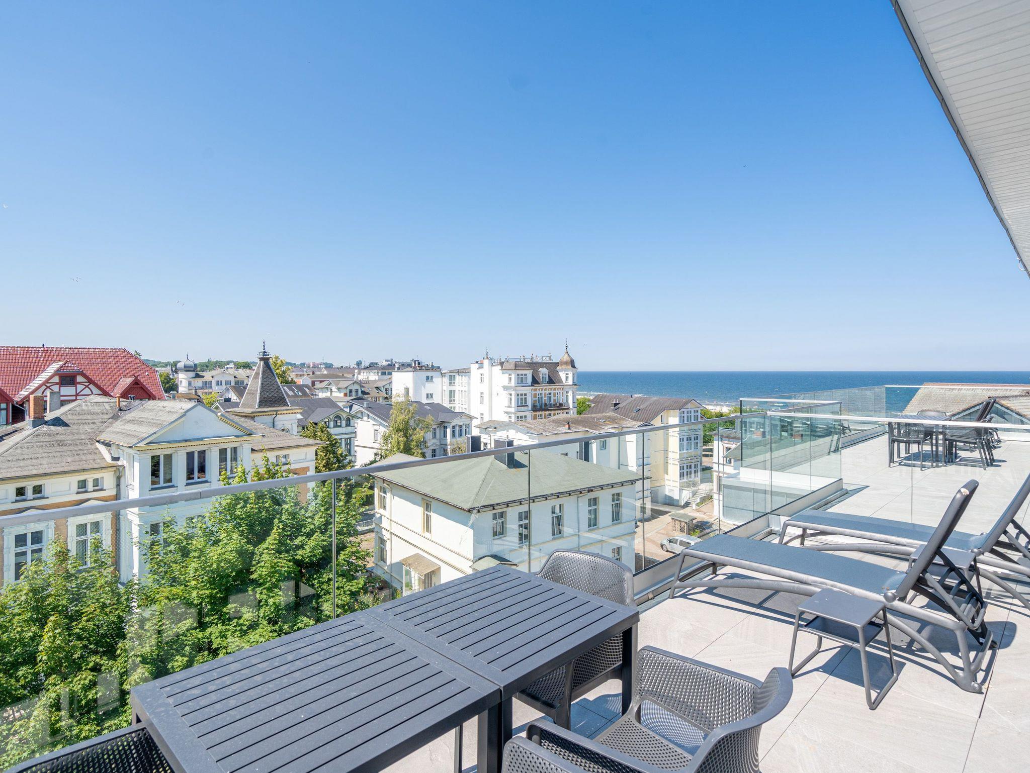 Meerblick, wohin das Auge reicht. Über den Dingen stehen und dabei eine atemberaubende Aussicht genießen, das können die bis zu zwei Gäste im 2-Raum-Appartement B 4.6 (Haus B) der Strandterrasse. In den 62 Quadratmetern in der 4. Etage finden Sie eine elegante und kuschelige Ferienwohnung vor, die die Wünsche nach Erholung und Meer aufs Trefflichste erfüllt. Erfreuen Sie sich am Blau der Ostsee vom umlaufenden Südbalkon. Ob direkt nach dem Aufstehen oder beim Sonnenbaden auf den Gartenliegen, ob beim Essen oder beim Sundowner ? hier weht Ihnen die frische Meeresbrise stets um die Nase und Ihr Blick kann bis zum Horizont über die Ostsee wandern. Die Wohnung ist äußerst großzügig und stylisch eingerichtet. Ein offenes Wohn-Esszimmer lädt zum Entspannen und kulinarischen Genuss ein. Auf dem bequemen Sofa können Sie sich dem wunderbaren Nichtstun hingeben. Ein Arbeitsplatz bietet Ihnen die Möglichkeit, auch während Ihres Aufenthalts produktiv zu sein. Lassen Sie Ihr Gedanken fließen. In dieser Wohlfühlumgebung kommen gute Ideen ganz von allein. Ein Elektrokamin (ohne Wärmeabgabe) schenkt eine heimelige Atmosphäre, während Sie auf dem 50 Zoll Flat-TV einen spannenden Film schauen, Ihre Lieblingsserie streamen oder einfach nur ein Buch lesen können. Kochen können Sie in der vollausgestatteten Küchenzeile. Die hochwertigen Siemensgeräte wie der Backofen, der 3-Platten-Induktionsherd, der Wasserkocher oder die Nespresso-Kapselmaschine machen das Kochen und Zubereiten zum Vergnügen. Ein schöner, großer Esstisch lädt zum Verweilen ein. Das komfortable Schlafzimmer ist ein herrlichen Rückzugsort, in dem Sie, Dank des bequemen Boxspringdoppelbettes (1,80m x 2,00m), wunderbar erholsame Stunden und Nächte verbringen werden. Auch hier gibt es einen Flat-TV (50Zoll). Ein geräumiger Kleiderschrank bietet viel Stauraum. Von beiden Zimmern können hinaus auf den umlaufenden Balkon treten. Der Blick reicht nicht nur über die Ostsee, sondern auch über die Dächer des Seebades bis zum Kirchturm von Ahlbeck und zum Präsidentenberg von Heringsdorf. Ein modernes Badezimmer mit Dusche, Waschtisch und WC rundet das Angebot ab und bietet Ihnen den Komfort, den Sie während Ihres Aufenthalts benötigen. Zur Wohnung gehört in der Tiefgarage ein PKW-Stellplatz. Wir wünschen Ihnen in dieser charmanten und stilvollen Ferienwohnung direkt am Meer einen unvergesslich schönen Aufenthalt.