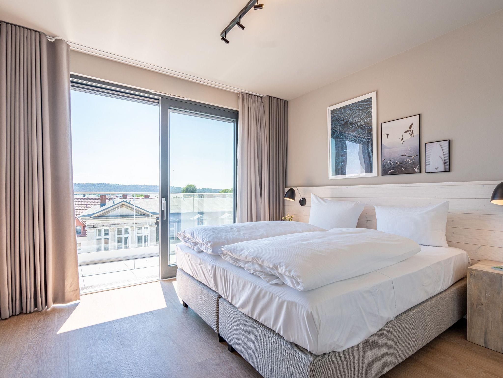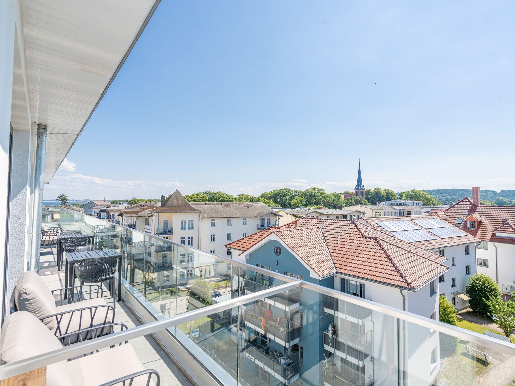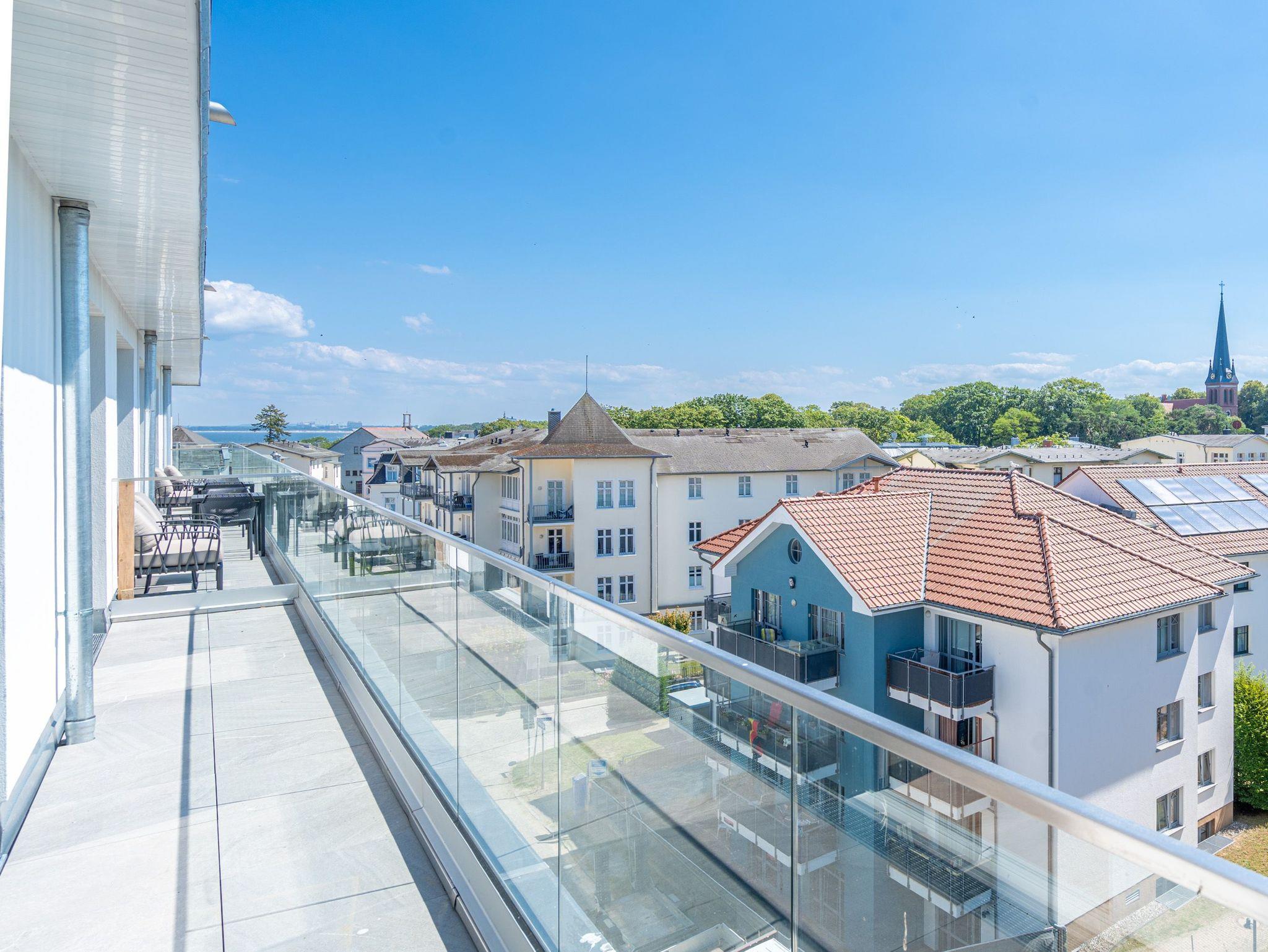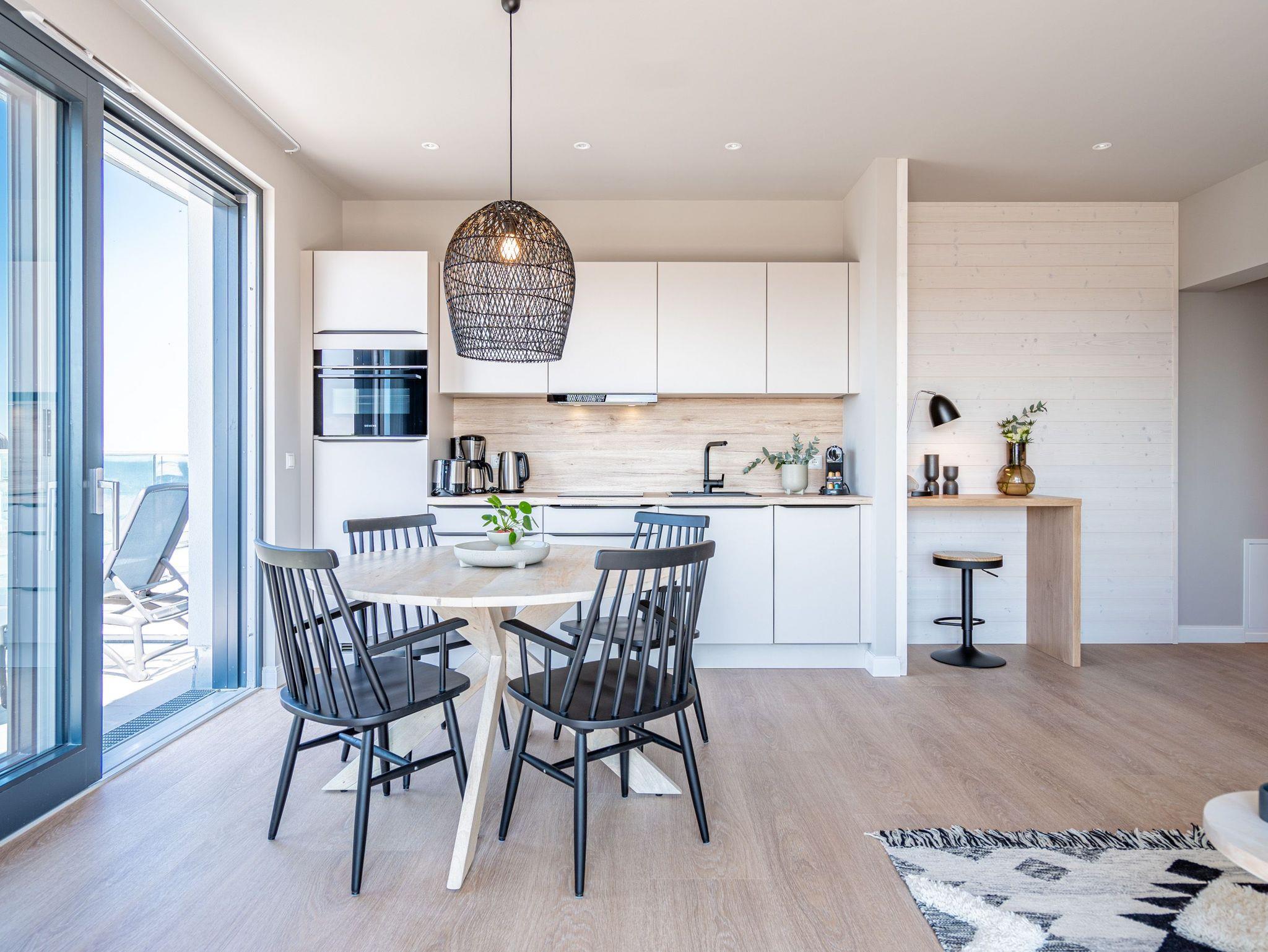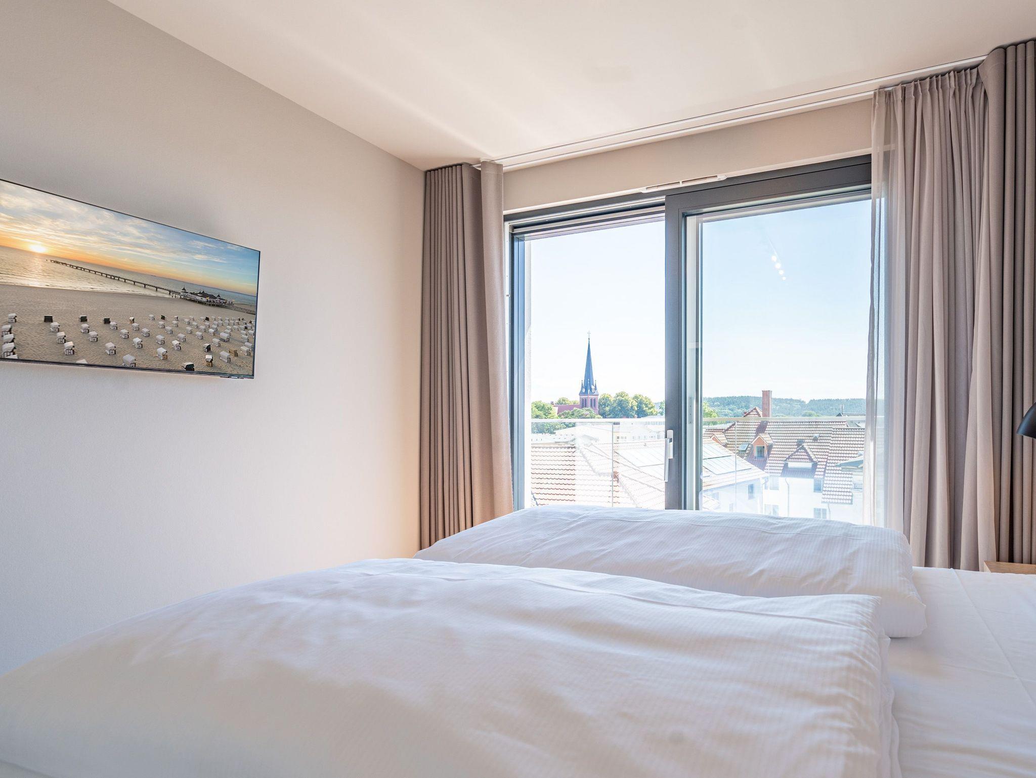 Meerblick, wohin das Auge reicht. Über den Dingen stehen und dabei eine atemberaubende Aussicht genießen, das können die bis zu zwei Gäste im 2-Raum-Appartement B 4.6 (Haus B) der Strandterrasse. In den 62 Quadratmetern in der 4. Etage finden Sie eine elegante und kuschelige Ferienwohnung vor, die die Wünsche nach Erholung und Meer aufs Trefflichste erfüllt. Erfreuen Sie sich am Blau der Ostsee vom umlaufenden Südbalkon. Ob direkt nach dem Aufstehen oder beim Sonnenbaden auf den Gartenliegen, ob beim Essen oder beim Sundowner ? hier weht Ihnen die frische Meeresbrise stets um die Nase und Ihr Blick kann bis zum Horizont über die Ostsee wandern. Die Wohnung ist äußerst großzügig und stylisch eingerichtet. Ein offenes Wohn-Esszimmer lädt zum Entspannen und kulinarischen Genuss ein. Auf dem bequemen Sofa können Sie sich dem wunderbaren Nichtstun hingeben. Ein Arbeitsplatz bietet Ihnen die Möglichkeit, auch während Ihres Aufenthalts produktiv zu sein. Lassen Sie Ihr Gedanken fließen. In dieser Wohlfühlumgebung kommen gute Ideen ganz von allein. Ein Elektrokamin (ohne Wärmeabgabe) schenkt eine heimelige Atmosphäre, während Sie auf dem 50 Zoll Flat-TV einen spannenden Film schauen, Ihre Lieblingsserie streamen oder einfach nur ein Buch lesen können. Kochen können Sie in der vollausgestatteten Küchenzeile. Die hochwertigen Siemensgeräte wie der Backofen, der 3-Platten-Induktionsherd, der Wasserkocher oder die Nespresso-Kapselmaschine machen das Kochen und Zubereiten zum Vergnügen. Ein schöner, großer Esstisch lädt zum Verweilen ein. Das komfortable Schlafzimmer ist ein herrlichen Rückzugsort, in dem Sie, Dank des bequemen Boxspringdoppelbettes (1,80m x 2,00m), wunderbar erholsame Stunden und Nächte verbringen werden. Auch hier gibt es einen Flat-TV (50Zoll). Ein geräumiger Kleiderschrank bietet viel Stauraum. Von beiden Zimmern können hinaus auf den umlaufenden Balkon treten. Der Blick reicht nicht nur über die Ostsee, sondern auch über die Dächer des Seebades bis zum Kirchturm von Ahlbeck und zum Präsidentenberg von Heringsdorf. Ein modernes Badezimmer mit Dusche, Waschtisch und WC rundet das Angebot ab und bietet Ihnen den Komfort, den Sie während Ihres Aufenthalts benötigen. Zur Wohnung gehört in der Tiefgarage ein PKW-Stellplatz. Wir wünschen Ihnen in dieser charmanten und stilvollen Ferienwohnung direkt am Meer einen unvergesslich schönen Aufenthalt.