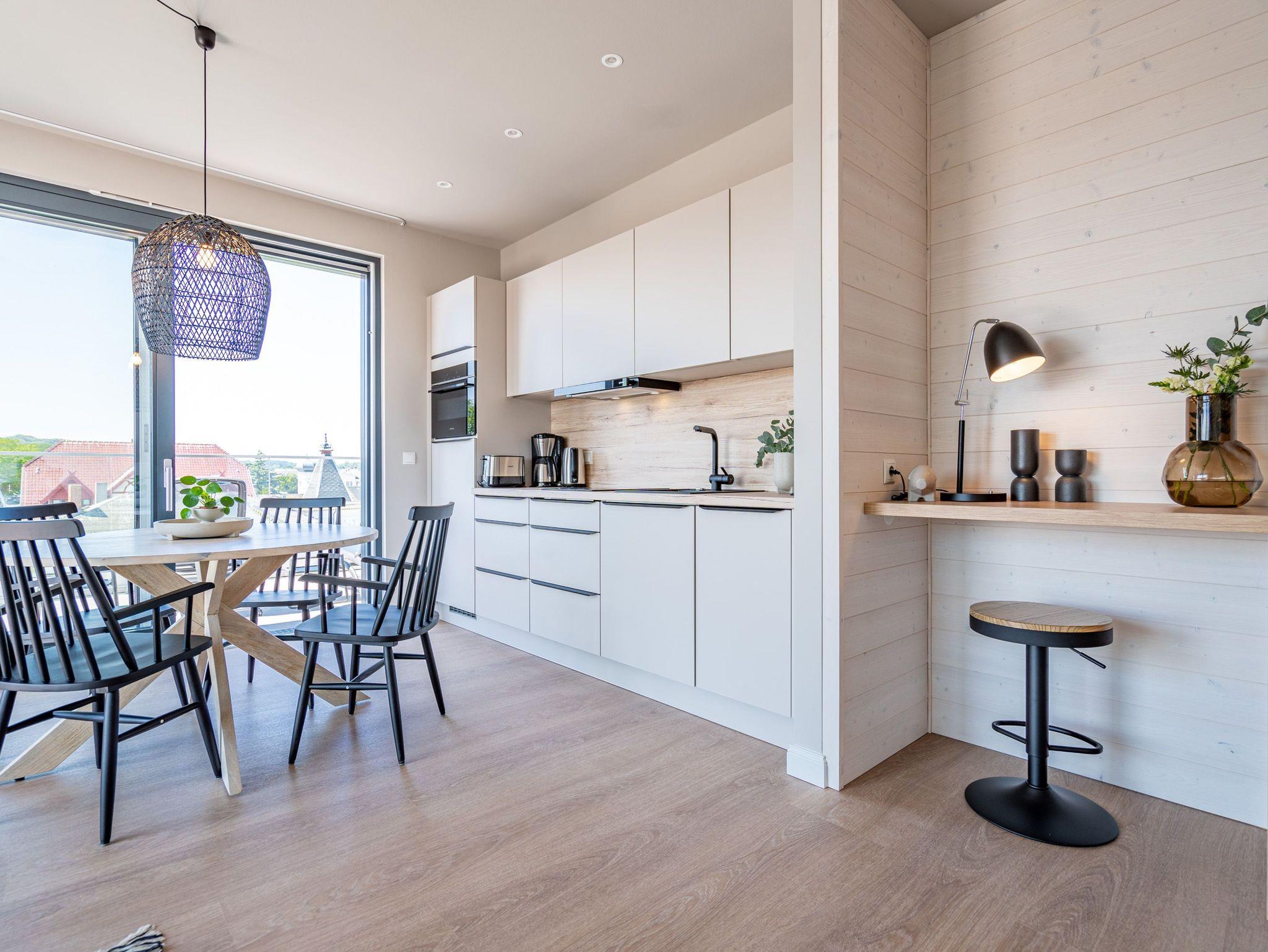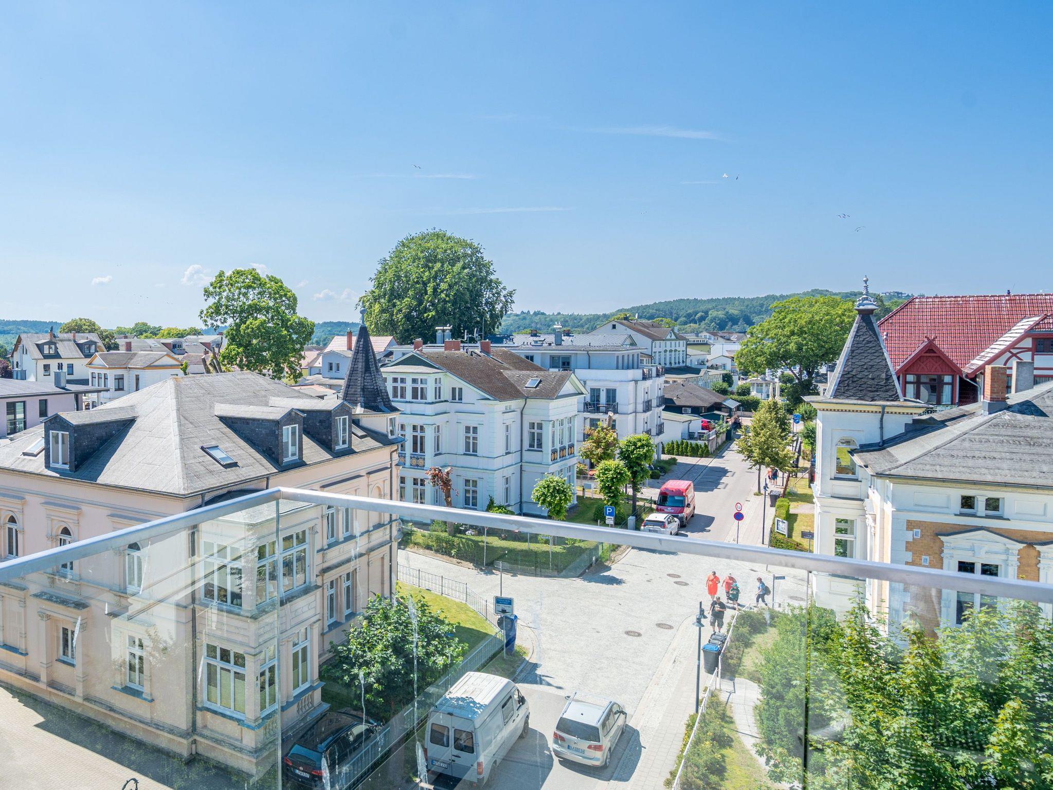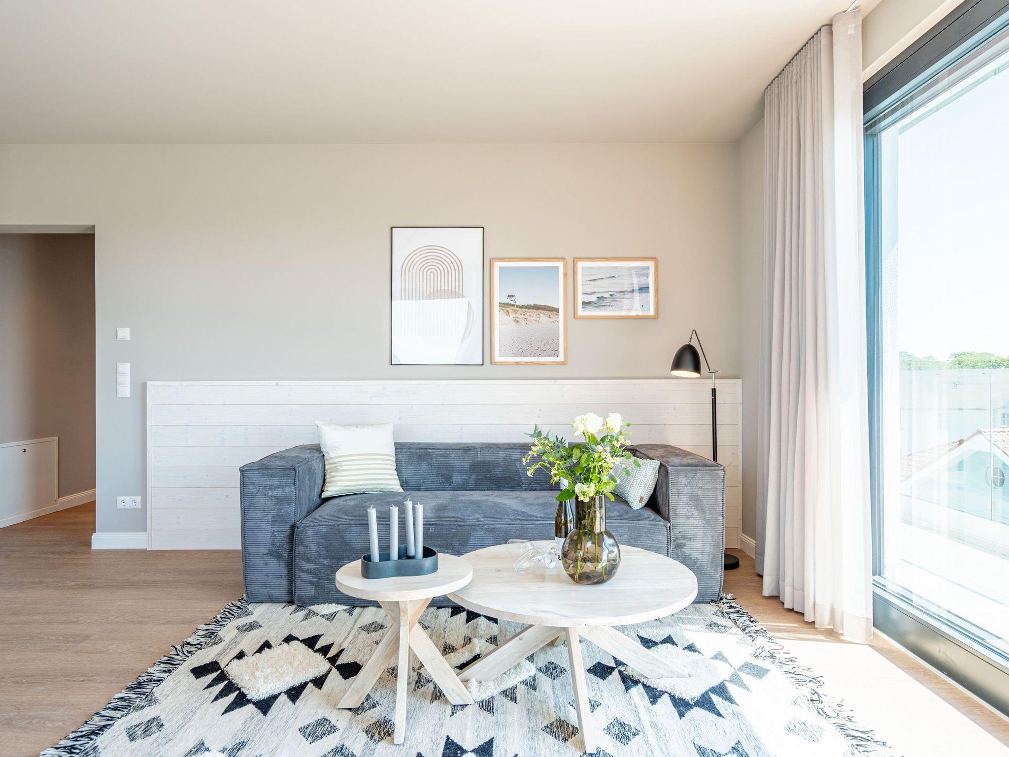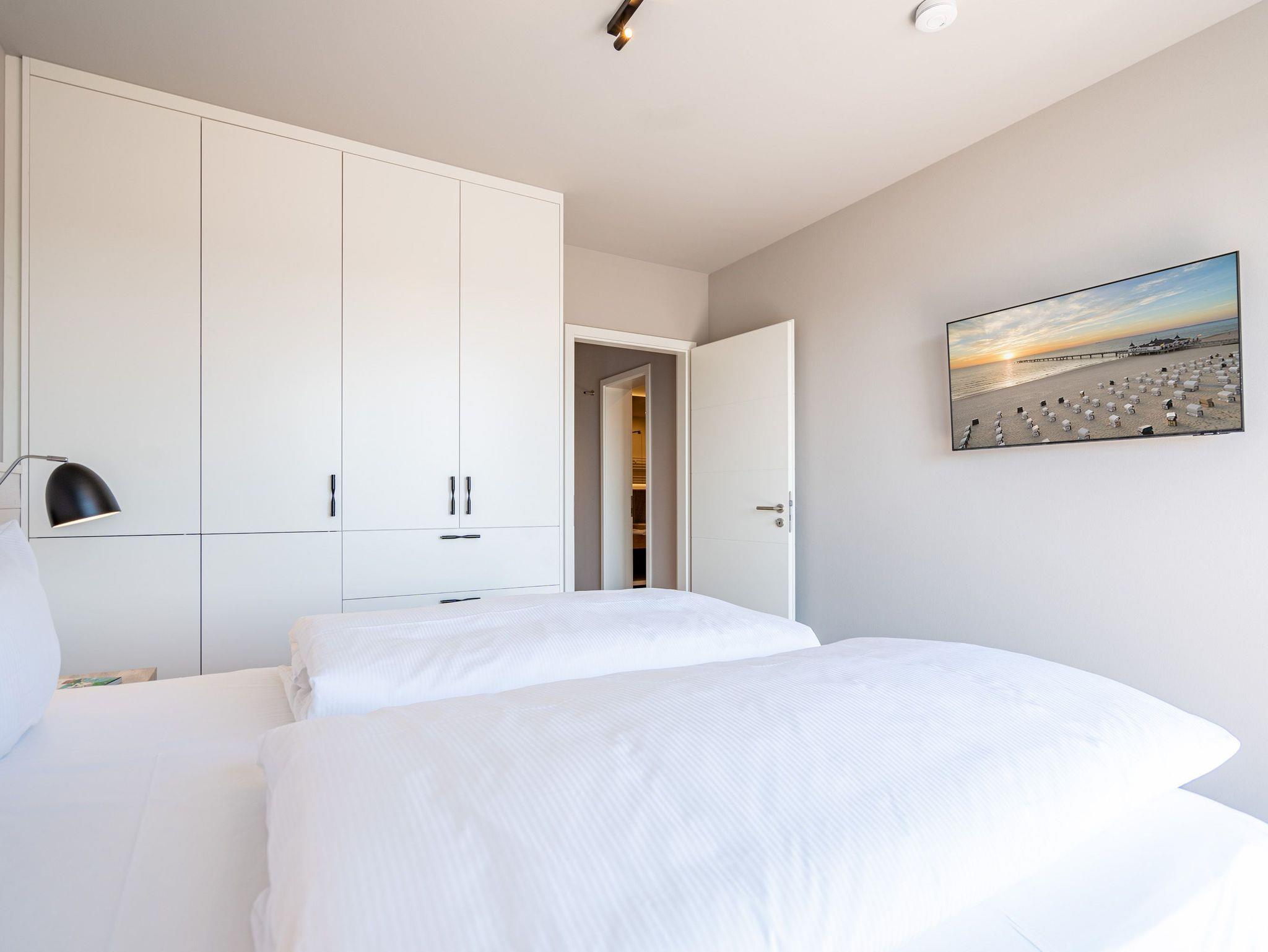 Meerblick, wohin das Auge reicht. Über den Dingen stehen und dabei eine atemberaubende Aussicht genießen, das können die bis zu zwei Gäste im 2-Raum-Appartement B 4.6 (Haus B) der Strandterrasse. In den 62 Quadratmetern in der 4. Etage finden Sie eine elegante und kuschelige Ferienwohnung vor, die die Wünsche nach Erholung und Meer aufs Trefflichste erfüllt. Erfreuen Sie sich am Blau der Ostsee vom umlaufenden Südbalkon. Ob direkt nach dem Aufstehen oder beim Sonnenbaden auf den Gartenliegen, ob beim Essen oder beim Sundowner ? hier weht Ihnen die frische Meeresbrise stets um die Nase und Ihr Blick kann bis zum Horizont über die Ostsee wandern. Die Wohnung ist äußerst großzügig und stylisch eingerichtet. Ein offenes Wohn-Esszimmer lädt zum Entspannen und kulinarischen Genuss ein. Auf dem bequemen Sofa können Sie sich dem wunderbaren Nichtstun hingeben. Ein Arbeitsplatz bietet Ihnen die Möglichkeit, auch während Ihres Aufenthalts produktiv zu sein. Lassen Sie Ihr Gedanken fließen. In dieser Wohlfühlumgebung kommen gute Ideen ganz von allein. Ein Elektrokamin (ohne Wärmeabgabe) schenkt eine heimelige Atmosphäre, während Sie auf dem 50 Zoll Flat-TV einen spannenden Film schauen, Ihre Lieblingsserie streamen oder einfach nur ein Buch lesen können. Kochen können Sie in der vollausgestatteten Küchenzeile. Die hochwertigen Siemensgeräte wie der Backofen, der 3-Platten-Induktionsherd, der Wasserkocher oder die Nespresso-Kapselmaschine machen das Kochen und Zubereiten zum Vergnügen. Ein schöner, großer Esstisch lädt zum Verweilen ein. Das komfortable Schlafzimmer ist ein herrlichen Rückzugsort, in dem Sie, Dank des bequemen Boxspringdoppelbettes (1,80m x 2,00m), wunderbar erholsame Stunden und Nächte verbringen werden. Auch hier gibt es einen Flat-TV (50Zoll). Ein geräumiger Kleiderschrank bietet viel Stauraum. Von beiden Zimmern können hinaus auf den umlaufenden Balkon treten. Der Blick reicht nicht nur über die Ostsee, sondern auch über die Dächer des Seebades bis zum Kirchturm von Ahlbeck und zum Präsidentenberg von Heringsdorf. Ein modernes Badezimmer mit Dusche, Waschtisch und WC rundet das Angebot ab und bietet Ihnen den Komfort, den Sie während Ihres Aufenthalts benötigen. Zur Wohnung gehört in der Tiefgarage ein PKW-Stellplatz. Wir wünschen Ihnen in dieser charmanten und stilvollen Ferienwohnung direkt am Meer einen unvergesslich schönen Aufenthalt.