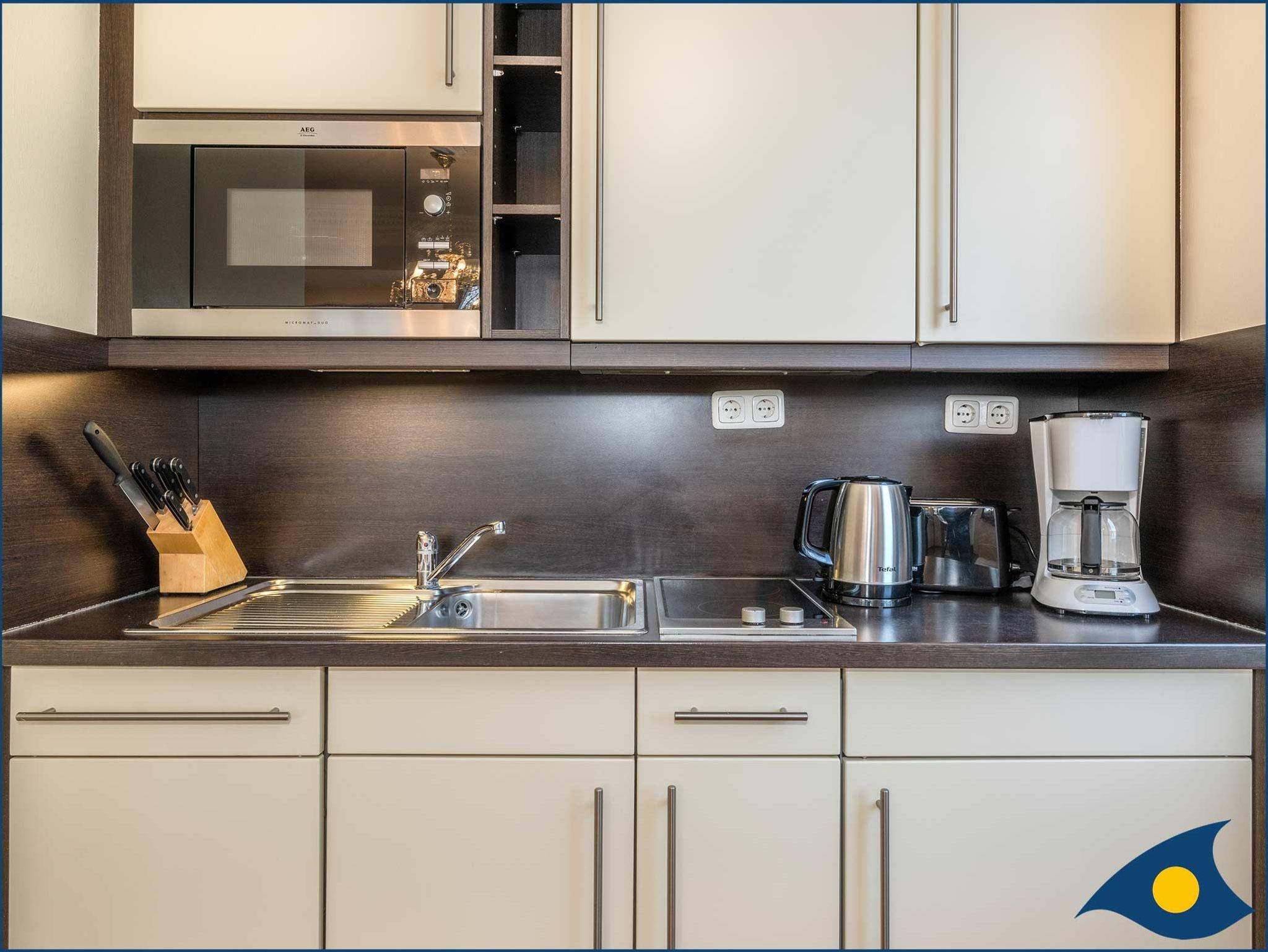 Die offene Küche ist mit einer Spülmaschine, einer Mikrowelle, einem 2 Platten-Ceranfeld und Kühlschrank ausgestattet.