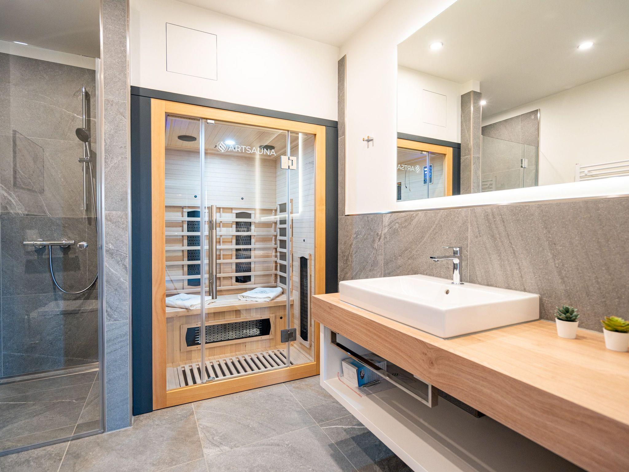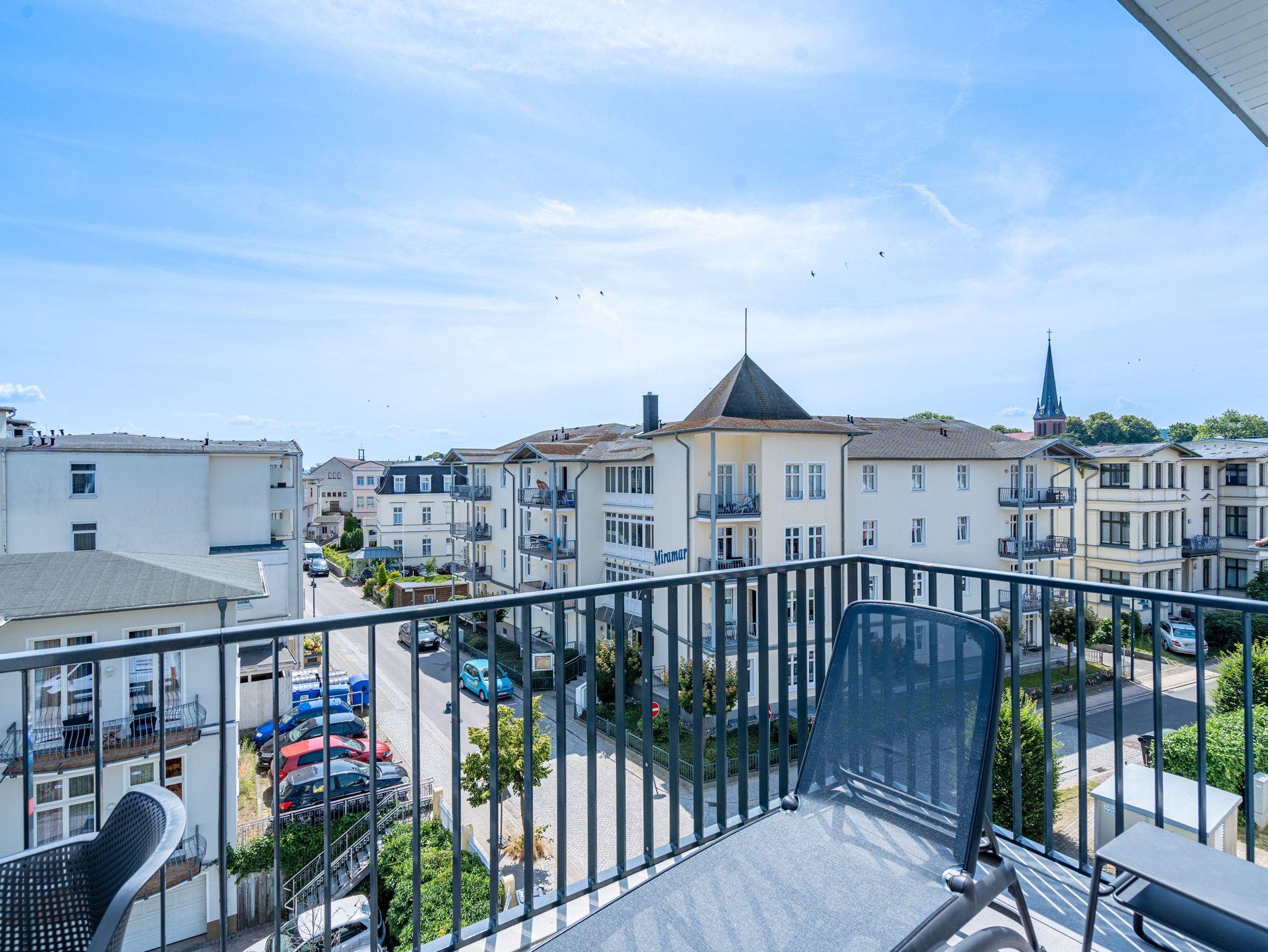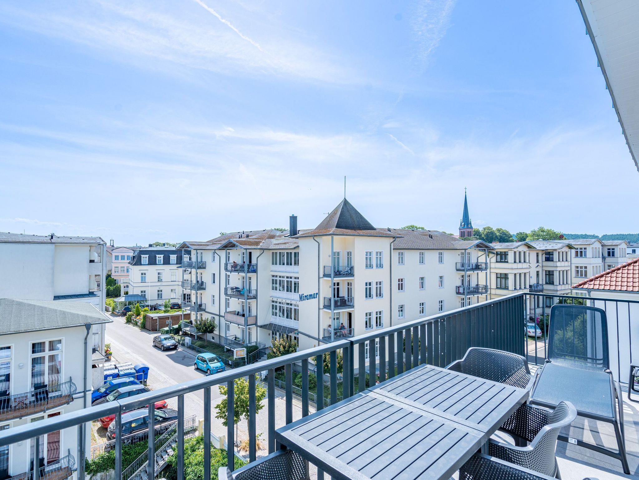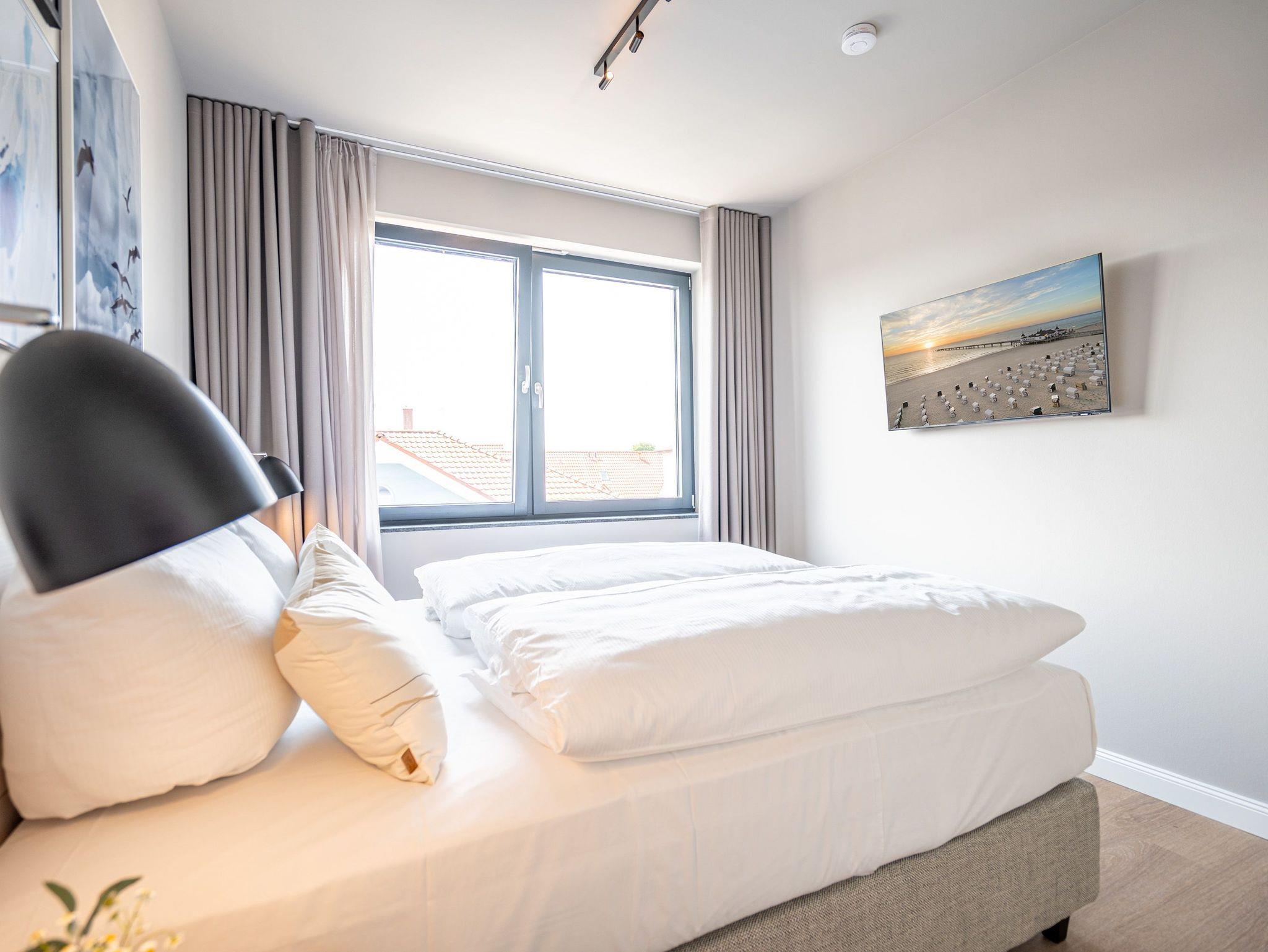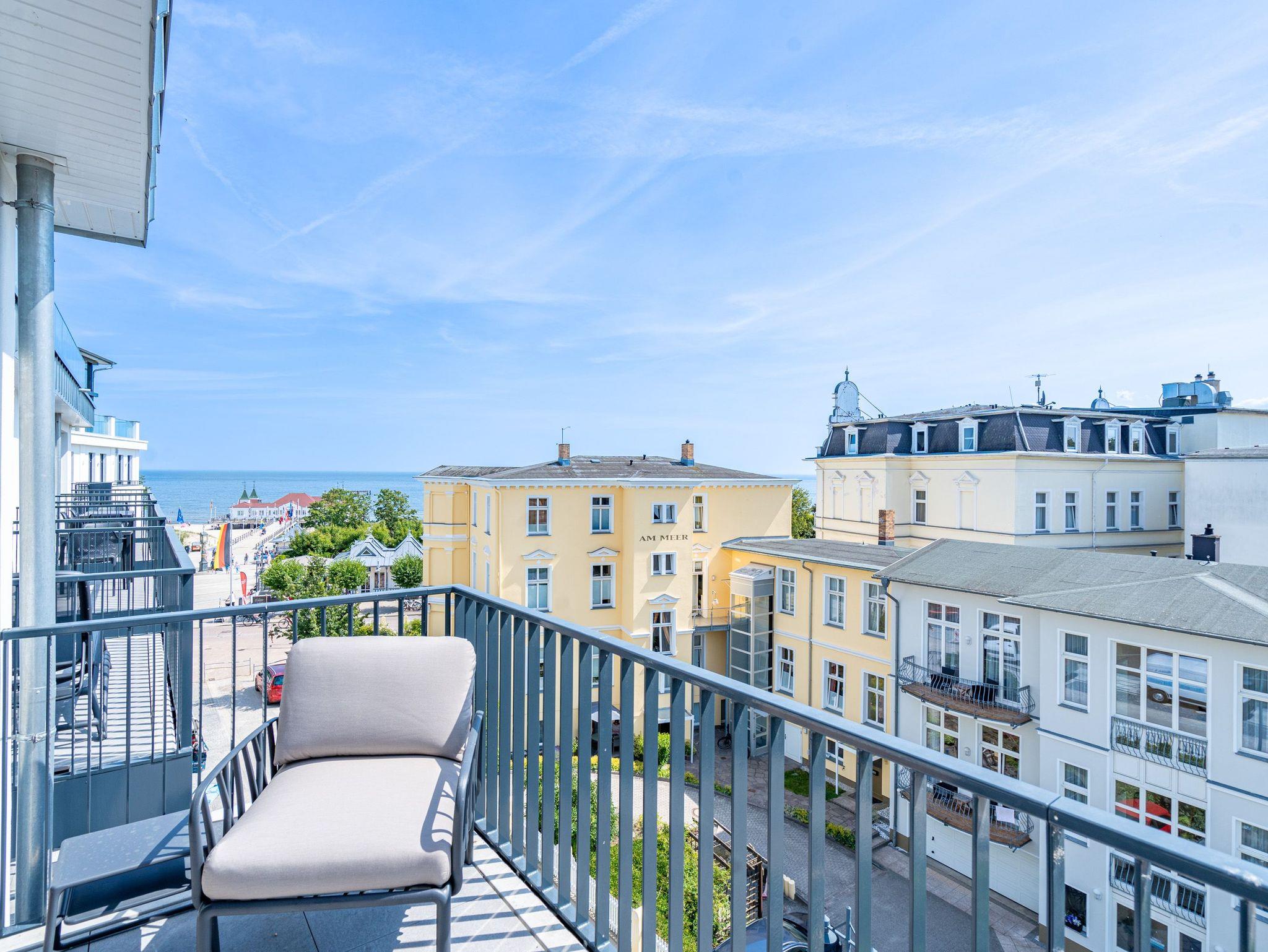 Ein herrlicher Blick auf die Ostsee und die Ahlbecker Seebrücke erwartet Sie in der stilvollen 3-Raum-Wohnung B 3.4 (Haus B) in der 3. Etage der Strandterrasse direkt an der Ahlbecker Promenade. 88 großzügige und mit viel Liebe eingerichtete Quadratmeter sind ein ideales Urlaubsparadies für 4 Personen und ein Kleinkind im Kinderreisebett. Runterkommen, abschalten und rundum wohlfühlen ? das schicke Designkonzept dieses Appartements macht es leicht, den Stress und die Arbeit zu vergessen. Ja, manchmal sogar die Zeit. Wenn beispielsweise man am schönen Esstisch ins Plaudern kommt oder auf dem Sofa oder dem Sessel entspannt. Ein Elektrokamin (ohne Wärmeabgabe) sorgt für eine heimelige Atmosphäre, während der große Flat-TV (50) das Kinogefühl weckt. Das Zubereiten der Mahlzeiten wird in der offenen Küche ein Kinderspiel, denn sie ist mit allen nötigen Elektrogeräten aufs Beste ausgestattet. Zum Inventar zählen ein Backofen, ein 4-Platten-Induktionsherd, ein Geschirrspüler, Toaster, Kaffeemaschine und eine Nespresso-Kapselmaschine. Treten Sie hinaus auf den Ost-Balkon und genießen Sie die frische Ostseebrise. Kommen Sie ins Träumen beim Blick auf das endlose Blau bis zum Horizont. Hier werden die Momente zu unvergesslichen Erlebnissen. Die Wohnung besitzt zwei Schlafzimmer. Eines davon hat ebenfalls einen Zugang zum Balkon. Beide Zimmer sind gleichermaßen mit einem komfortablen Boxspringdoppelbett (1,80m x 2,00m), einem Kleiderschrank und einem Flat-TV (43 Zoll) ausgestattet. Auch zwei Bäder mit Dusche, Waschtisch und WC gibt es in der Wohnung. Für absolute Entspannung in kuschlig warmer Umgebung sorgt eine Infrarotsaunakabine in einem Badezimmer. Ihr Auto können Sie bequem in der Tiefgarage abstellen. Ihrem Aufenthalt in einem charmanten Urlaubszuhause mit Meerblick steht also nichts mehr im Weg.