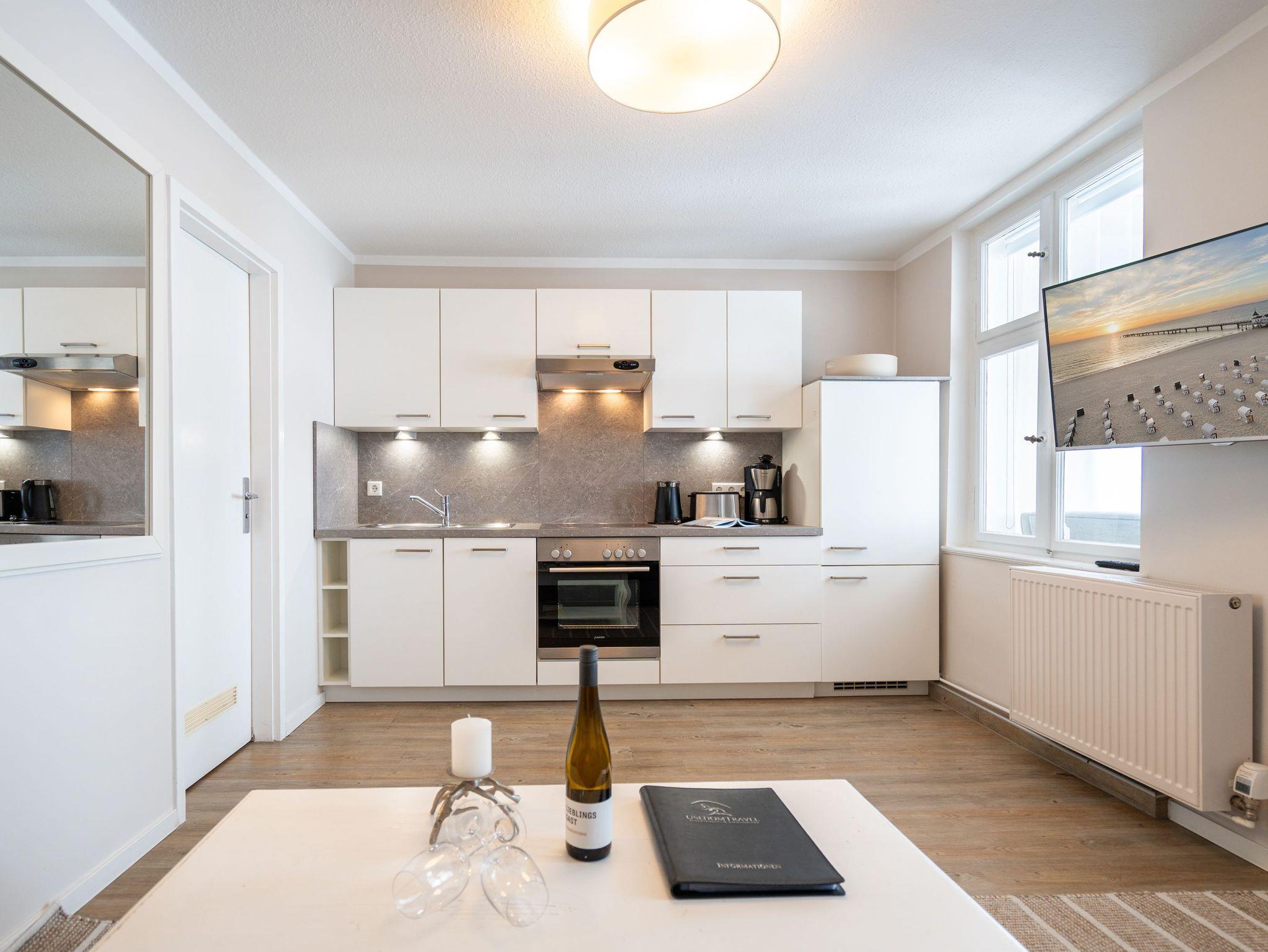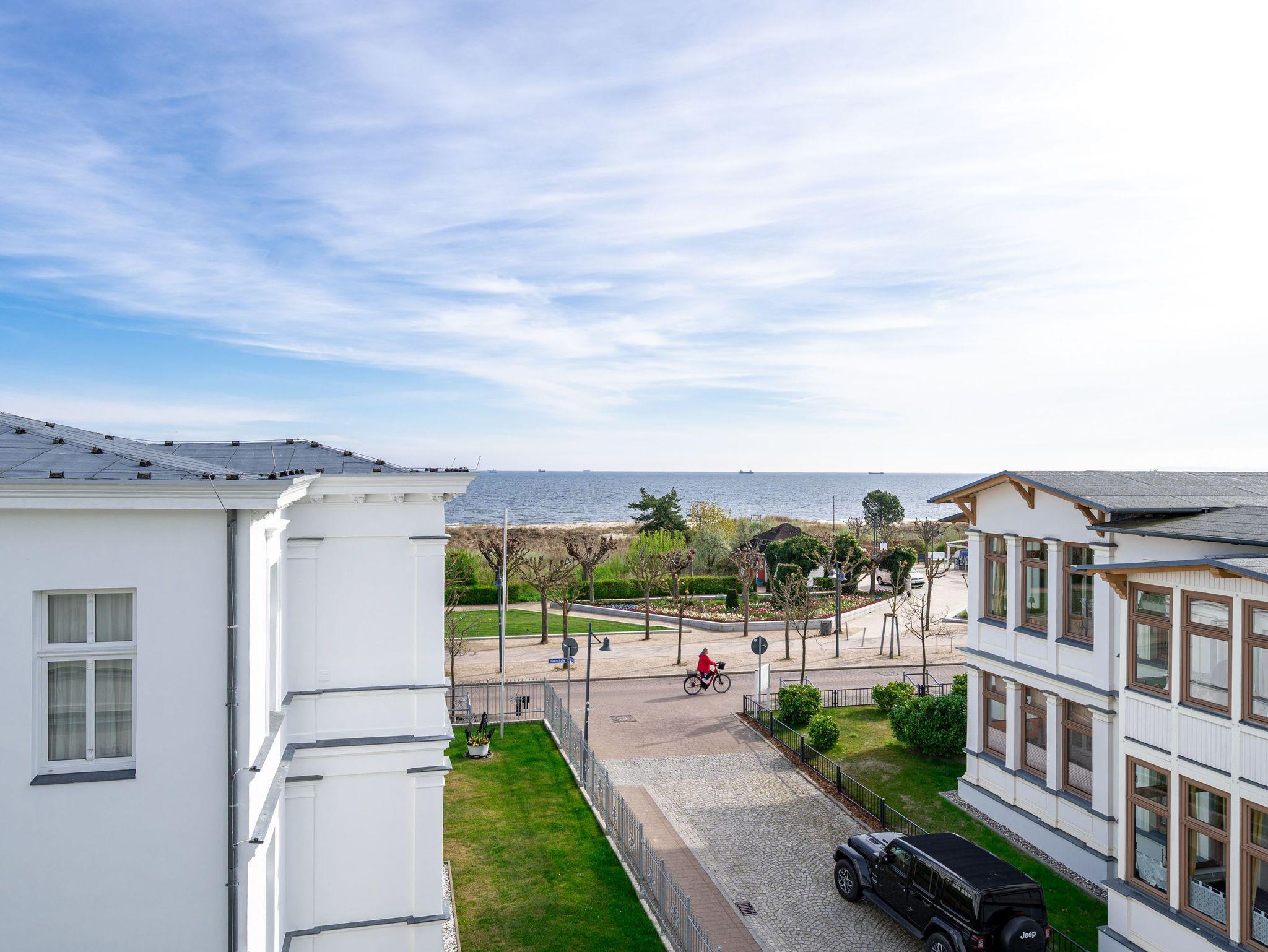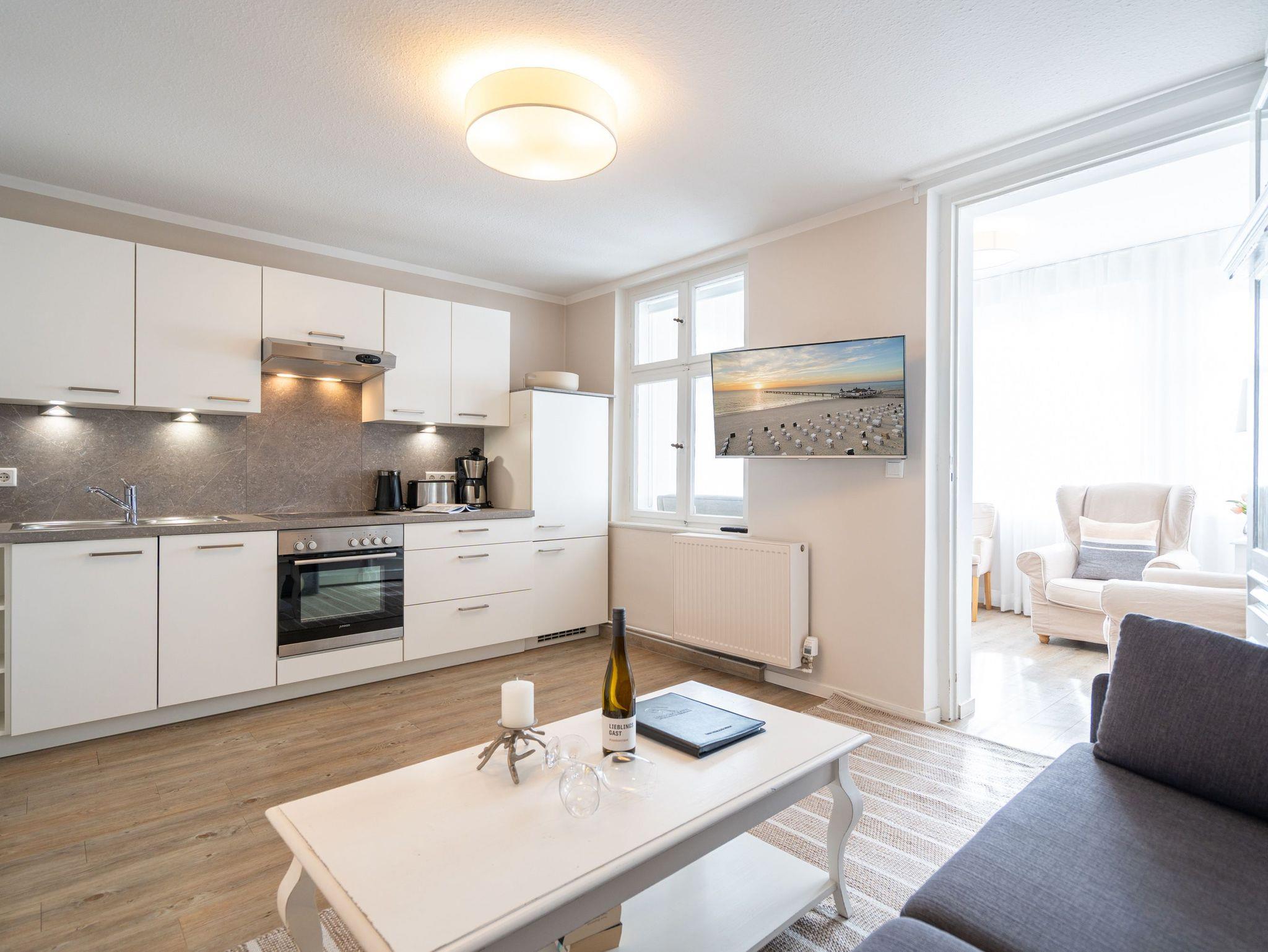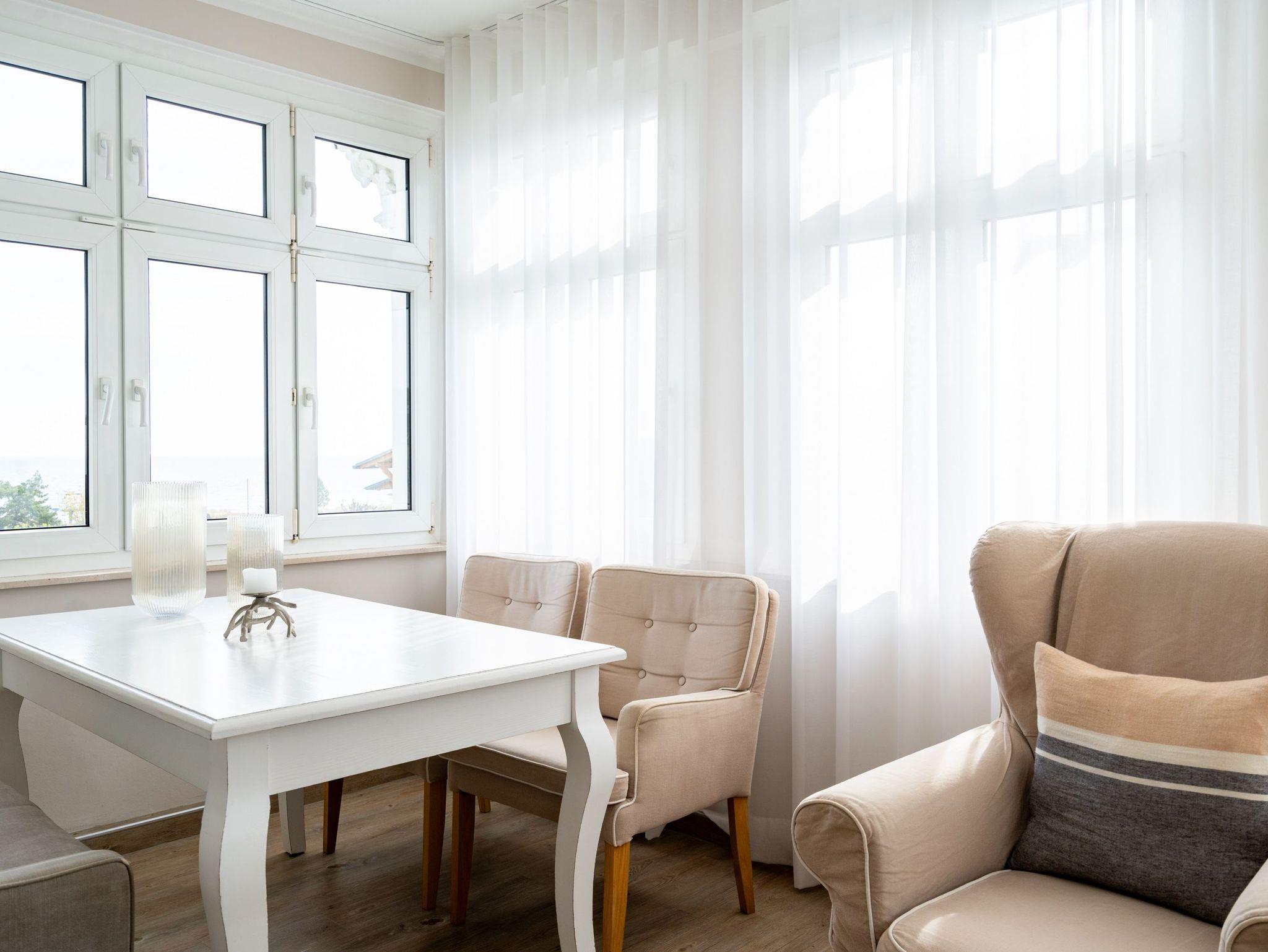 Ein toller Meerblick und eine wunderschön gestaltete 2-Raum-Ferienwohnung (44 qm) versprechen Urlaubsfreude in der Villa Albertine für 2-4 Personen inkl. 1 Kleinkind (bis 3 Jahre im Kinderreisebett). Nach dem Eingangsbereich empfängt Sie ein gemütlicher Wohnbereich mit Schlafsofa (als Aufbettungsmöglichkeit für die 3. Person), Flat-TV und komplett ausgestatteter Küchenzeile. In der verglasten Veranda genießt man den Blick auf die Ostsee, ein schöner Essplatz und zwei gemütliche Ohrensessel laden zum Lesen, TV schauen oder Entspannen ein. Im Schlafzimmer sorgt ein bequemes Doppelboxspringbett (1,80m x 2,00m ) für Schlafkomfort, auch ein Kinderreisebett findet hier Platz. Ergänzt wird das Appartement durch ein Badezimmer mit Dusche und WC. Ein Pkw-Stellplatz Nr. 13 befindet sich in der Tiefgarage direkt auf dem Grundstück.